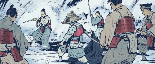 Le seigneur Yuu y envoya ses hommes par dizaines dans l’espoir de tuer le redoutable guerrier. Pour un homme ordinaire, nul doute que l’histoire se serait arrêtée là. Mais Tatuso combattit avec bravoure les dizaines de soldats qui se dressaient contre lui. Ils tombaient un à un an, souillant de leur sang la neige au sol. Puis il ne resta plus qu’une poignée de combattants. Tatsuo était replié au bord d’une falaise, exténué. Il se défit de ces derniers opposants. Mais la fatigue et les blessures eurent raison de ses réflexes. L’un d’eux, avant de tomber sous sa lame, lui trancha la jambe droite. Takeshi Tatsuo avait vaincu l’armée envoyée pour le tuer, malgré la perte d’un membre. Il tomba dans la neige, se laissant mourir, dans l’honneur. L’histoire veut que Takeshi Tatsuo n’ait pas survécu. Mais dans les montagnes vivait une femme accusée de sorcellerie du nom de Kitsune. Elle ramassa le corps sans vie du brave guerrier et l’amena dans son domicile.