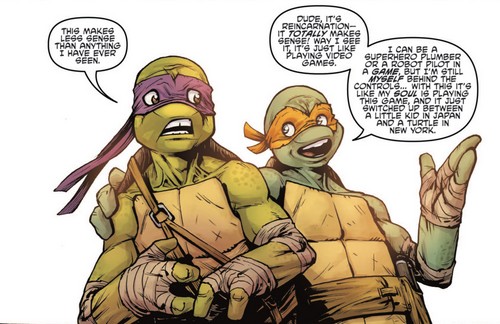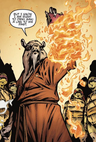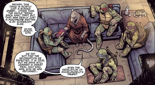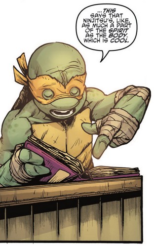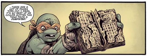 Quelques jours plus tard, Michelangelo poursuivait la lecture du livre dans leur repaire. Ils savaient à présent comment Takeshi Tatsuo était revenu à la vie en tant qu’Oroku Saki. Mais ils n’avaient pas l’information la plus importante. Pouvaient-ils se débarrasser de lui ? Ou était-il bien immortel ? Des pages manquaient au livre.