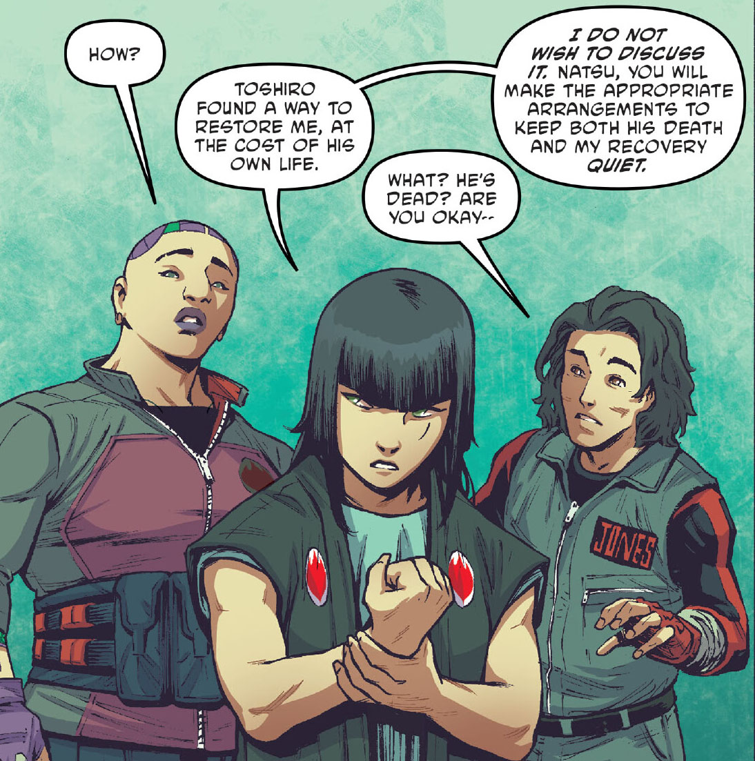 L’homme entrait dans la chambre de Karai, qui poussait quelques gémissements. Il avait étudié de nombreux textes anciens de Shredder et avait acquis une solide connaissance dans bien des matières, dont celle de la guérison. Effectuant quelques gestes, un halo lumineux sortait de son corps et s’emparait de la convalescente. En quelques instants, Karai était en mesure de se relever. Ses blessures avaient toutes disparues. Elle remerciait Toshiro, mais n’avait pas prêté attention au vieil homme, qui s’était écroulé au sol. Dans ses derniers mots, il avertissait la cheffe du Foot Clan du danger qu’elle encourait. Une grande épreuve était à venir. Plus grande encore que celles qu’avait pu subir Oroku Saki de son temps. Son destin à présent était de refaçonner le clan. Il décédait dans ses bras.