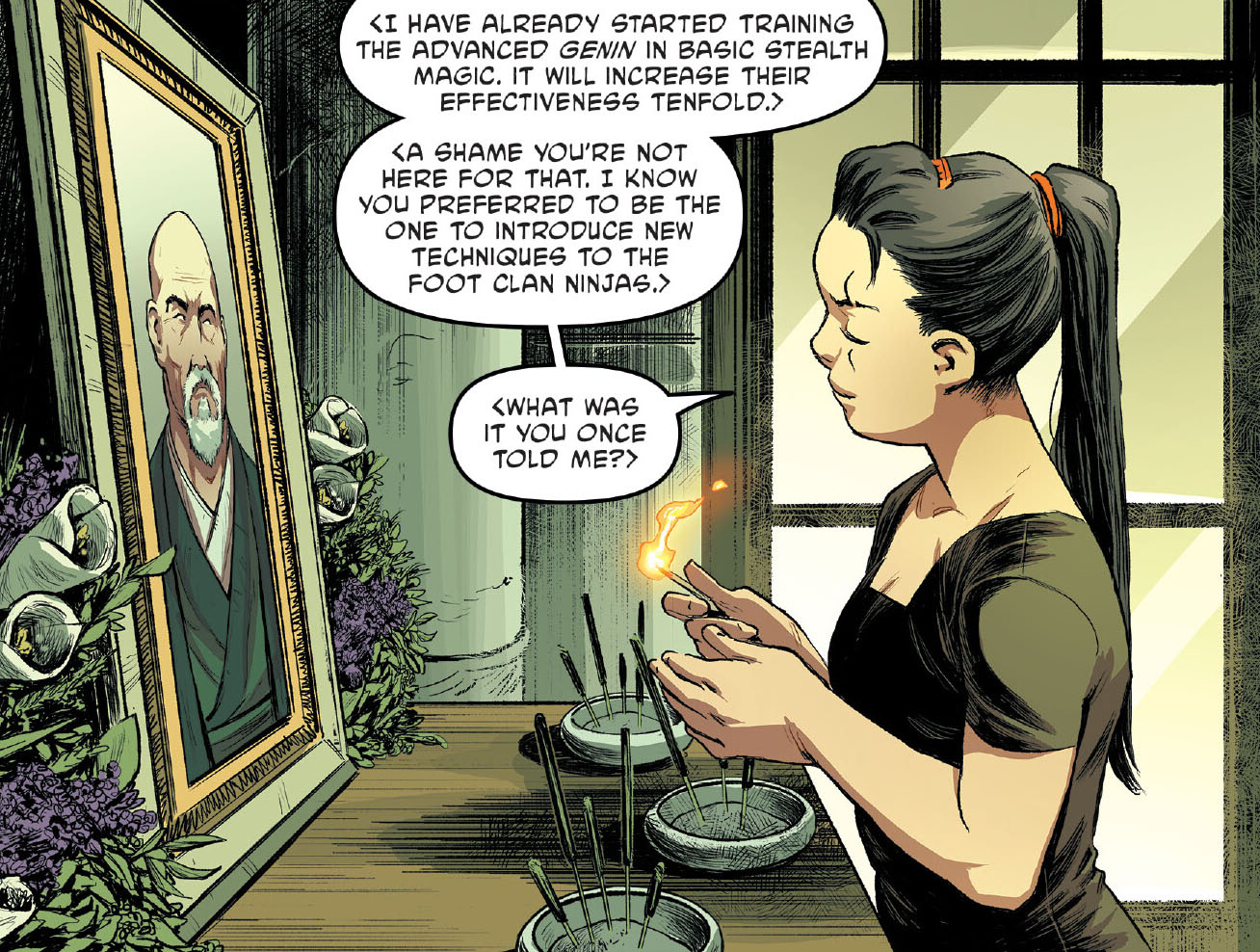 De retour dans le quartier général du Foot Clan, Karai se recueillait sur un petit autel destiné à la mémoire de Toshiro. L’homme n’avait pas eu de sépulture et son âme s’en était allée pour de bon (The untold destiny of the Foot Clan #3). Son ancien élève tenait malgré tout à lui rendre un dernier hommage sur son épitaphe, le remerciant pour tout l’apprentissage qu’il lui avait dispensé. Elle regrettait qu’il ne soit pas présent pour voir l’évolution du clan. Les ninjas les plus expérimentés commençaient à apprendre à se déplacer en toute discrétion grâce à la magie. En revanche, elle n’apprendrait rien d’autre à ses recrues. La femme sortait de son sac le parchemin que Saki lui avait confié. Elle le brûlait. Les autres connaissances du Foot Clan demeureraient dans son esprit avant d’être perdues à tout jamais. Karai regrettait simplement que ces connaissances soient parvenues aux membres du Splinter Clan. Un jour, son clan devra régler cette question. Mais avant cela, Karai devait s’assurer de faire croître son propre clan.