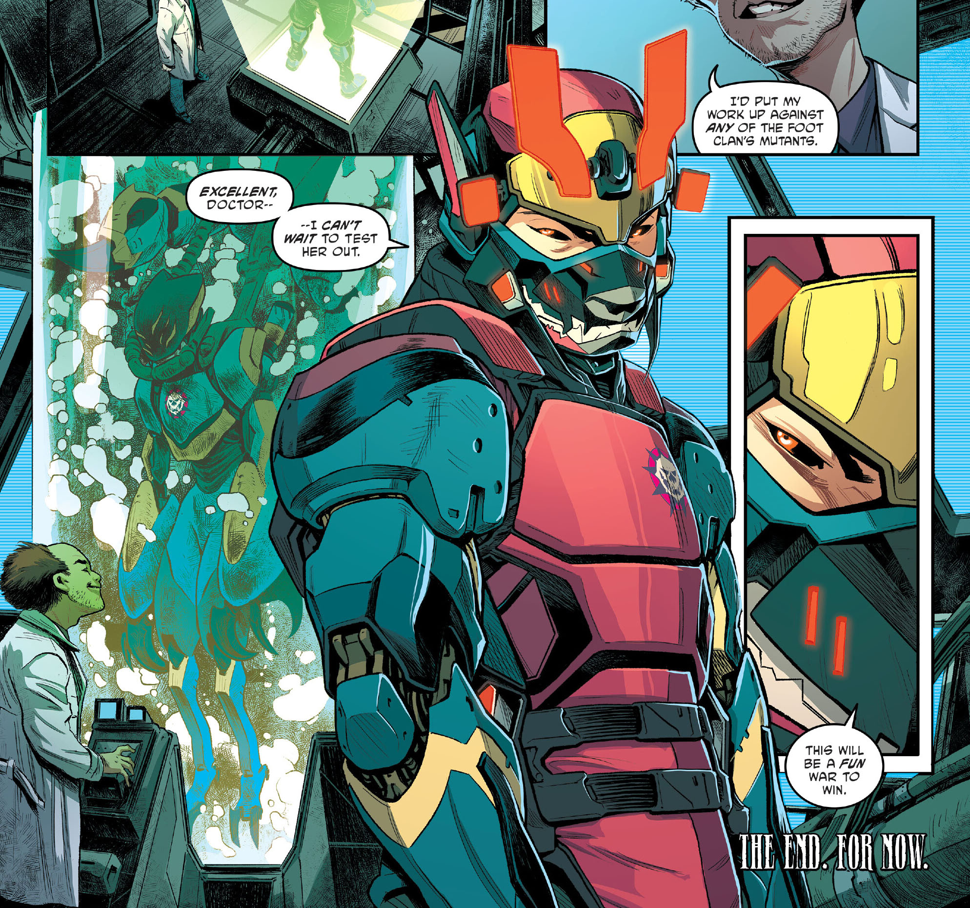 sur ses expérimentations. L’homme avait reçu un nouveau spécimen sur lequel travailler. Il avait apporté quelques modifications à son corps, mais aussi à son comportement pour s’assurer qu’il reste loyal à Chen. Il serait d’ailleurs ravi de poursuivre son travail sur d’autres mutants du Foot Clan. Devant eux se trouvait un bocal de stase contenant Zodi. La femme scorpion avait été très largement modifiée, revêtant à présent un corps en grande partie robotique. Chen se préparait à la guerre…