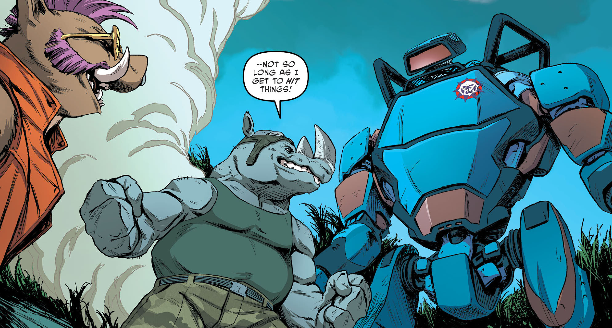 Les humains améliorés, tout de métal vêtus se tenaient prêts à (presque) toute éventualité. Le capitaine de l’escouade envoyait les siens neutraliser Casey. S’approchant du justicier, il essuyait un violant coup de batte qui faisait voler son masque, laissant apparaître une mâchoire et un œil robotiques. Le jeune homme était lui-même très surpris par ce qu’il venait d’accomplir et regardait son arme hébété. Bientôt, les autres soldats fondaient sur le Foot Clan, qui les repoussait avec grande facilité. Le capitaine était surpris de voir ses si puissants hommes se faire neutraliser aussi rapidement. Dans son dos, un puissant souffle balayait son attitude droite et solide. Il s’agissait de la carcasse de la sentinelle de métal. Bebop et Rocksteady venaient d’en finir avec elle et réclamaient déjà autre chose à se mettre sous le poing. Le rhinocéros sautait sur l’individu et le plaquait au sol, l’aplatissant de tout son poids.
