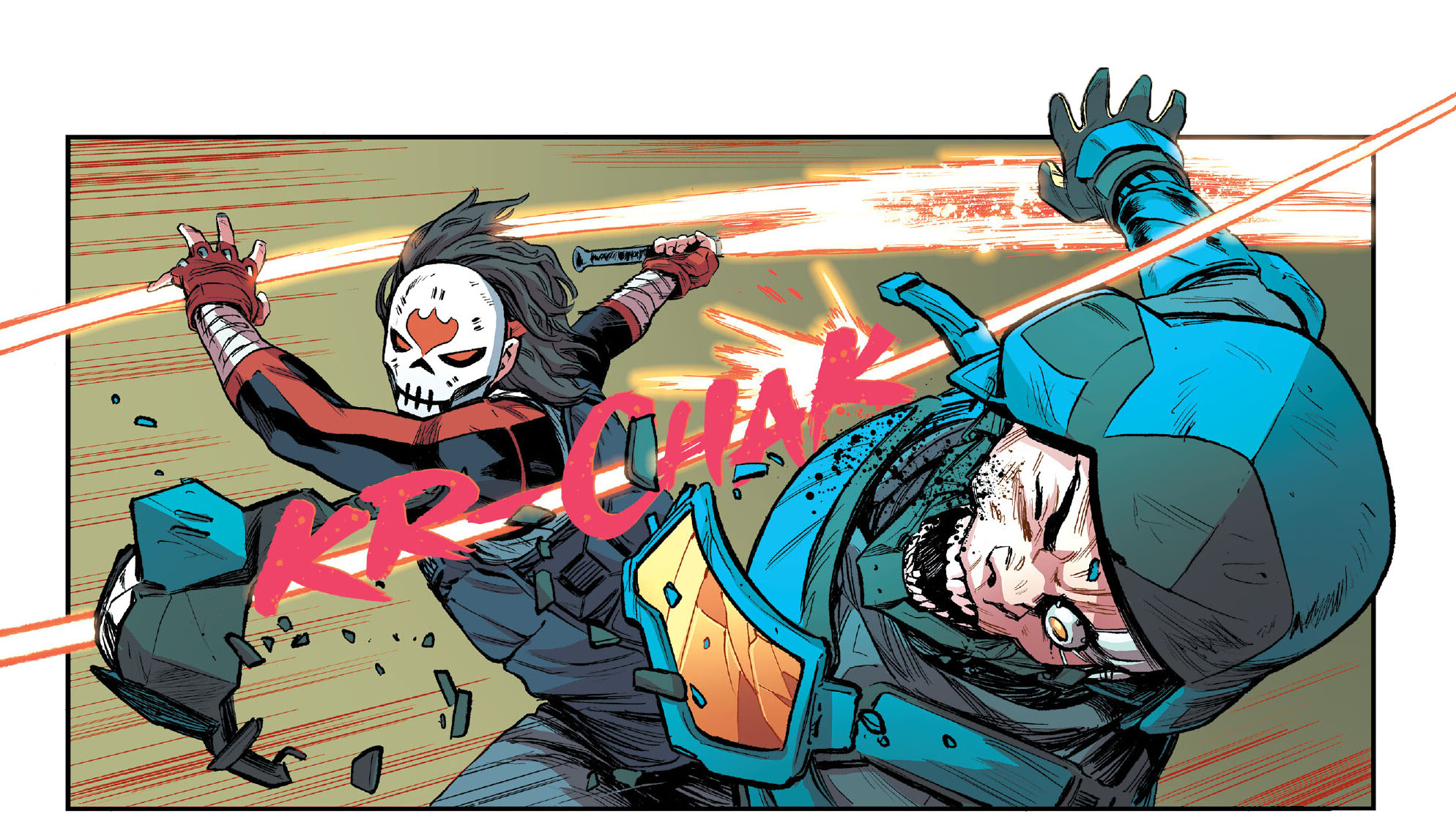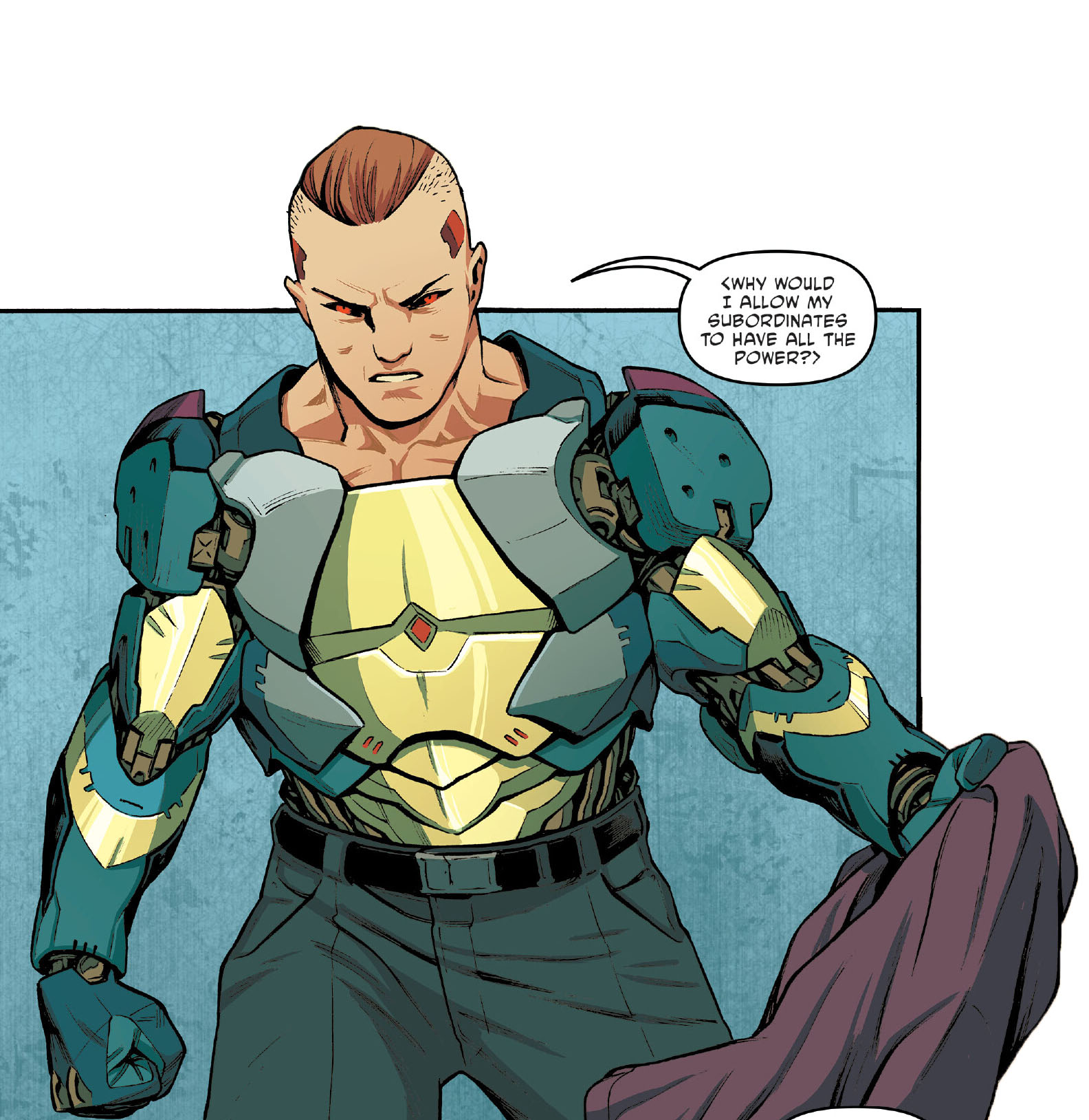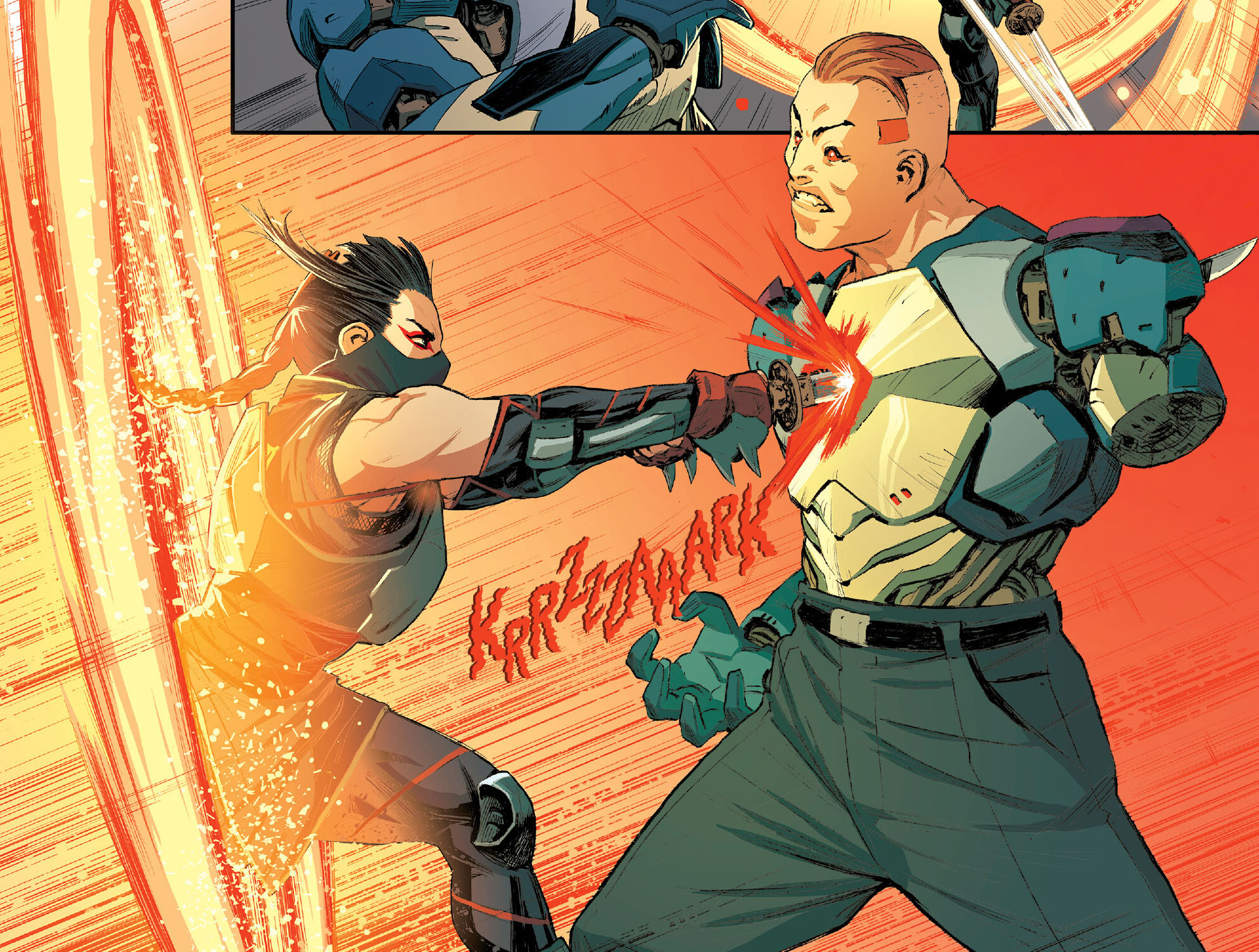 Malgré l’effet de surprise, Yoshi Chen ne s’avouait pas vaincu. Bien au contraire. Malgré la magie que possédait Karai, il ne s’intimidait pas et continuait de s’estimer supérieur à elle. Furieuse de le voir toujours aussi arrogant, elle abattait la lame de son sabre sur sa tête. L’homme avait à peine le temps de se protéger en lavant les bras. Les vêtements lacérés par le coup laissaient apparaître des bras robotiques.