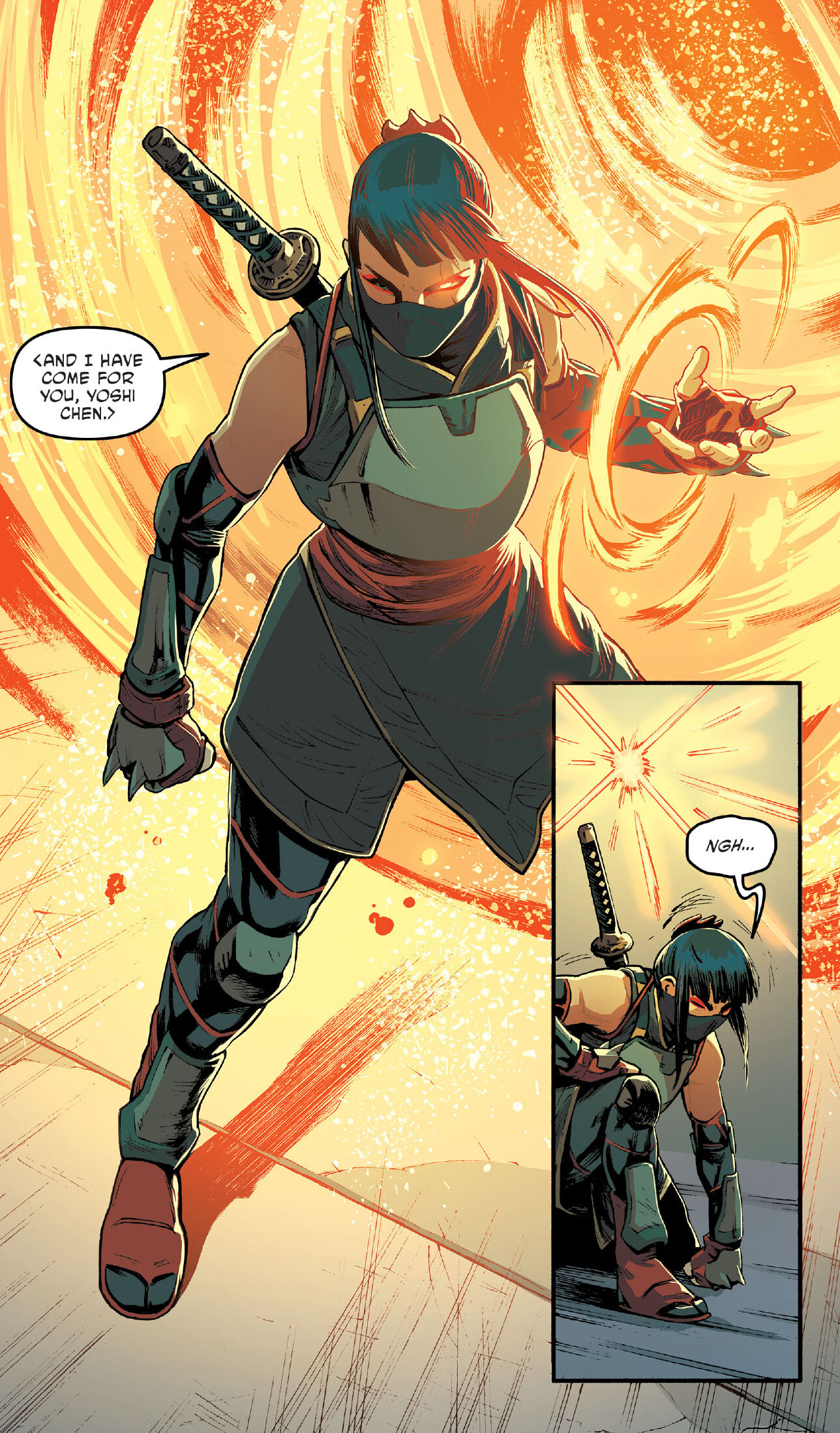 Yoshi Chen se trouvait dans les laboratoires de son clan. Son corps avait été remplacé à la suite de son combat contre Karai. Il revêtait une amure de samurai de haute technologie, tout en recevant le rapport du docteur Chaplin