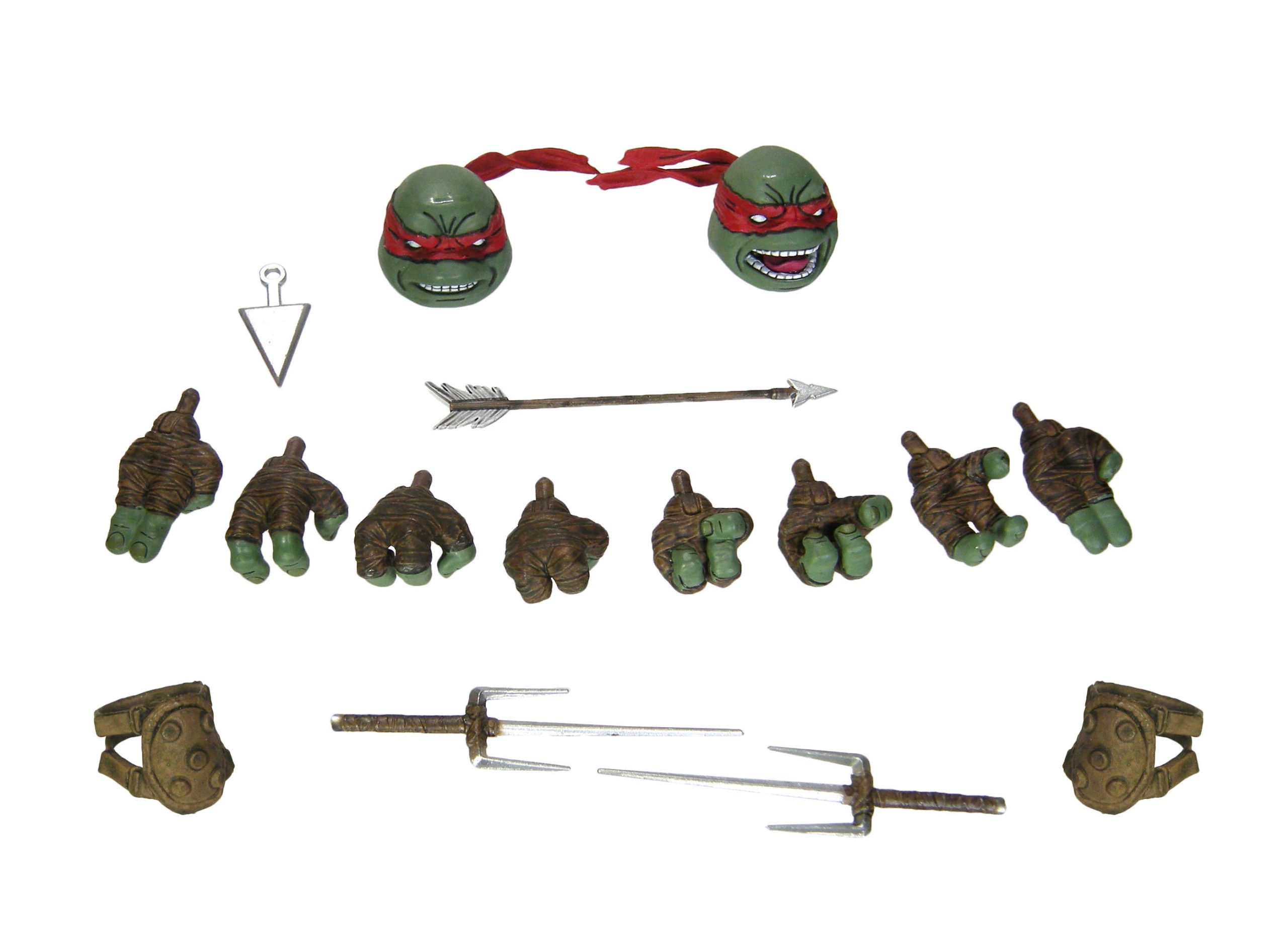 Notre Raphael dispose d’un certain nombre d’accessoires. Deux têtes interchangeables, quatre paires de mains, deux genouillères, un katar, deux saïs et une flèche.