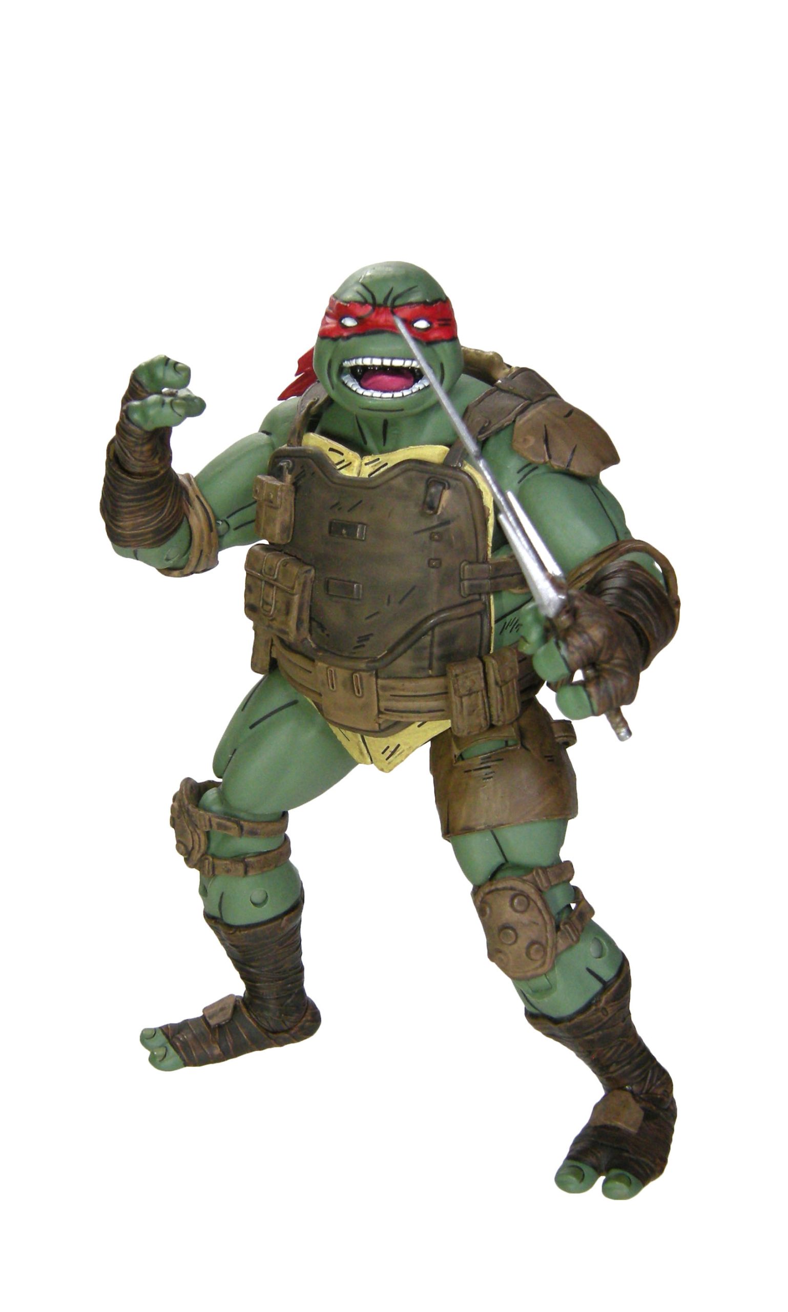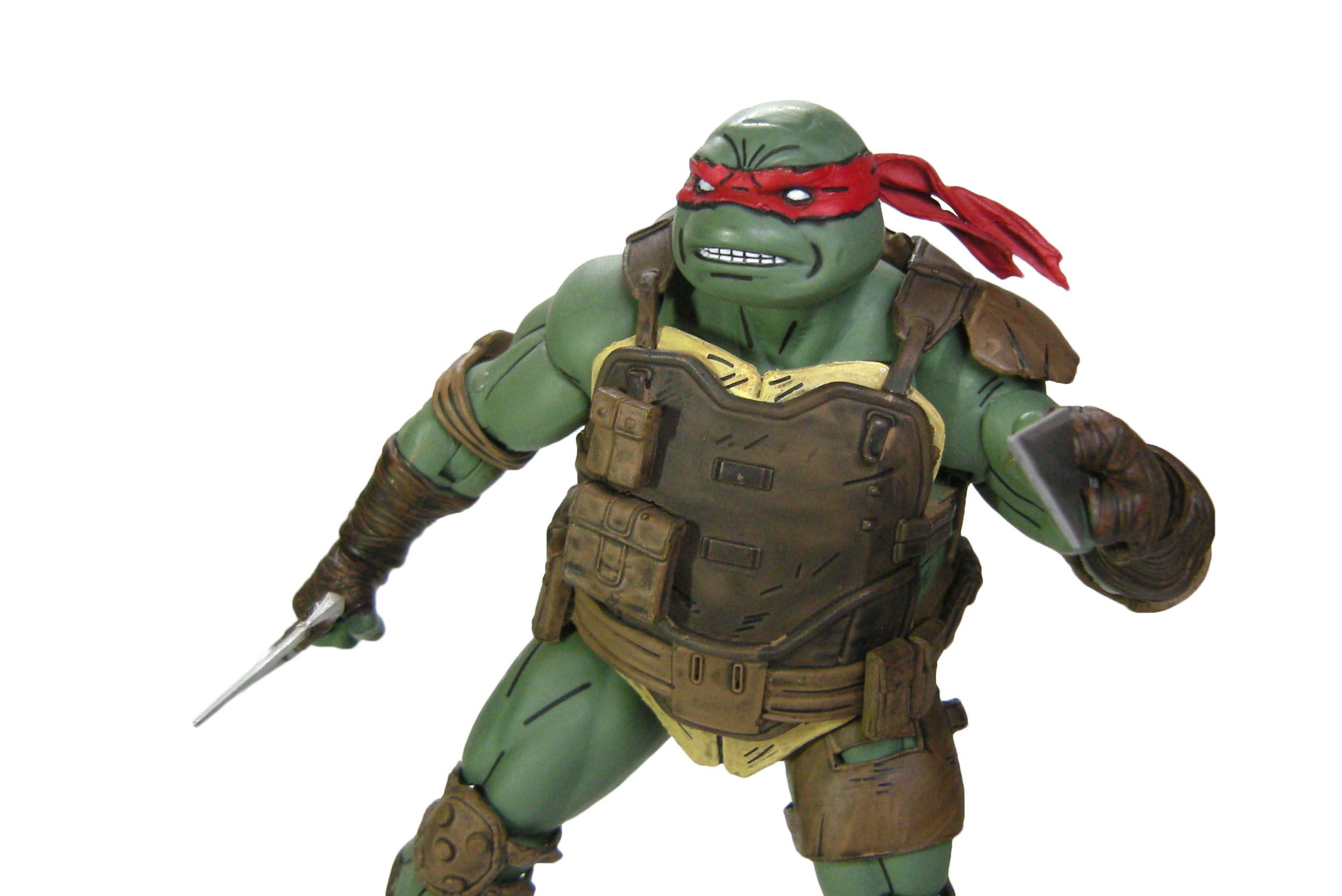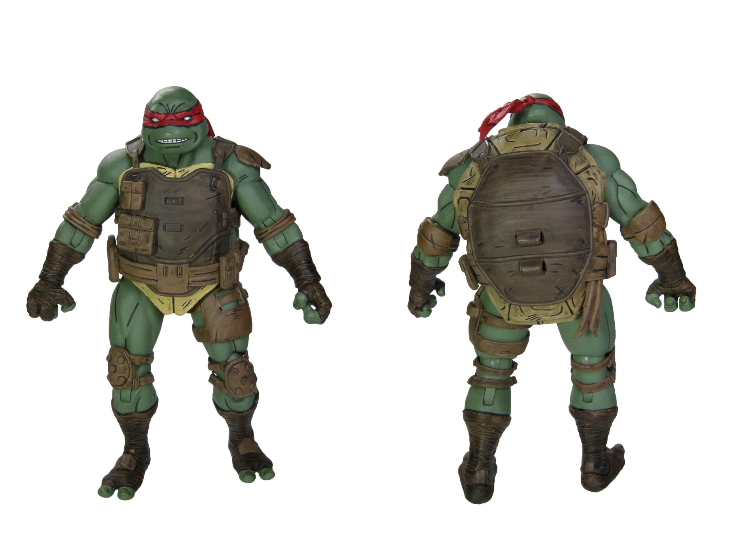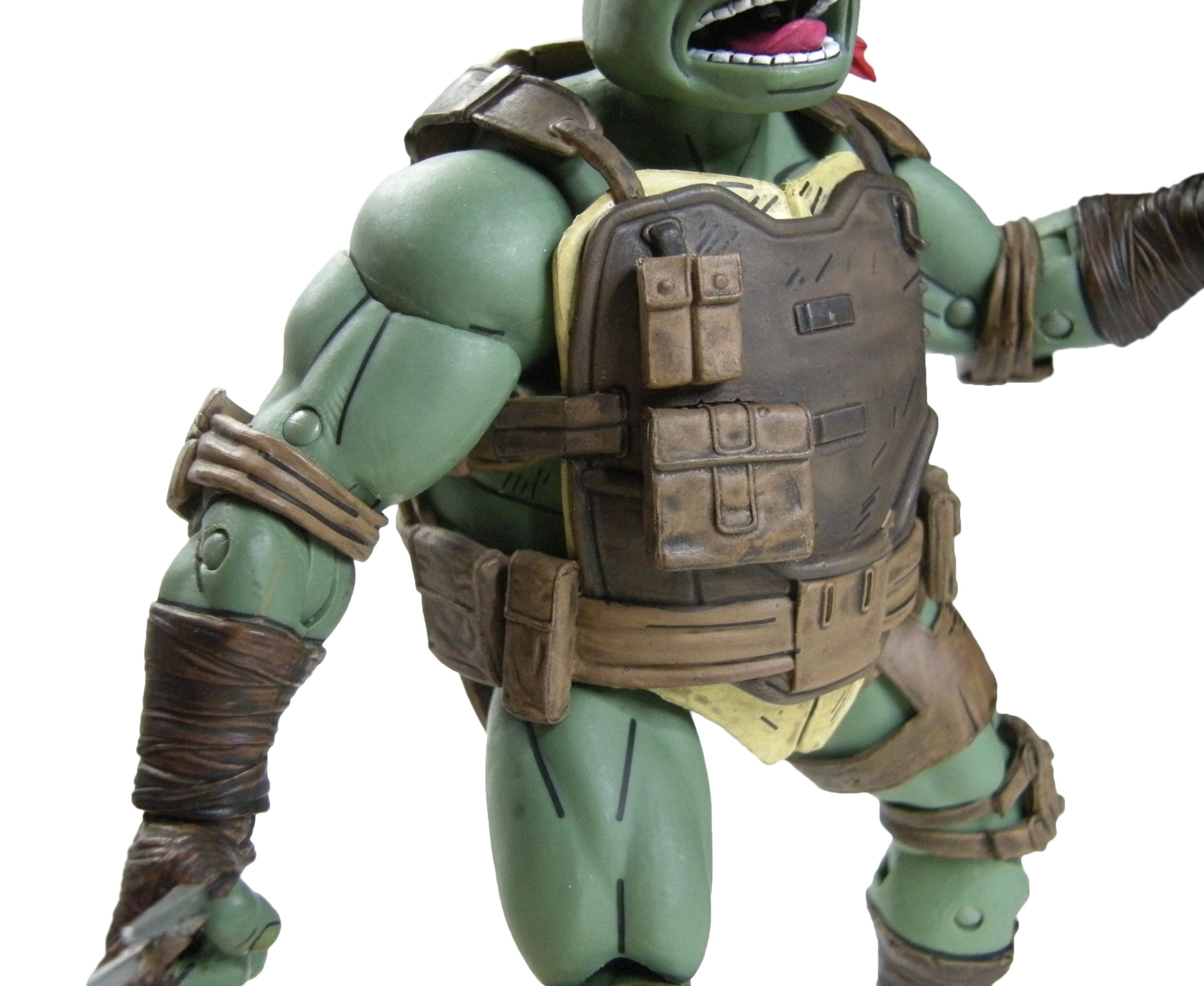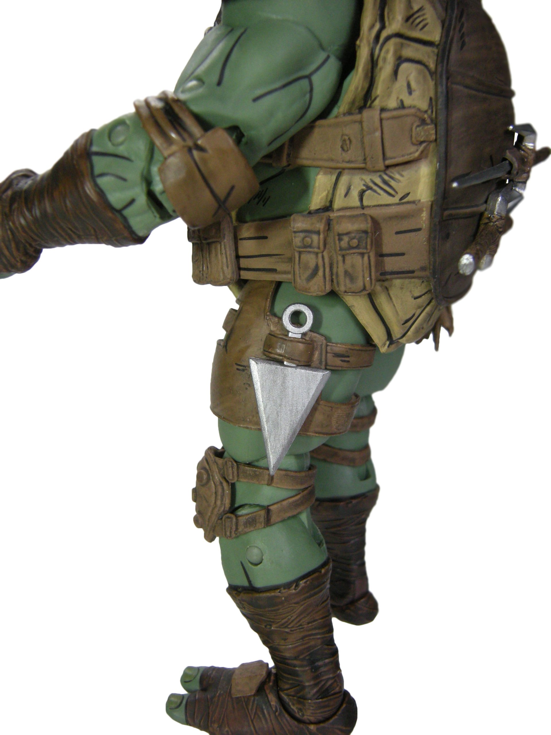 Mais c’est surtout l’équipement de Raphael qui est magnifique. Le gilet en kevlar est peint d’un brun relativement foncé, mis en évidence par les différents reliefs comme les lanières ou les pochettes de rangement, dans un brun plus clair. Le tout est renforcé par des traits noirs, certains pour accentuer les reliefs, d’autres pour donner un effet d’usure, reprenant le style comic book très discret de cette gamme. La carapace est peinte dans un brun qui tire vraiment sur le jaune. Ce serait mon seul reproche quant à cette figurine. Elle est certes claire dans les comics. Mais pas autant. Le contraste avec le reste de l’équipement est un poil trop fort.