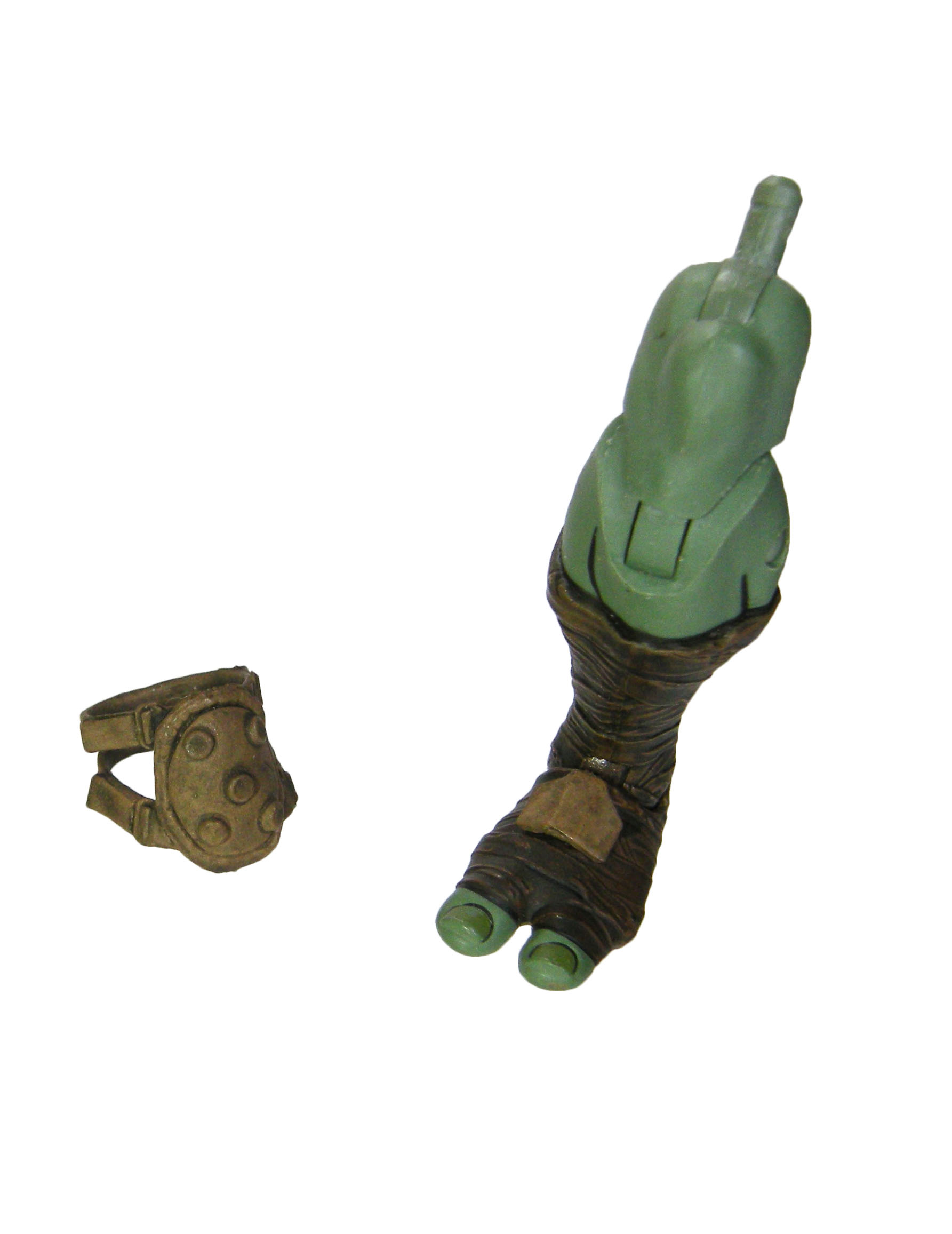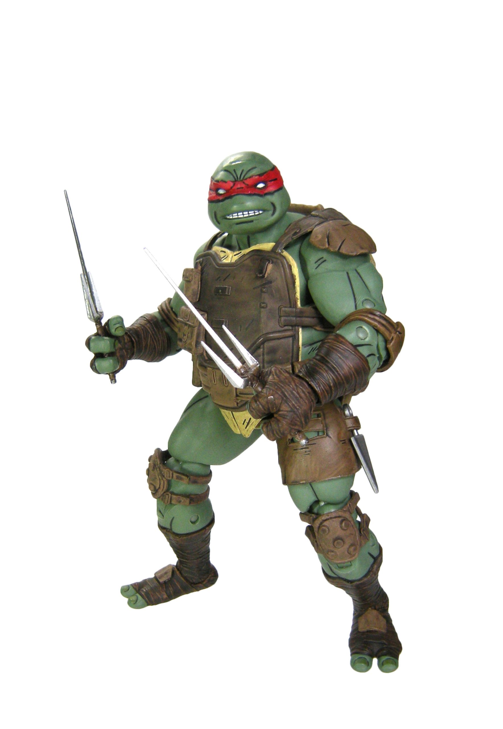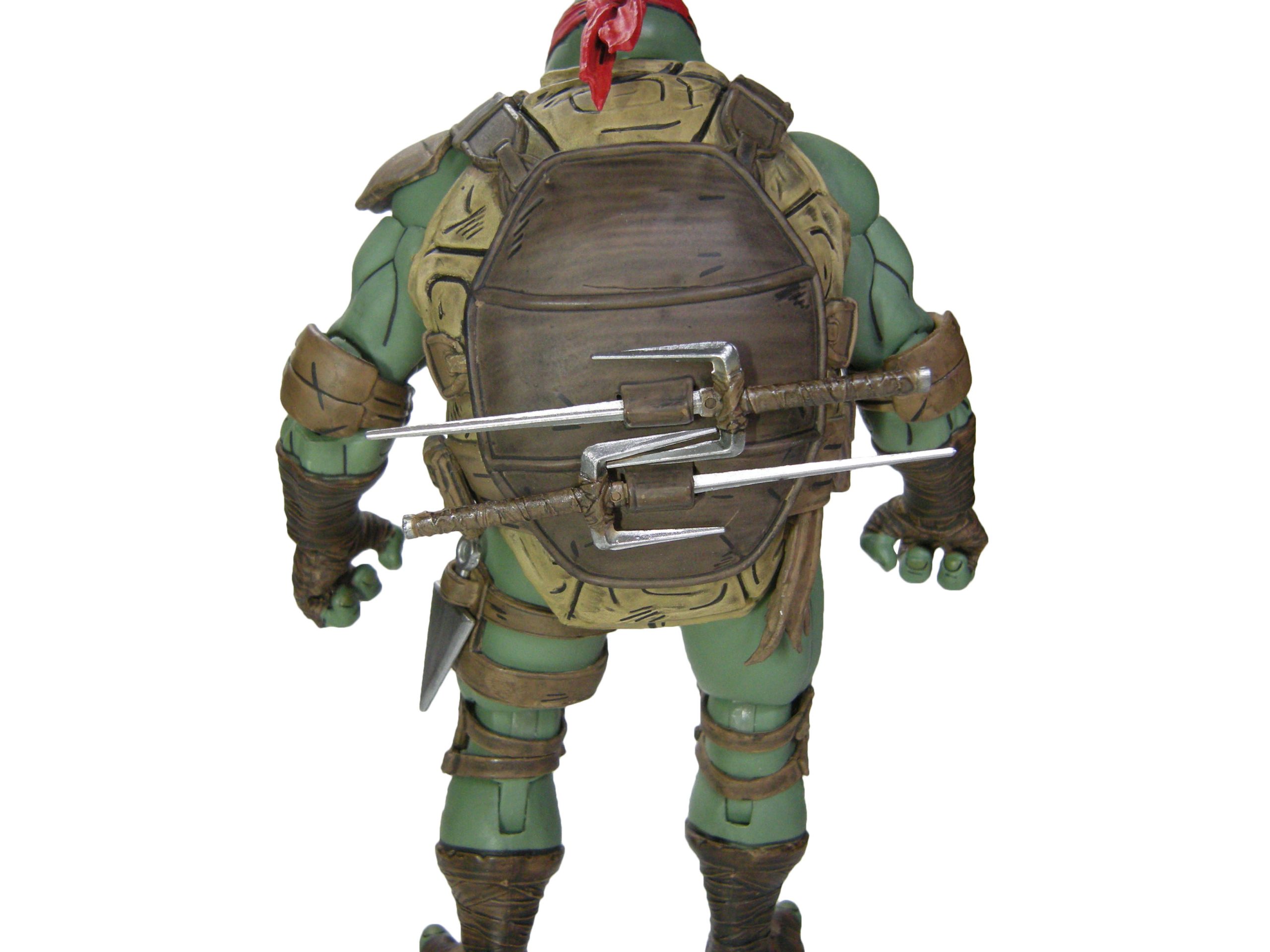 Au niveau des mains, nous sommes plutôt gâtés. Mais j’aurais espéré un petit peu mieux. Une paire de plus peut-être ? Dans le détail, nous avons quatre paires de mains symétriquement identiques les unes aux autres. Une paire aux poings fermés, une paire parfaitement plate, une paire aux doigts écartés, et une paire permettant de tenir les saïs. Cette dernière dispose les doigts d’une manière assez étrange, mais le rendu n’est pas mal du tout. Il faut dire que les poignées des armes sont plutôt étroites, ce qui doit expliquer ce positionnement. Alors pourquoi je regrette l’absence d’une paire supplémentaire ? Car les saïs sont très étroits. Impossible par exemple de placer les lames de ces armes entre les doigts de la tortue. Elle ne peut les tenir que de manière conventionnelle, par le manche. C’est assez dommage, car nous voyons bien Raphael les tenir par les lames au cours de son combat contre Karai et ses ninjas Foot.