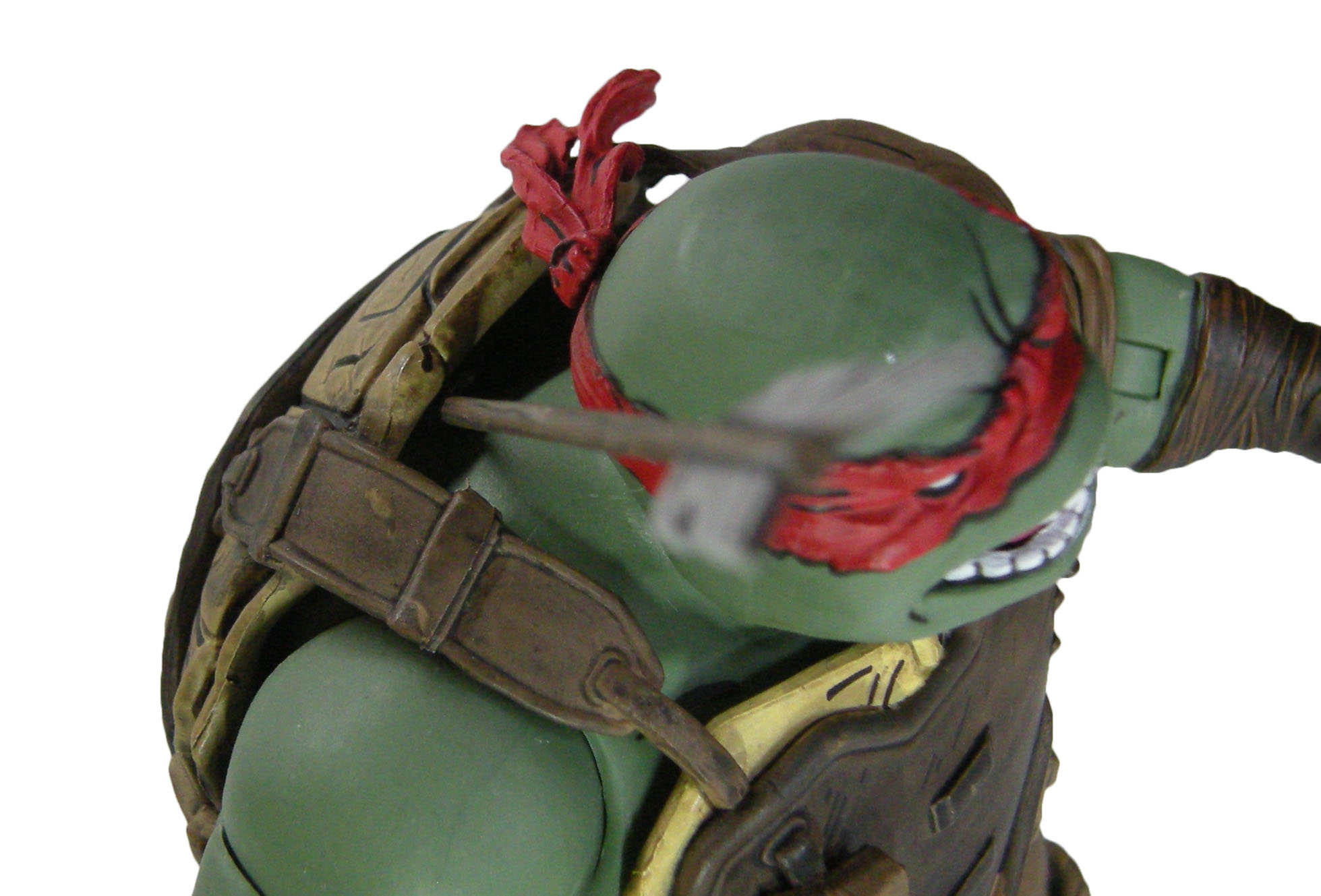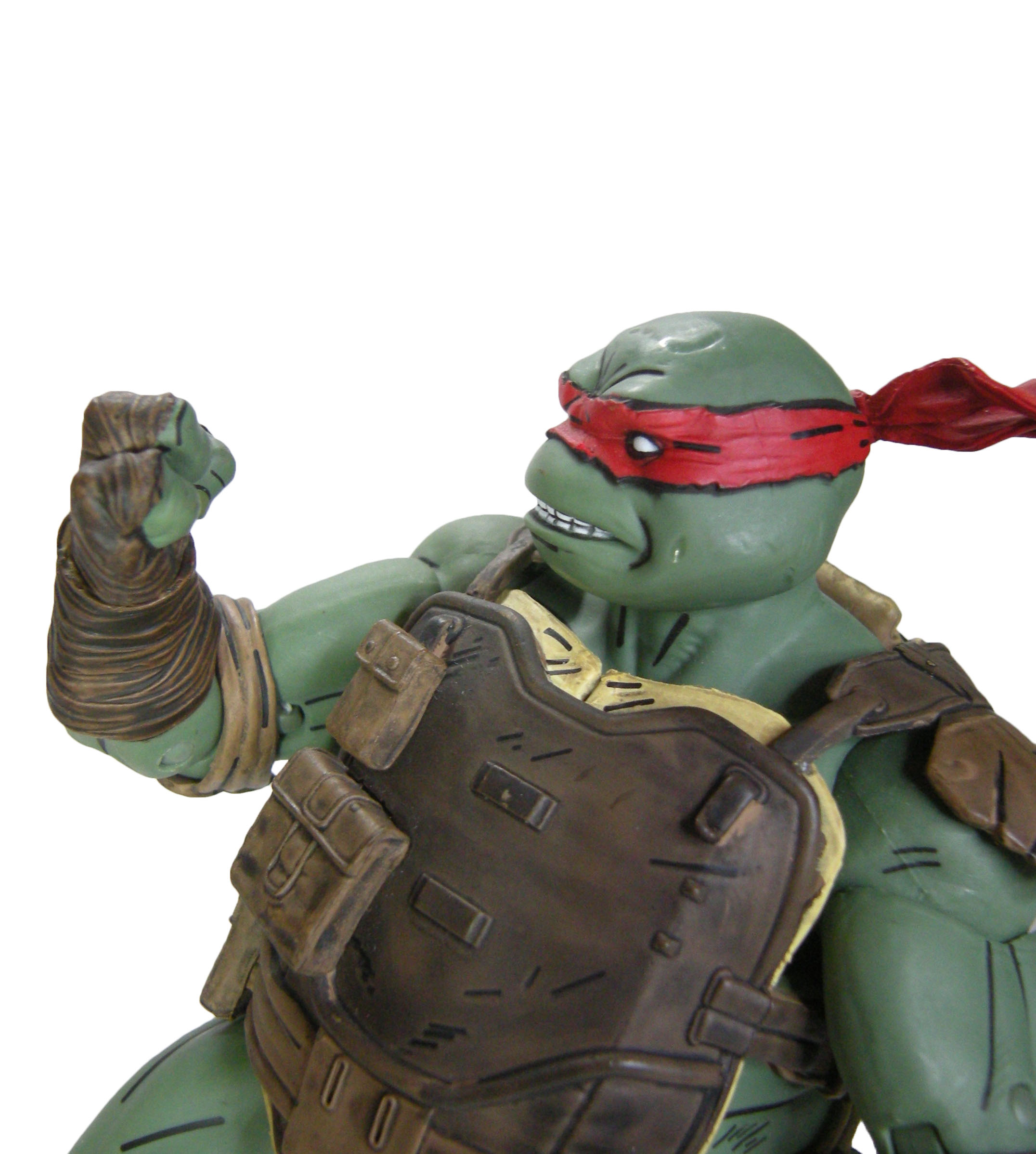 La sculpture de Raphael, à l’instar de son design, change drastiquement des autres figurines déjà sorties, et signées par Paul Harding. Et pour cause, l’artiste chargé de travailler sur cette version de Raphael est Gurjeet Singh. Et je trouve que c’est une super idée. Dans le comic The last ronin, les scènes du passé étaient assurées par Ben Bishop. Celle du présent par les frères Escorza. Cette alternance au niveau des figurines est une excellente idée. Singh est d’ailleurs un artiste que j’apprécie énormément pour son travail extrêmement détaillé. Il a déjà signé depuis 2022 le triceraton Zog et Savanti Romero, pour la gamme Mirage comics de NECA.