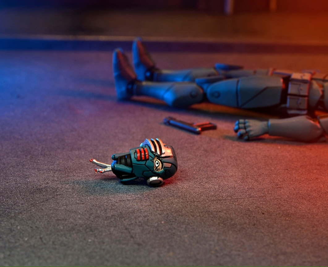 Les trois têtes interchangeables sont une excellente idée d’ajout. En effet, dans The last ronin, nous découvrons plusieurs types de synjas. Le classique, avec une visière métallique complète. Mais aussi des robots flics avec une visière rouge. Ces deux représentations sont bien proposées ici par NECA. Excellent choix !
