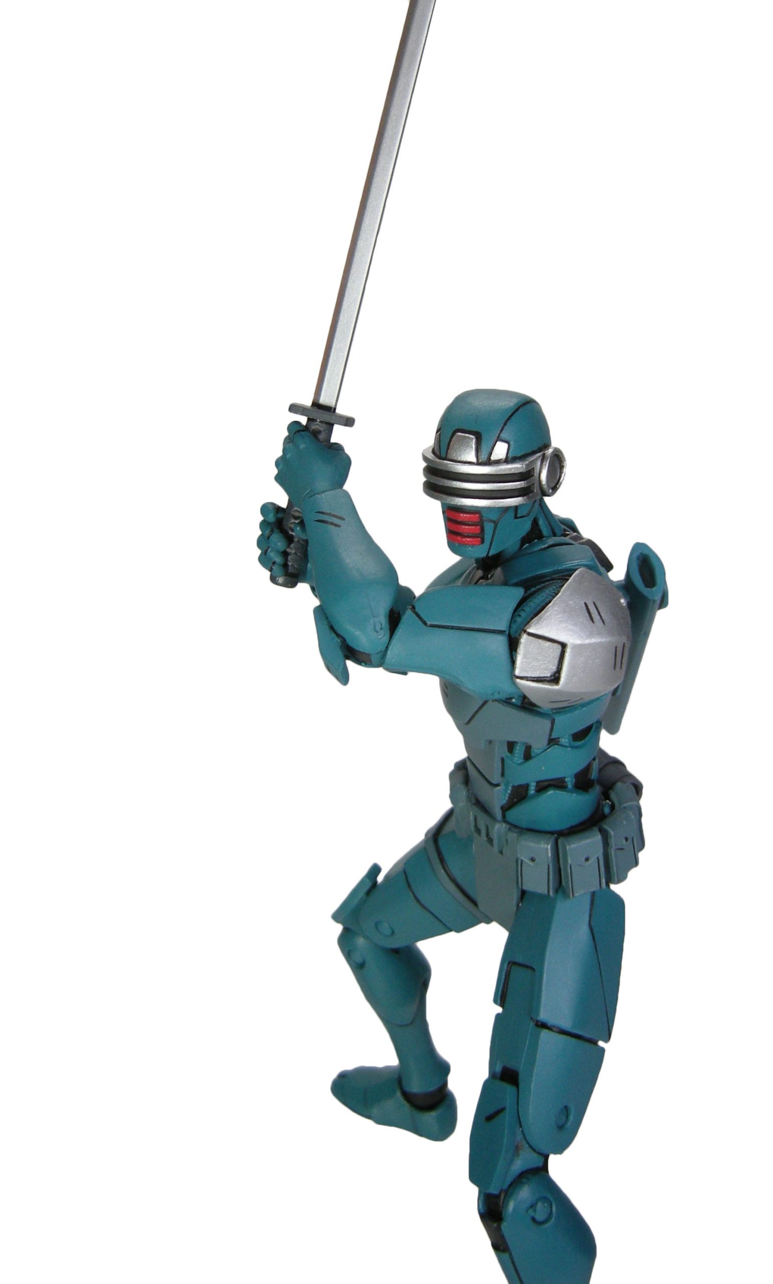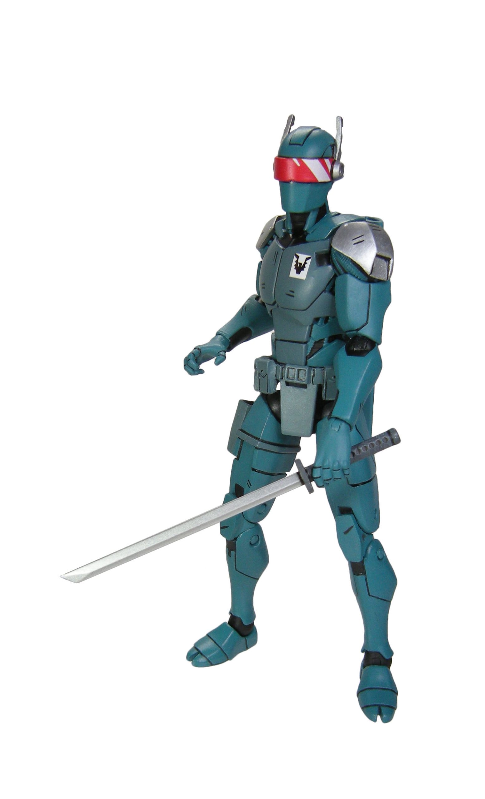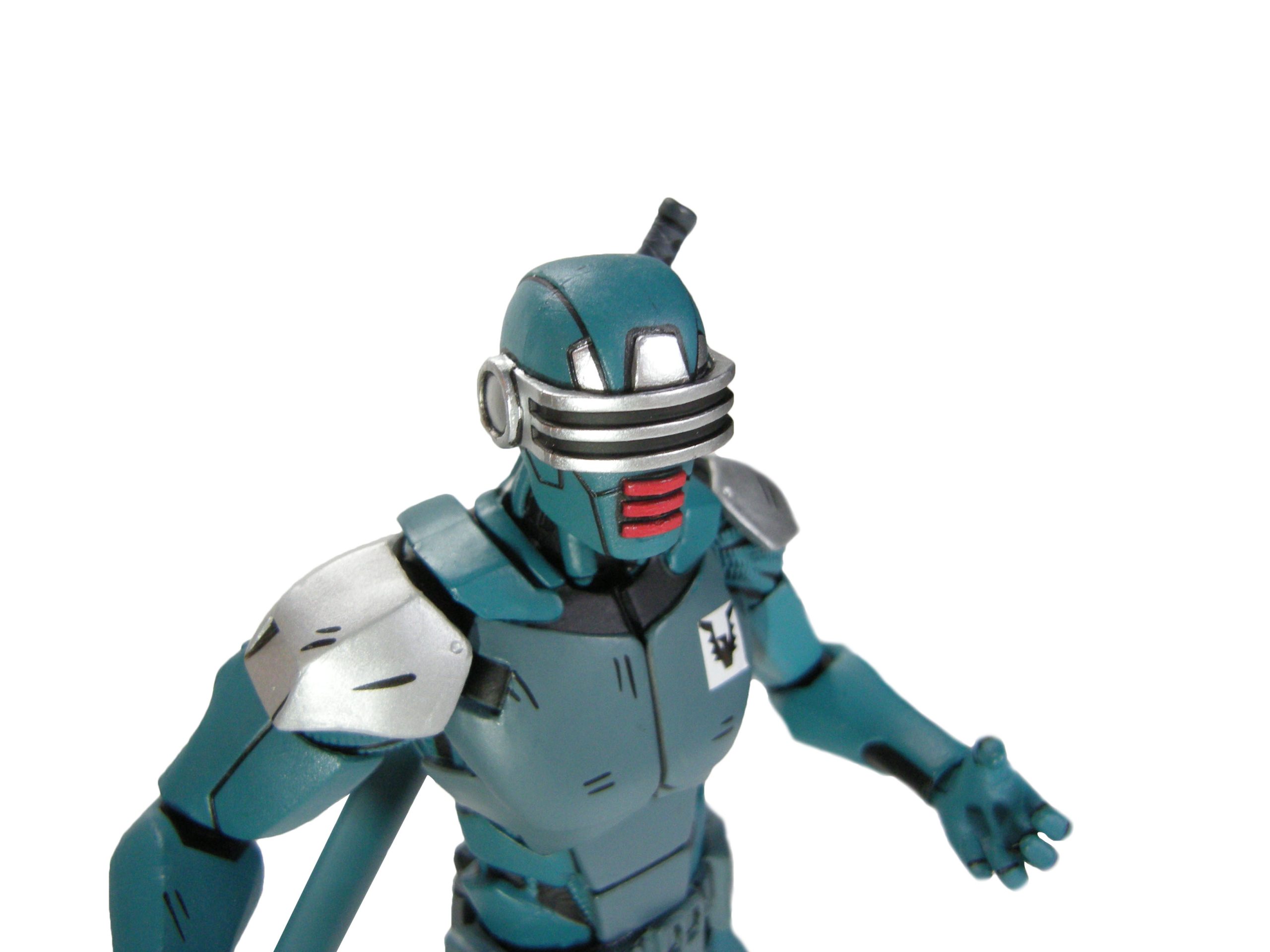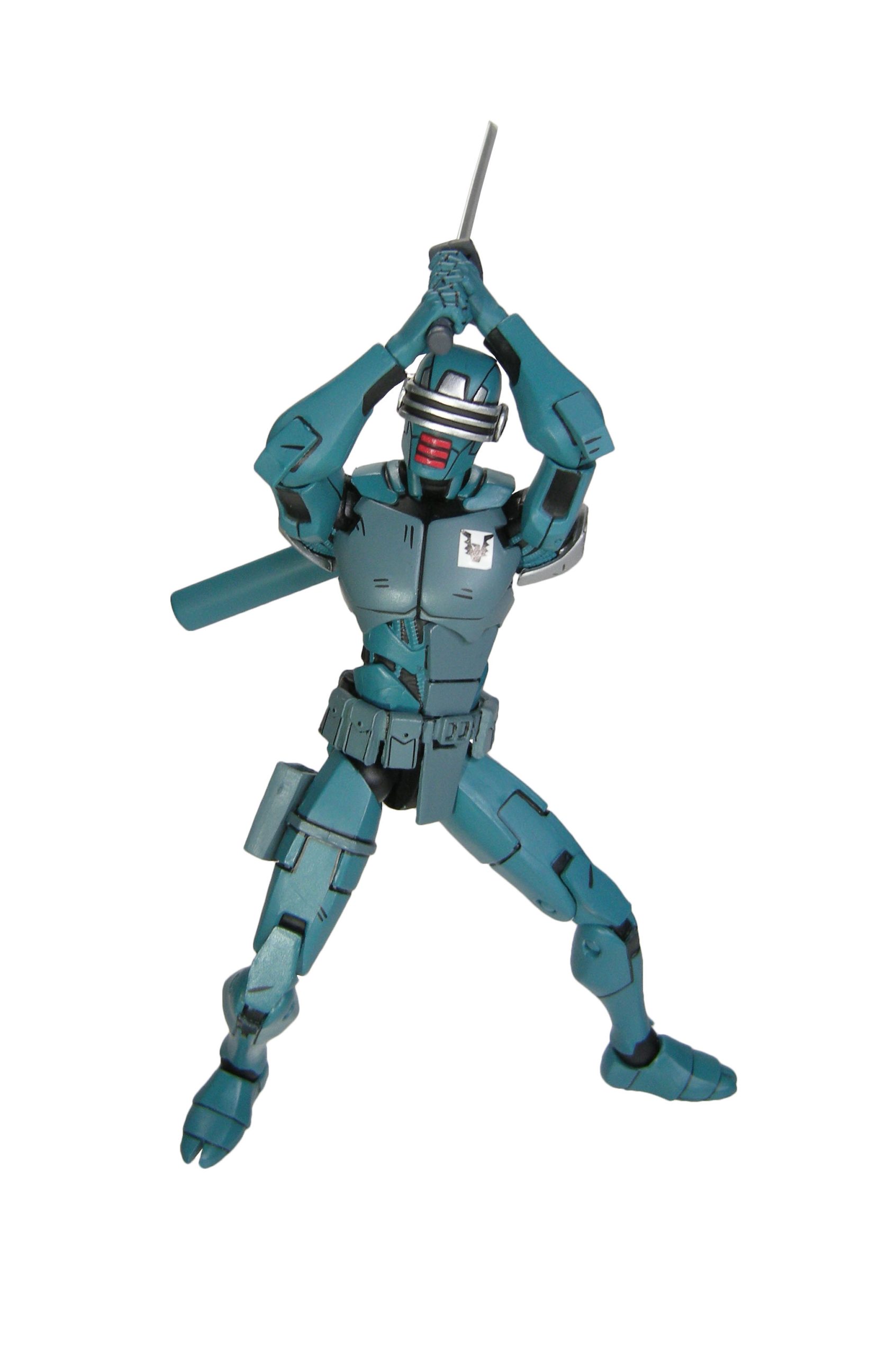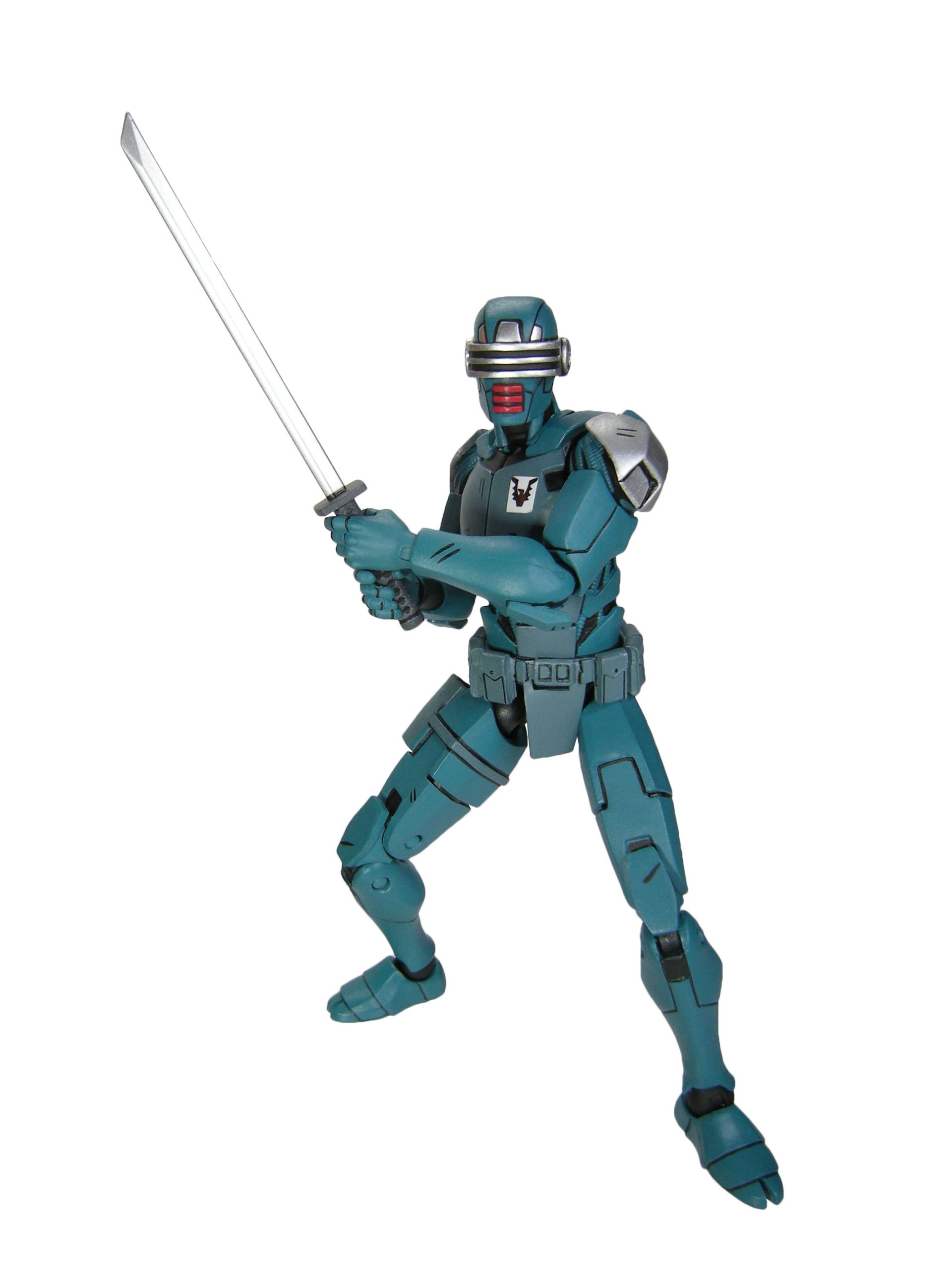 J’ai un vrai coup de cœur pour cette sculpture. Chaque détail a minutieusement été reporté dessus et me fait beaucoup penser à la figurine de l’androïde utrom de la gamme de Mirage. L’allure générale du personnage, notamment la tête, rappelle un petit peu un Gi-Joe. Alors on pourrait trouver des choses à redire sur certains détails. Il manque par exemple les trois fentes sur le haut du pectoral droit du robot. Tous n’avaient pas ces protections aux avant-bras. Mais ce sont des détails qui varient terriblement d’une illustration à l’autre. Il faut dire que les frères Escorza n’étaient pas tout à fait au point dès le début. Cela va de même pour le ronin, et le placement de ses armes dans le dos.