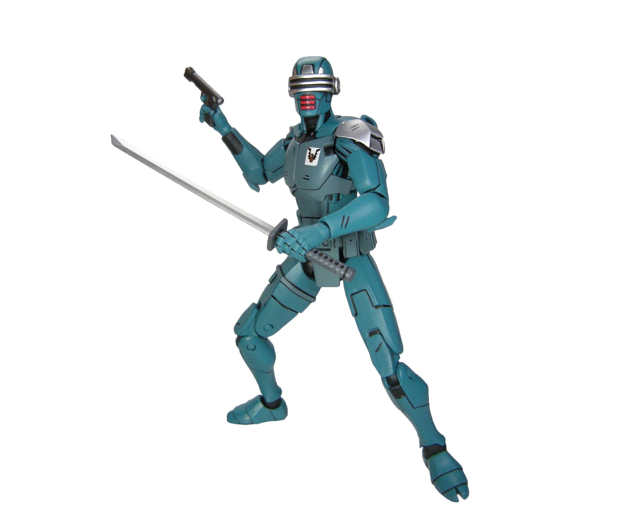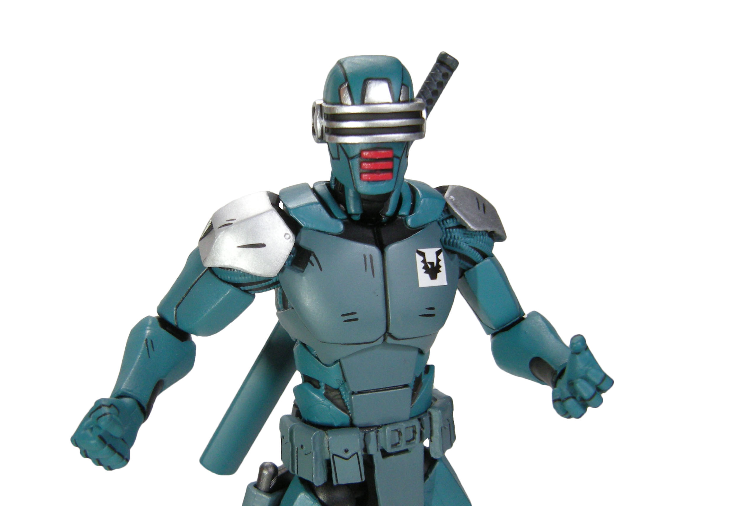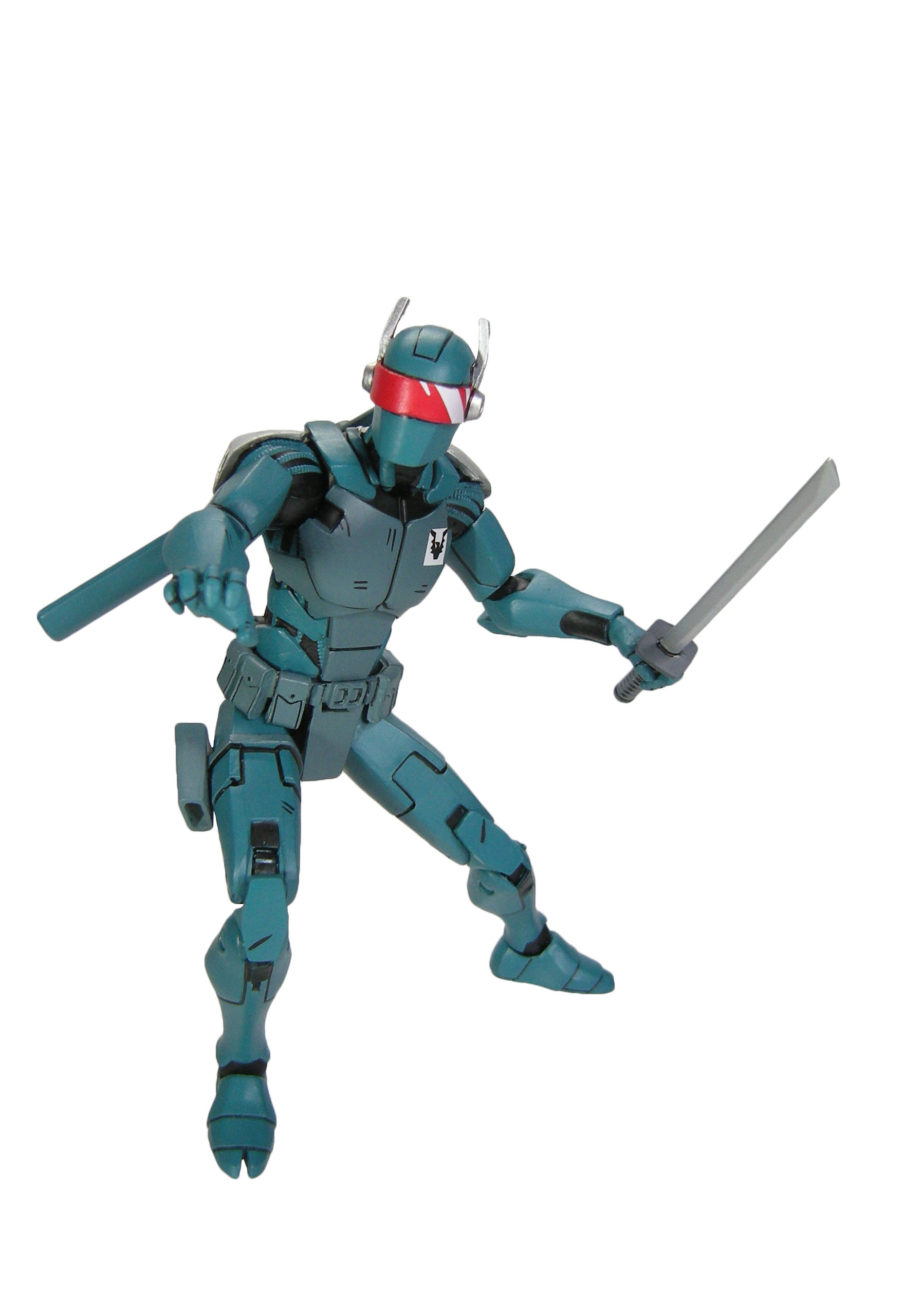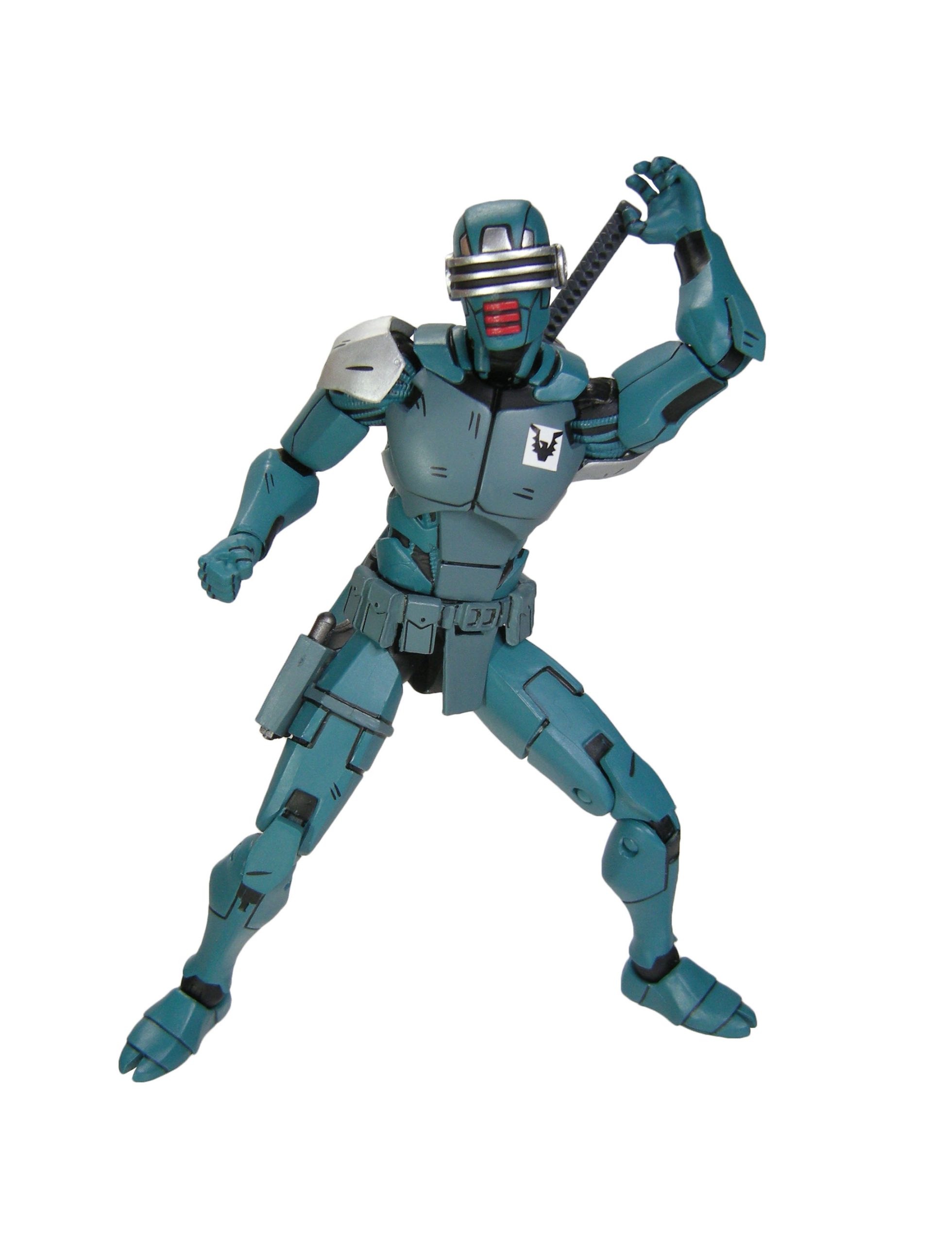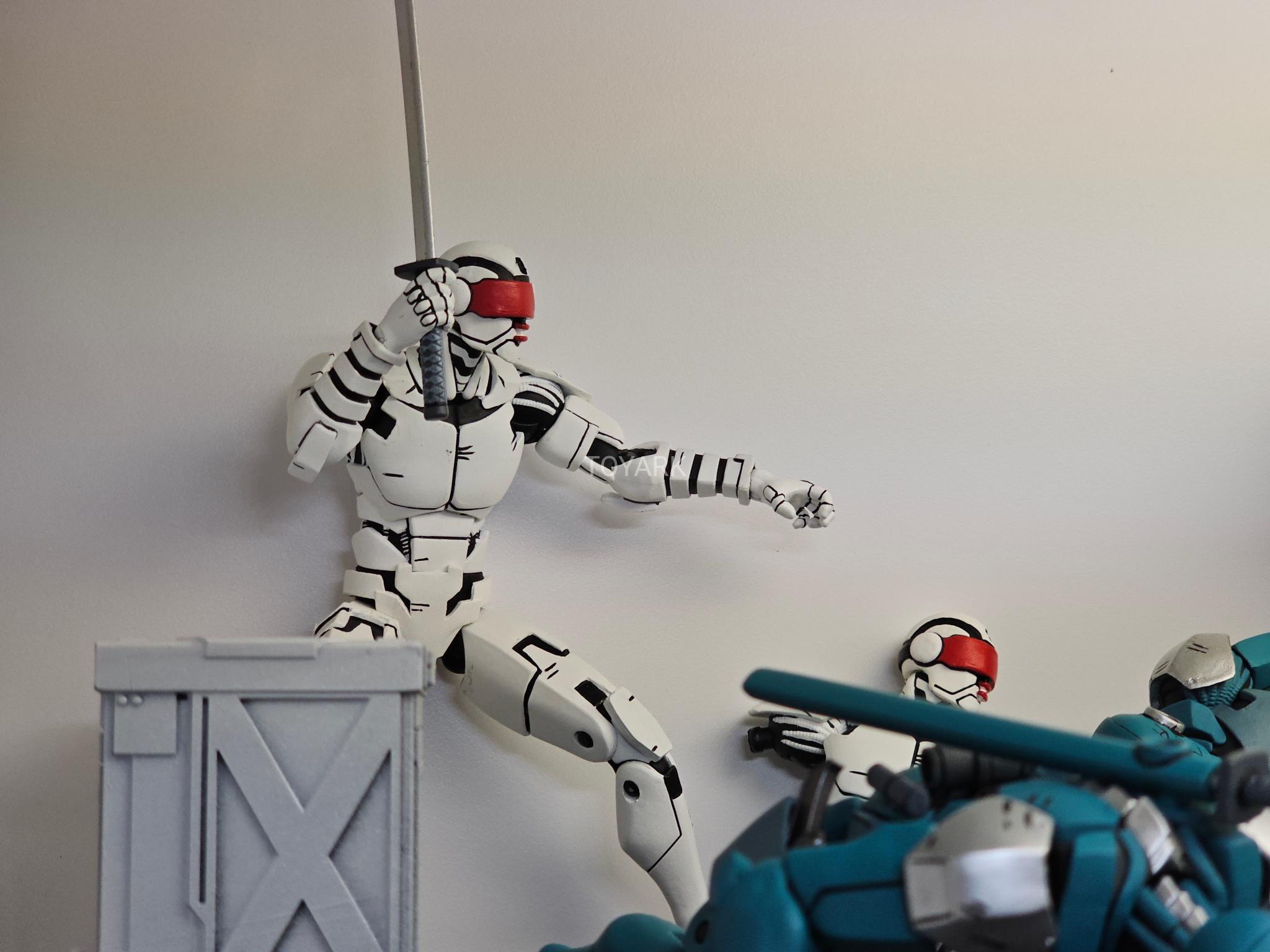 J’ai un vrai coup de cœur pour cette sculpture. Chaque détail a minutieusement été reporté dessus et me fait beaucoup penser à la figurine de l’androïde utrom de la gamme de Mirage. L’allure générale du personnage, notamment la tête, rappelle un petit peu un Gi-Joe. Alors on pourrait trouver des choses à redire sur certains détails. Il manque par exemple les trois fentes sur le haut du pectoral droit du robot. Tous n’avaient pas ces protections aux avant-bras. Mais ce sont des détails qui varient terriblement d’une illustration à l’autre. Il faut dire que les frères Escorza n’étaient pas tout à fait au point dès le début. Cela va de même pour le ronin, et le placement de ses armes dans le dos.
