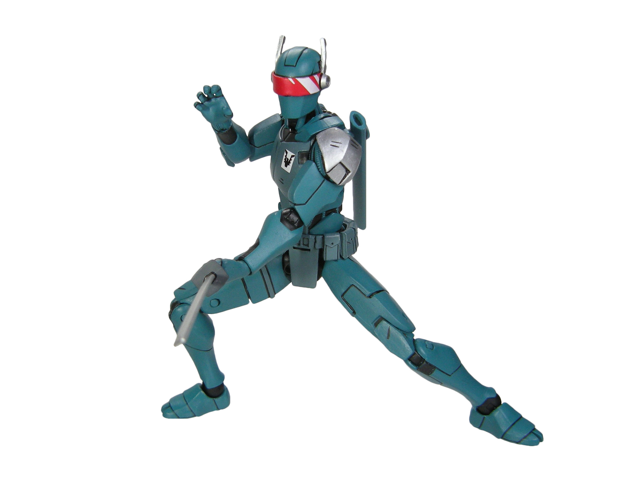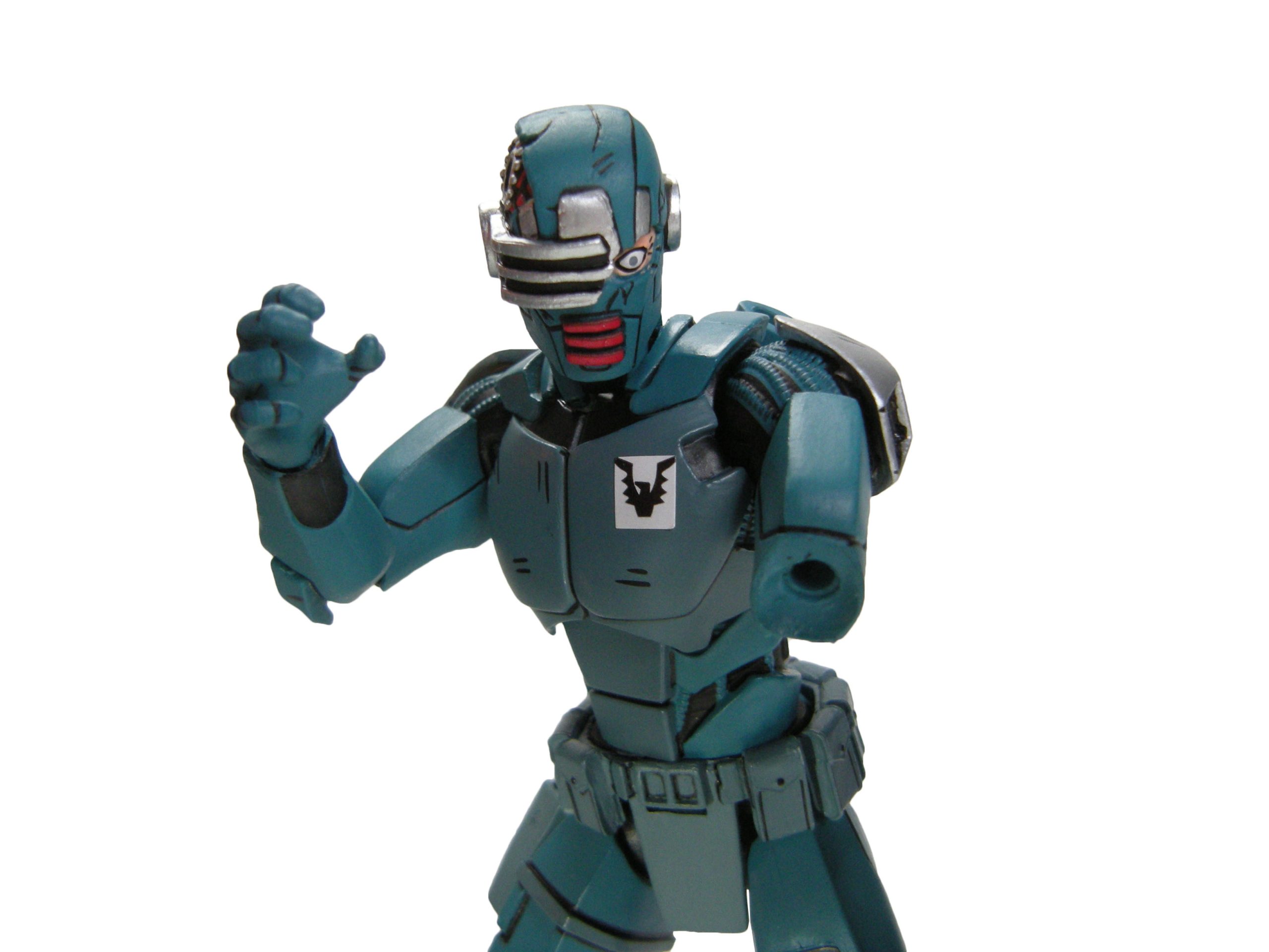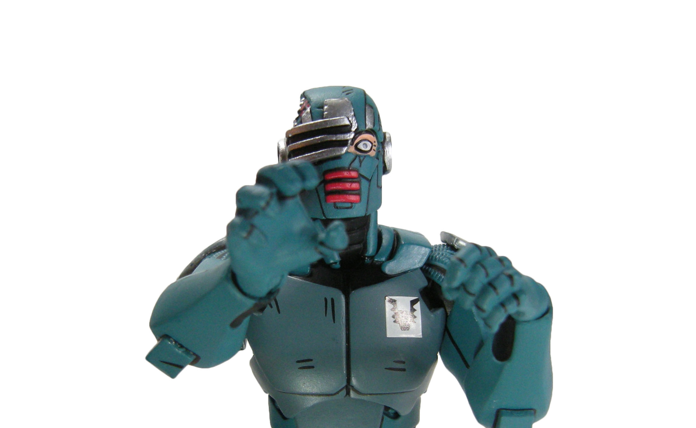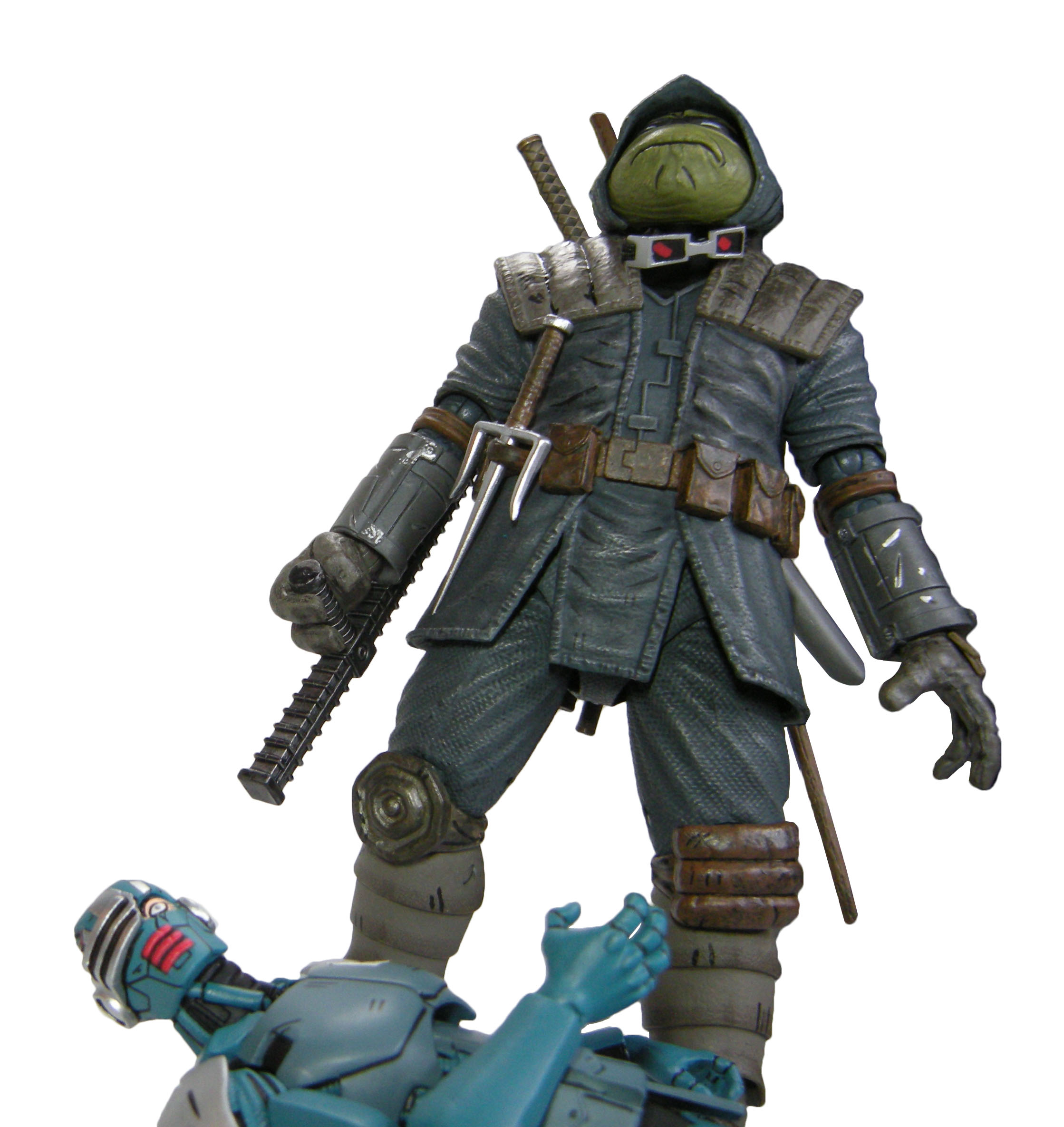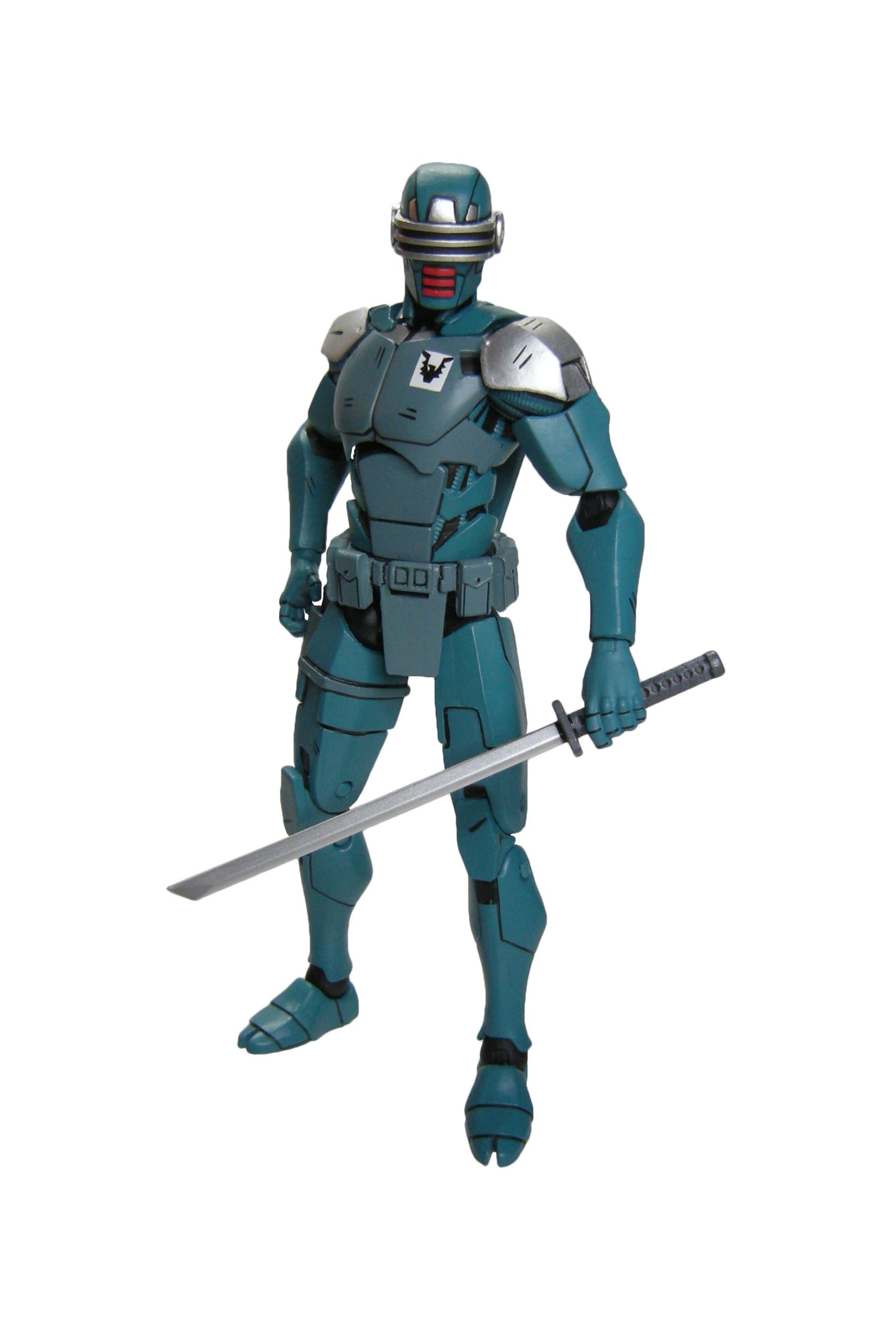 J’ai un vrai coup de cœur pour cette sculpture. Chaque détail a minutieusement été reporté dessus et me fait beaucoup penser à la figurine de l’androïde utrom de la gamme de Mirage. L’allure générale du personnage, notamment la tête, rappelle un petit peu un Gi-Joe. Alors on pourrait trouver des choses à redire sur certains détails. Il manque par exemple les trois fentes sur le haut du pectoral droit du robot. Tous n’avaient pas ces protections aux avant-bras. Mais ce sont des détails qui varient terriblement d’une illustration à l’autre. Il faut dire que les frères Escorza n’étaient pas tout à fait au point dès le début. Cela va de même pour le ronin, et le placement de ses armes dans le dos.