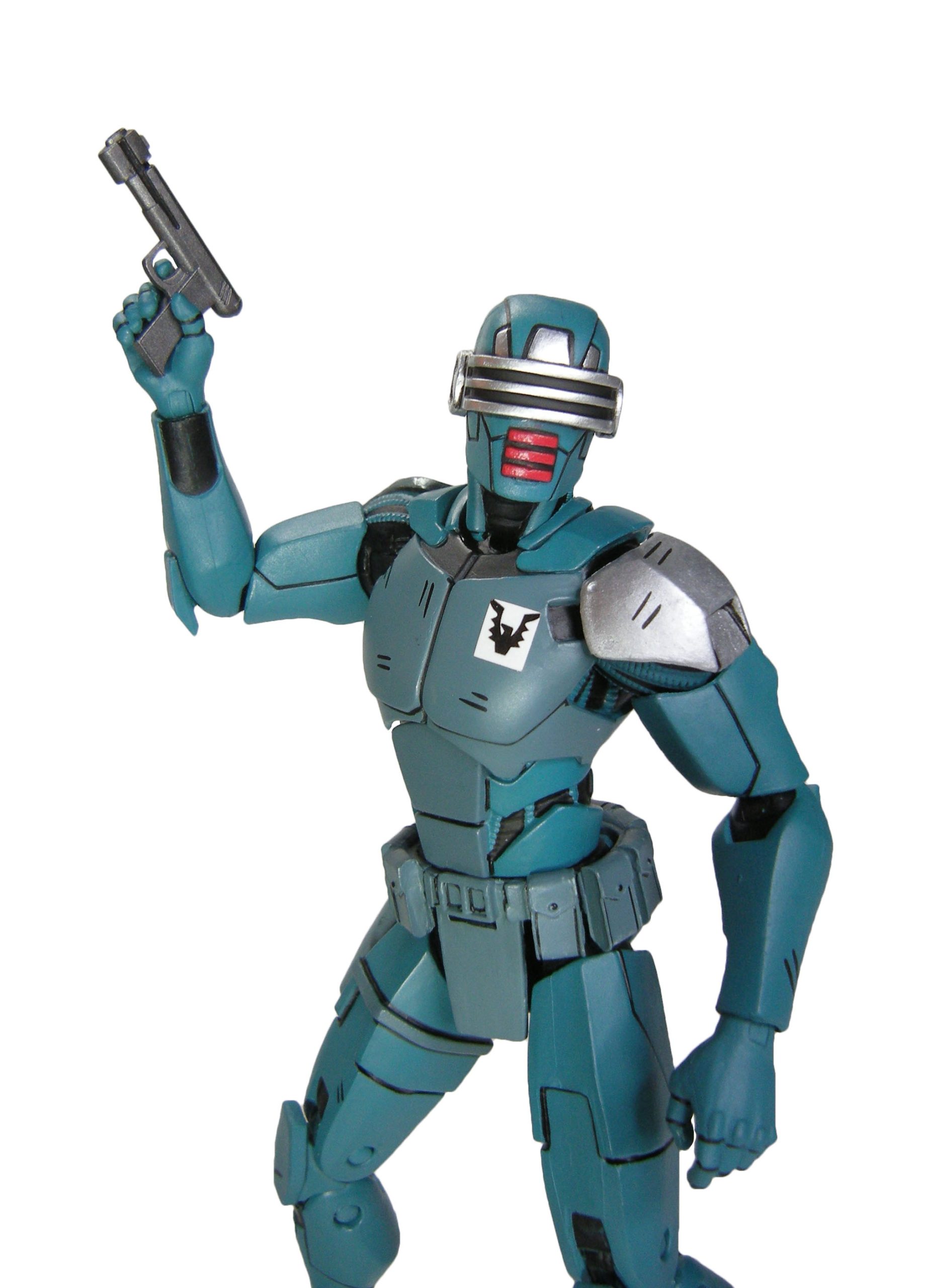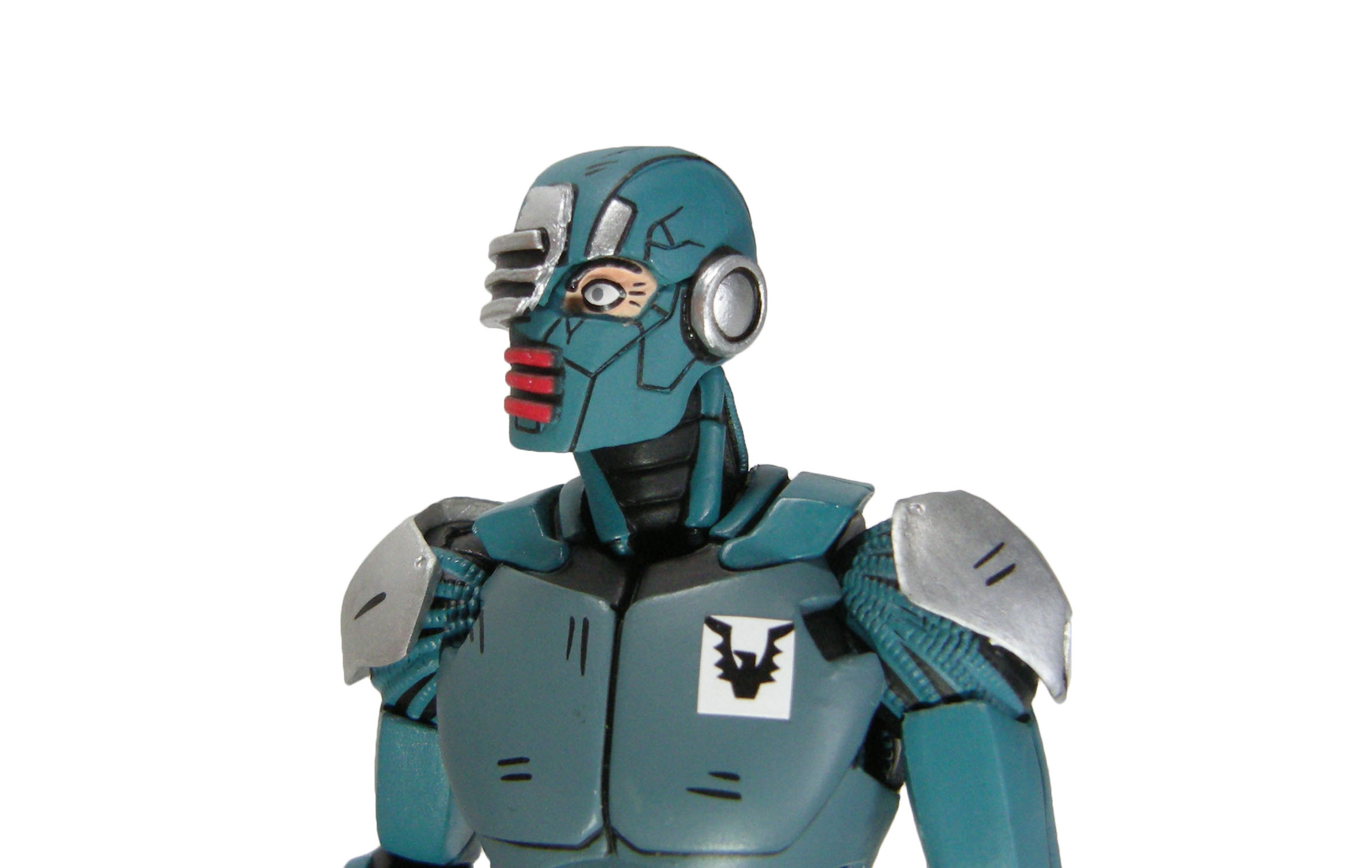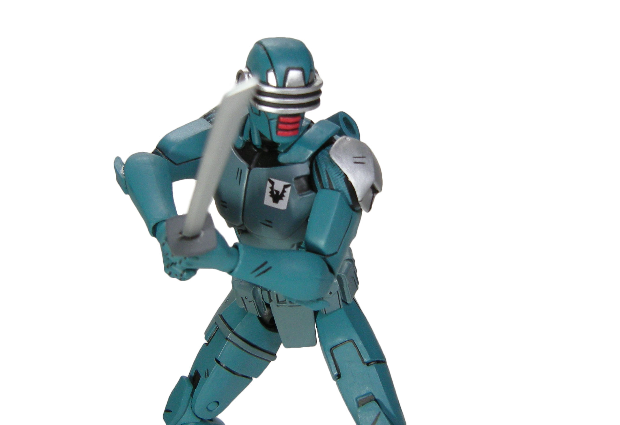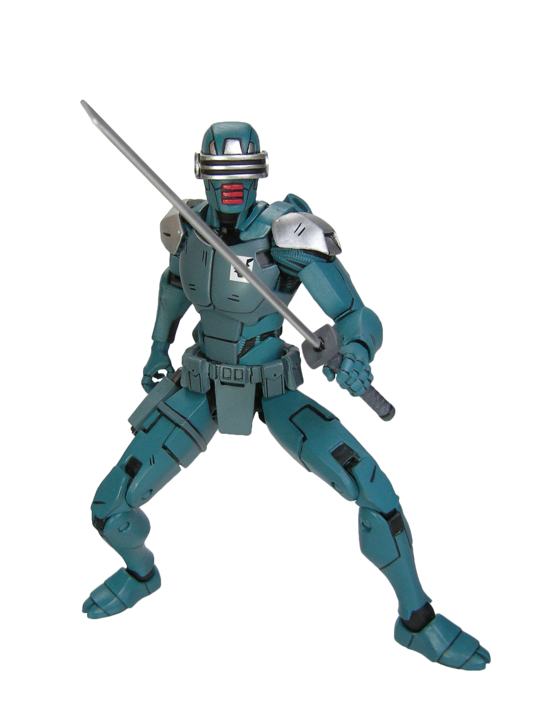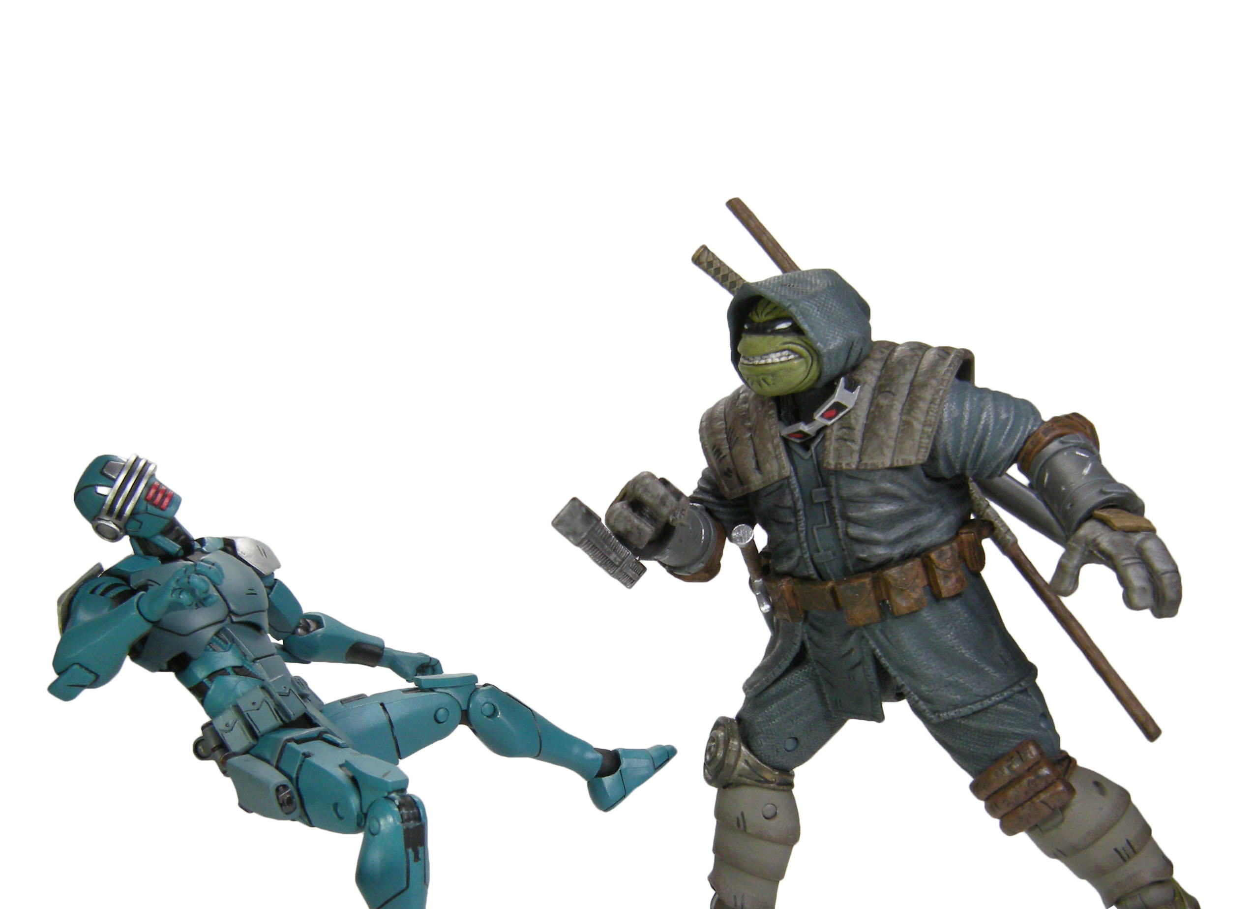J’ai un vrai coup de cœur pour cette sculpture. Chaque détail a minutieusement été reporté dessus et me fait beaucoup penser à la figurine de l’androïde utrom de la gamme de Mirage. L’allure générale du personnage, notamment la tête, rappelle un petit peu un Gi-Joe. Alors on pourrait trouver des choses à redire sur certains détails. Il manque par exemple les trois fentes sur le haut du pectoral droit du robot. Tous n’avaient pas ces protections aux avant-bras. Mais ce sont des détails qui varient terriblement d’une illustration à l’autre. Il faut dire que les frères Escorza n’étaient pas tout à fait au point dès le début. Cela va de même pour le ronin, et le placement de ses armes dans le dos.