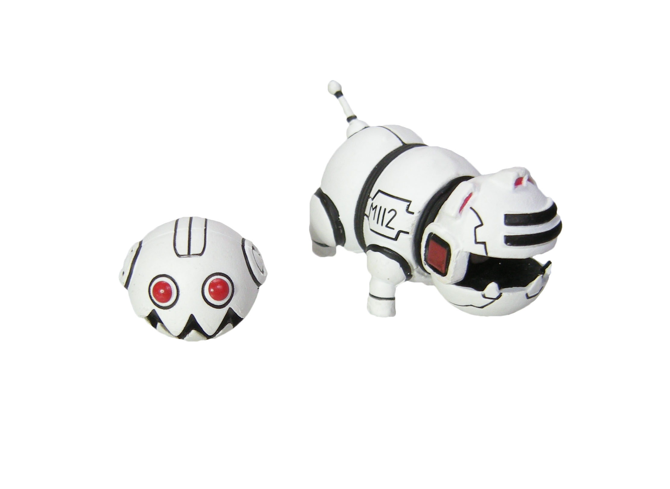 NECA semble vouloir nous proposer à peu près tous les robots de type Mousers vus dans The last ronin. Après le chien accompagnant la version sans armure du dernier ronin, nous avons à présent le Mouser en forme de ballon de football américain. Ces Mousers sont vus dans le laboratoire de Baxter Stockman (The last ronin #4). Ils possèdent deux formes légèrement différentes. Une avec oreillettes et l’autre sans. C’est cette seconde version que nous découvrons ici. Entièrement blanc, de nombreux détails, incisions et collages de plaques permettent de donner du relief au robot. Il possède la bouche ouverte (non articulée) et quelques détails de vis. Le bas est perforé, sans doute pour la chaîne de montage mais qui vous permettra également de le fixer sur un pied transparent pour donner l’impression qu’il vole. Je regrette l’absence de l’autre version. On ne peut pas dire que ce Mouser soit très volumineux. Et une version avec oreillette n’aurait guère été très couteuse à produire, comme elle est quasiment identique à la première. Quelques accessoires de plus pour cette figurine auraient été les bienvenus !