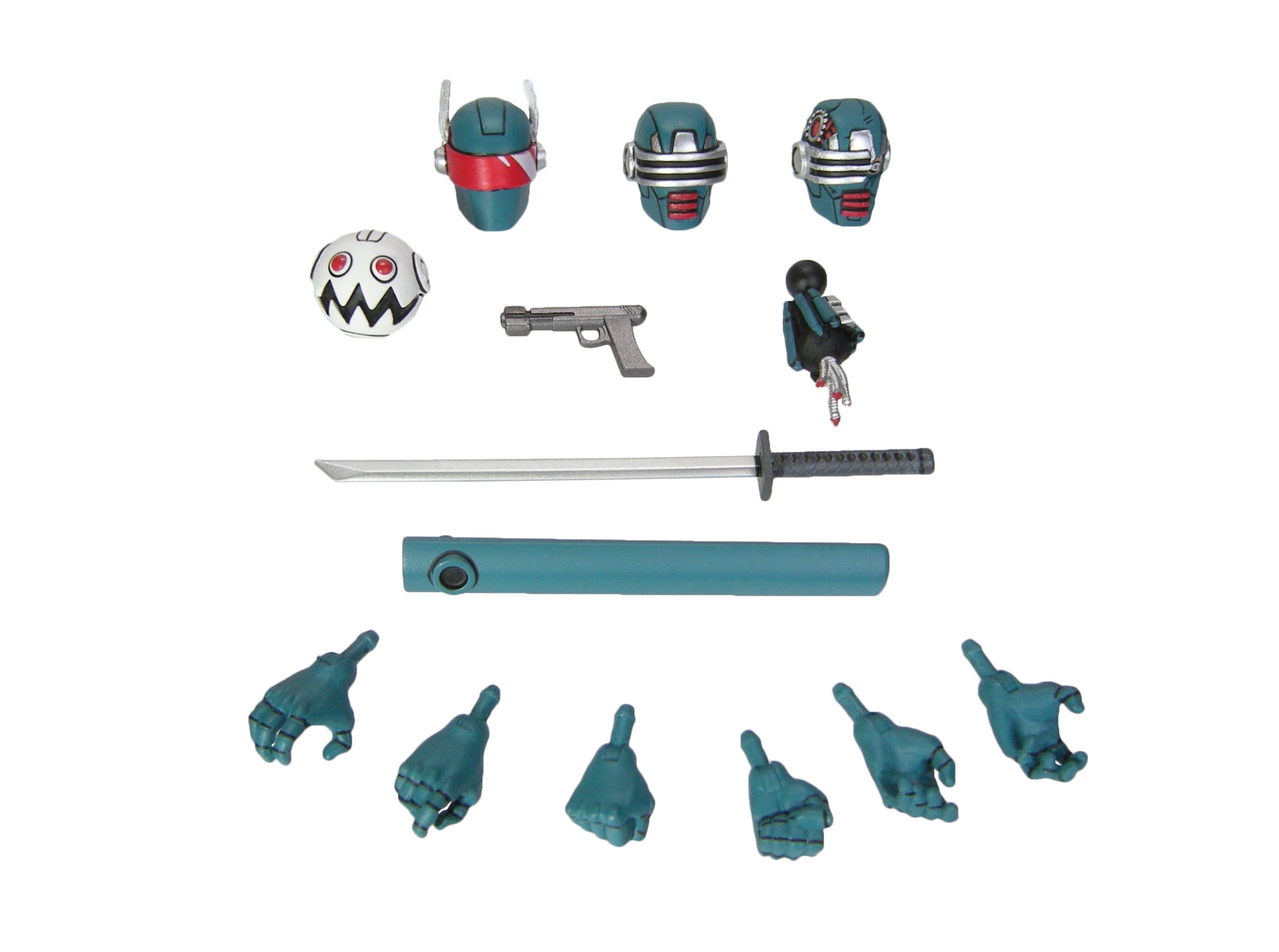 Notre robot synja est pourvu de nombreux accessoires. 15 en tout, auxquels s’ajoutent encore deux stickers à coller sur sa poitrine. Trois paires de mains interchangeables, trois têtes, un cou normal (absent de la photo ci-contre) et un cou arraché au corps, un pistolet, un sabre et son fourreau. Enfin, un Mouser en forme de tête.