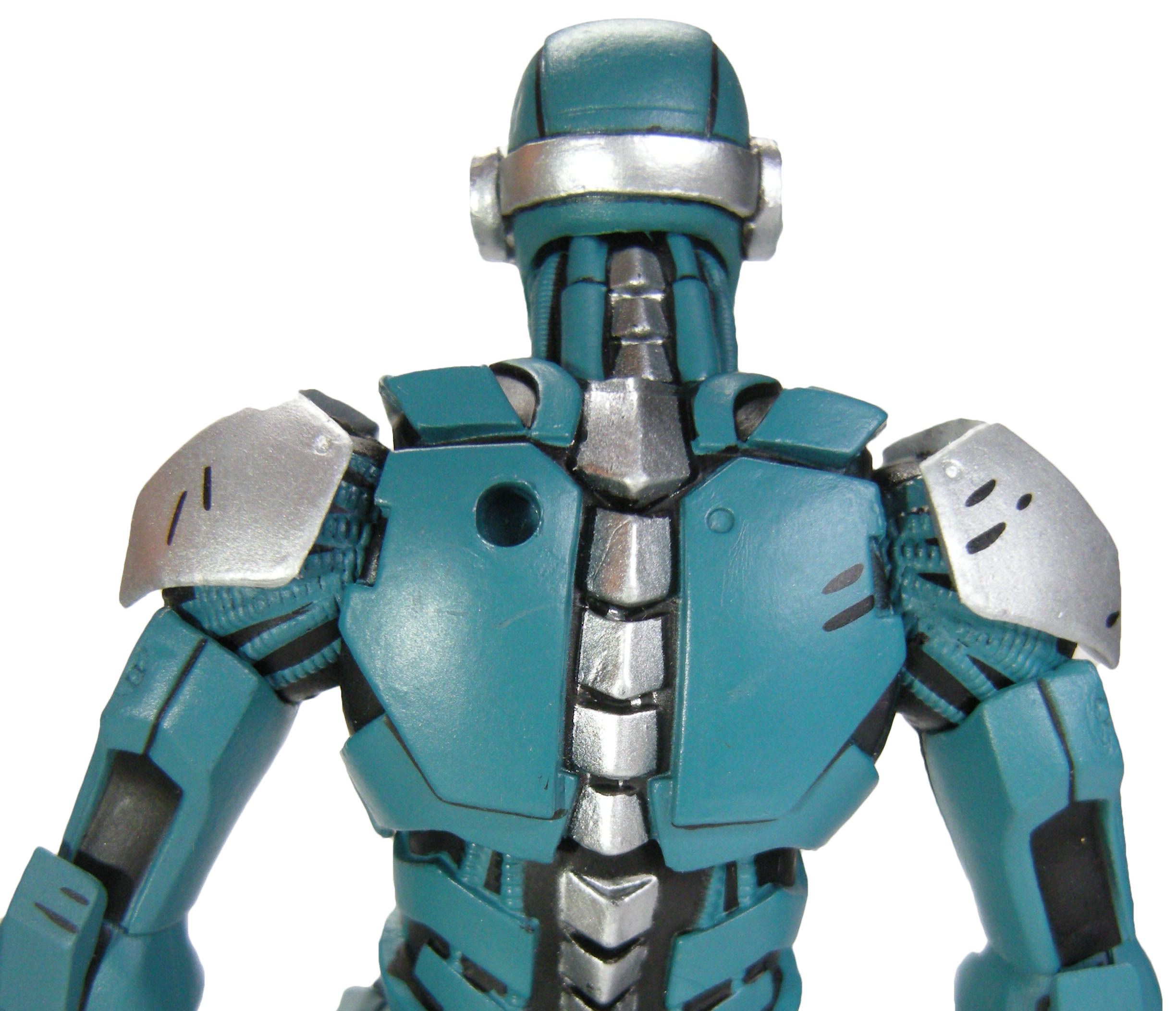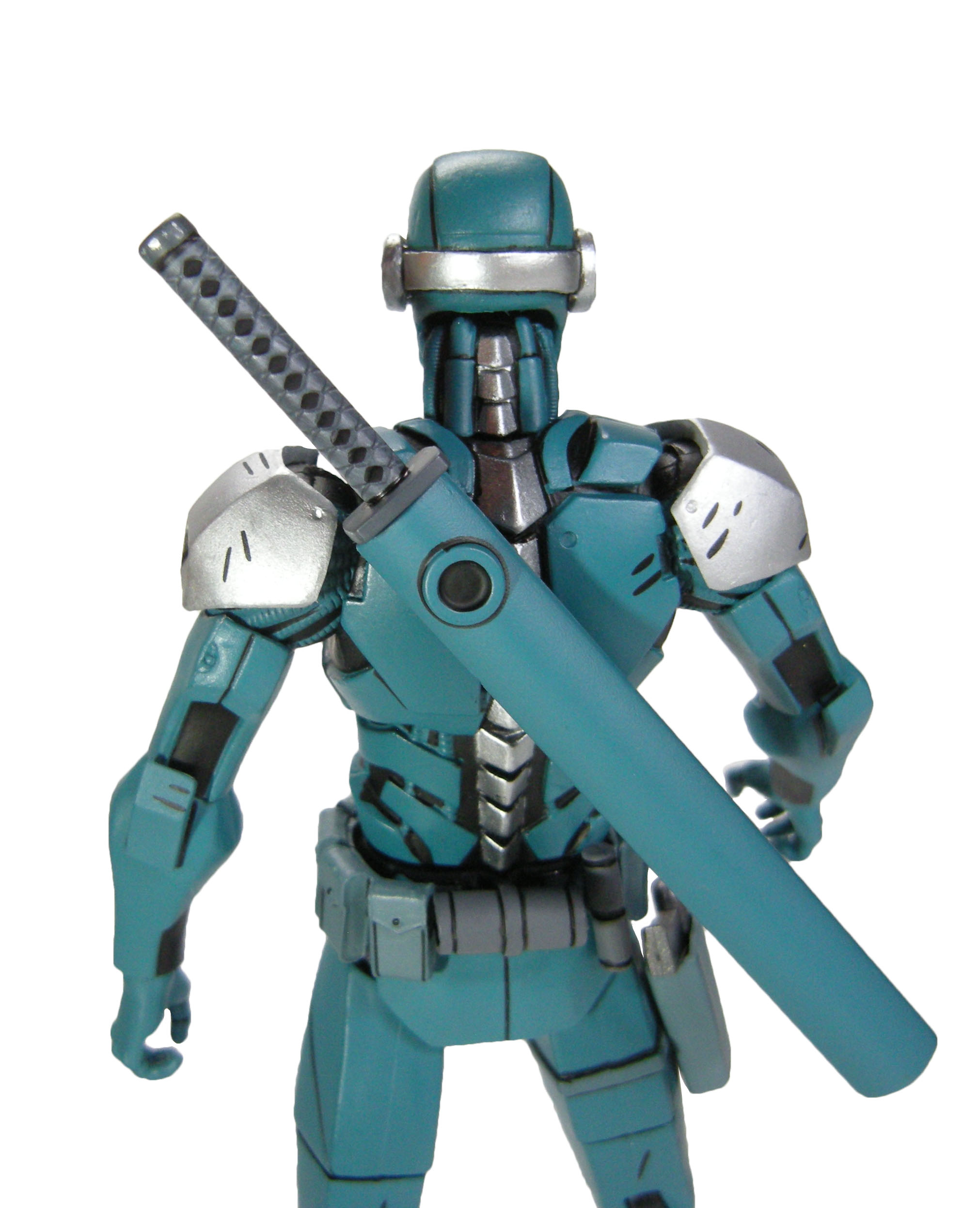 Nous avons cette armure de plaques laissant apparaître par endroits les câbles électriques et autres tuyaux au niveau des flancs et des bras. L’épine dorsale du robot est très finement représentée, partant de la nuque jusqu’au bas du dos. Un trou est réalisé dans l’omoplate gauche, pour y fixer le fourreau du sabre du personnage.