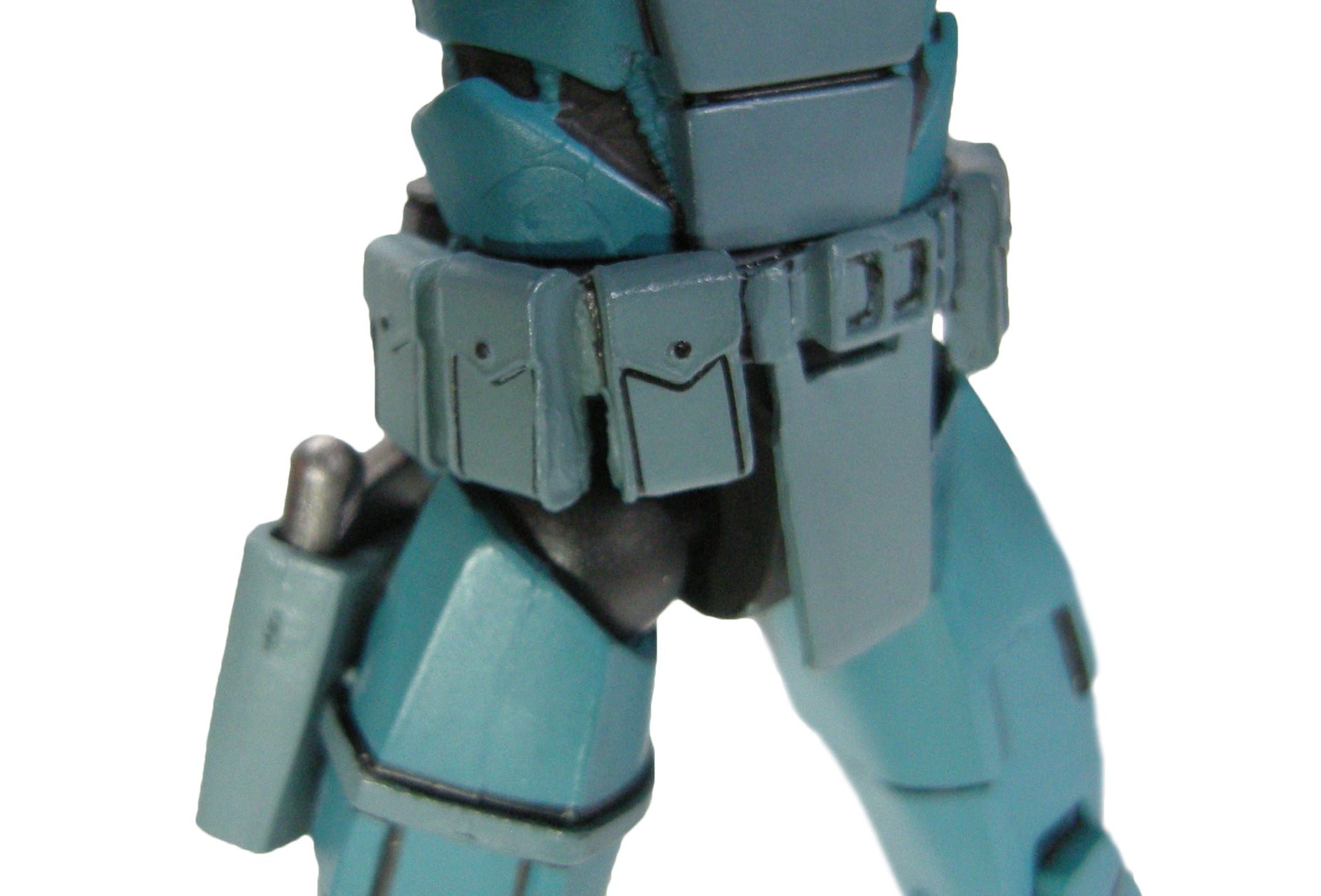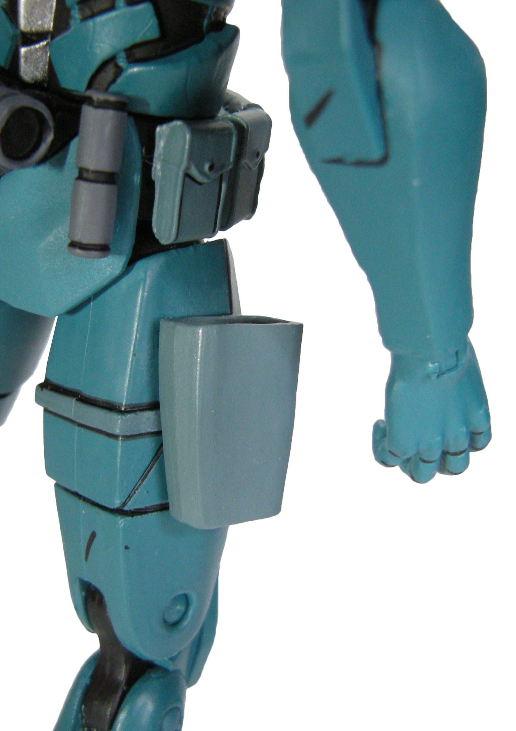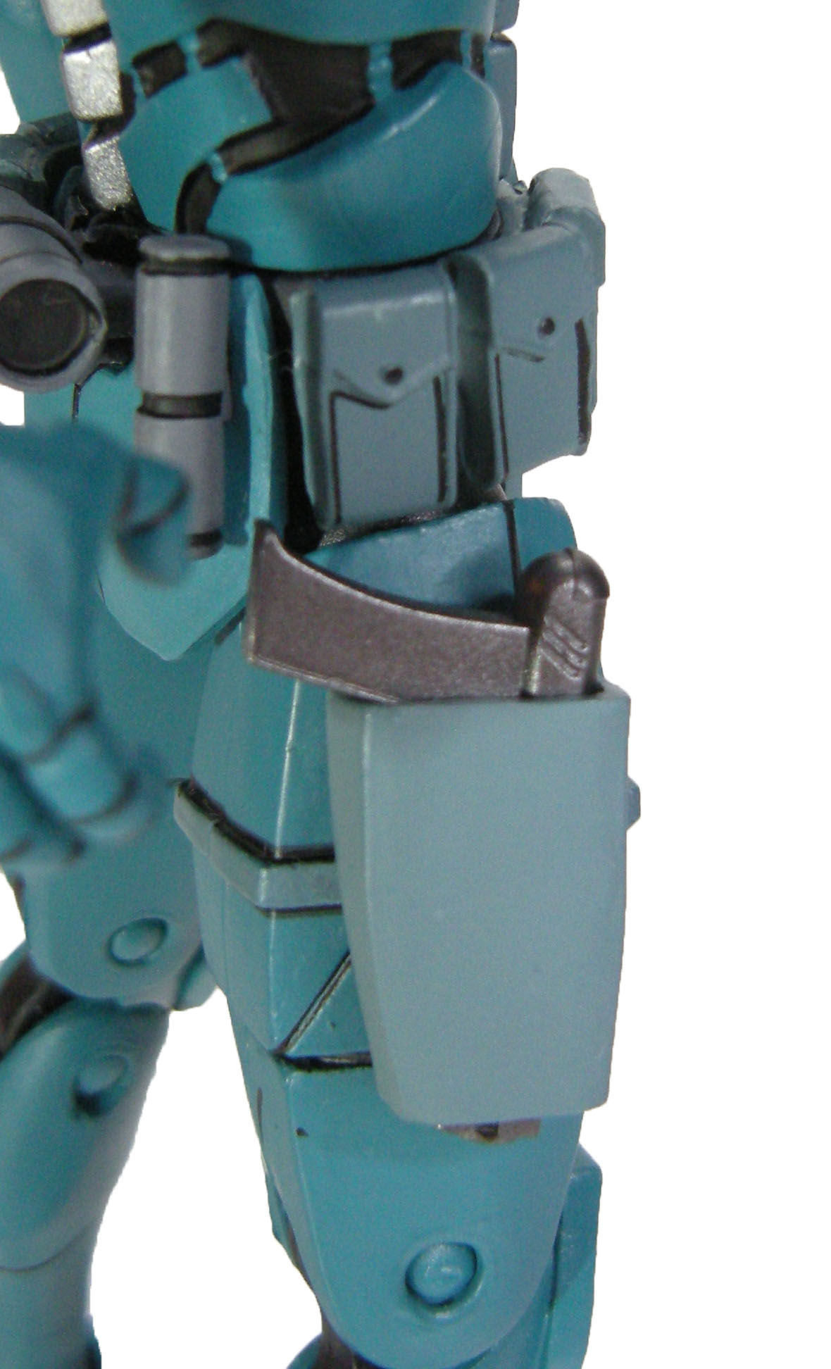 La peinture du synja est très simple. Un bleu pour l’ensemble du corps, avec un plastron plus terne, à l’instar de la ceinture et du holster. Ce sont surtout les petites finitions qui embellissent la figurine. Les touches de peinture métallisée relèvent les couleurs, aux épaulettes et au niveau de la visière des têtes alternatives. À l’arrière, c’est toute l’épine dorsale qui est métallisée. Les touches de noir font ressortir tous les détails. Au niveau de l’épine dorsale. Mais aussi entre les plaques d’armure, de tuyaux. De même à quelques endroits comme la poitrine ou les genouillères, pour simuler un effet d’égratignures. Les détails de la ceinture sont ainsi largement mis en valeur, avec les détails des pochettes et autres accessoires qui l’ornent.