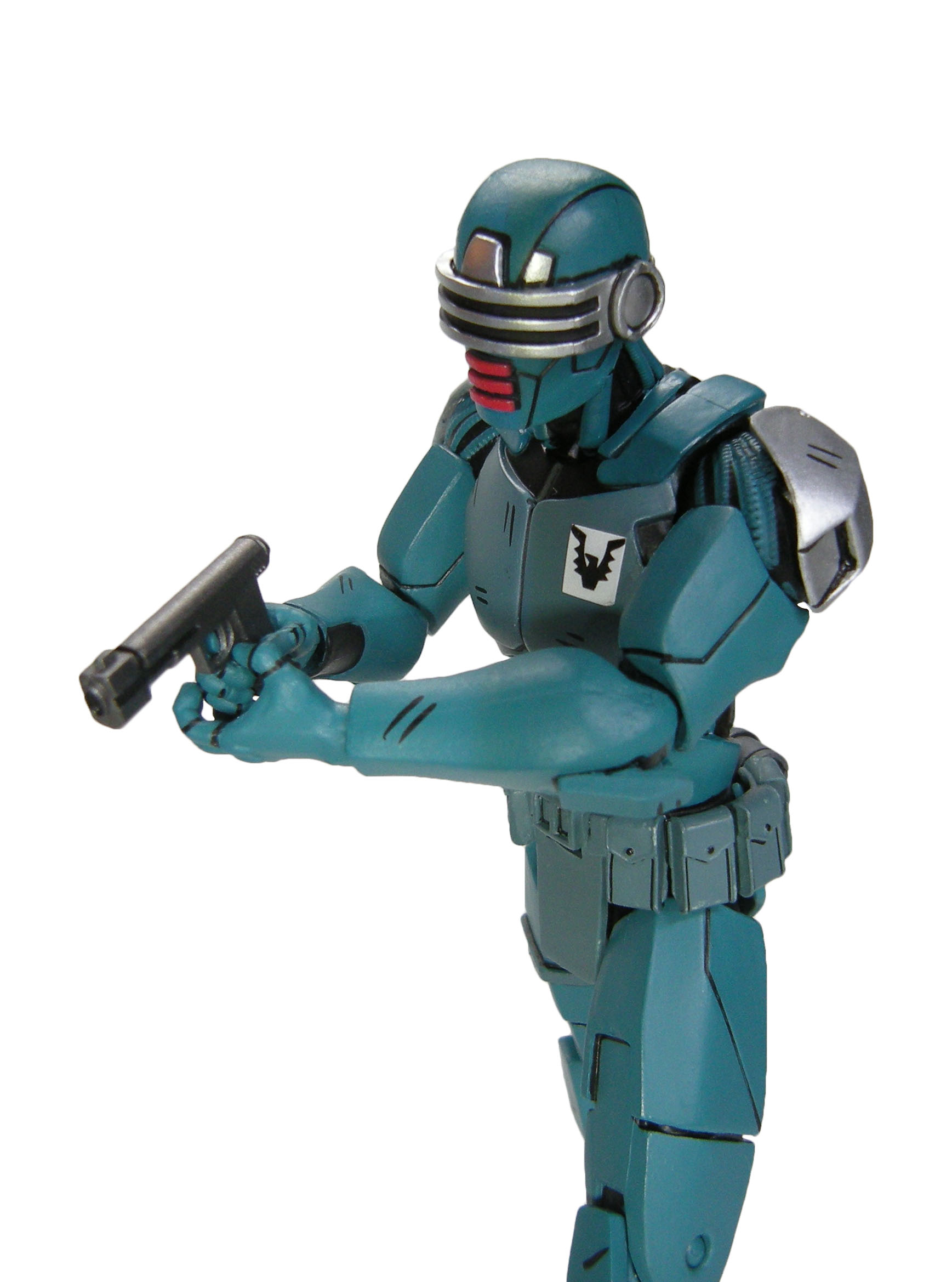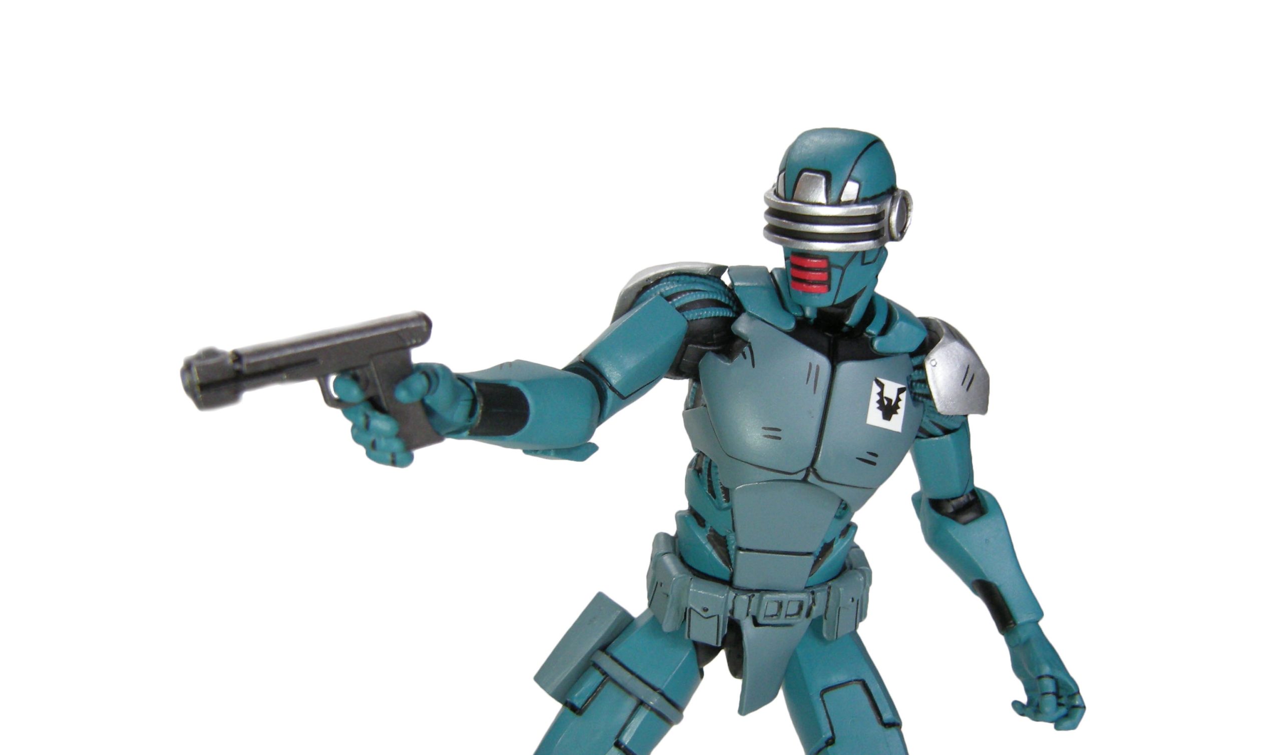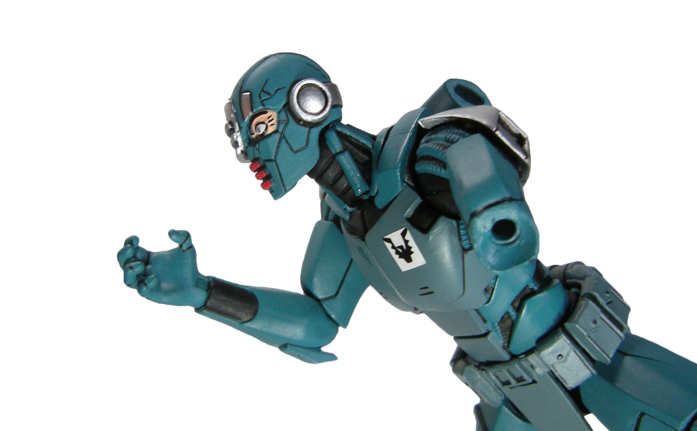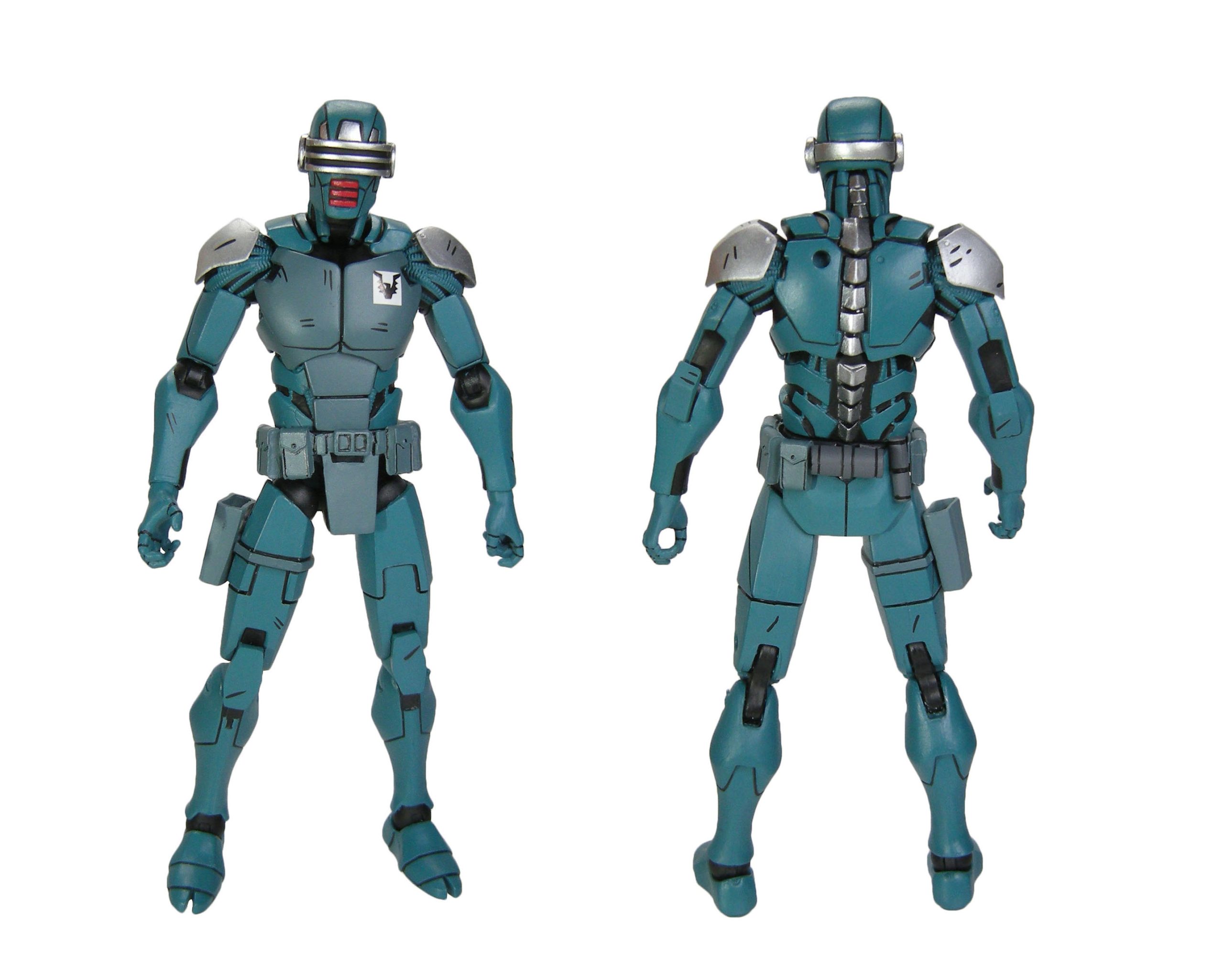 La peinture du synja est très simple. Un bleu pour l’ensemble du corps, avec un plastron plus terne, à l’instar de la ceinture et du holster. Ce sont surtout les petites finitions qui embellissent la figurine. Les touches de peinture métallisée relèvent les couleurs, aux épaulettes et au niveau de la visière des têtes alternatives. À l’arrière, c’est toute l’épine dorsale qui est métallisée. Les touches de noir font ressortir tous les détails. Au niveau de l’épine dorsale. Mais aussi entre les plaques d’armure, de tuyaux. De même à quelques endroits comme la poitrine ou les genouillères, pour simuler un effet d’égratignures. Les détails de la ceinture sont ainsi largement mis en valeur, avec les détails des pochettes et autres accessoires qui l’ornent.