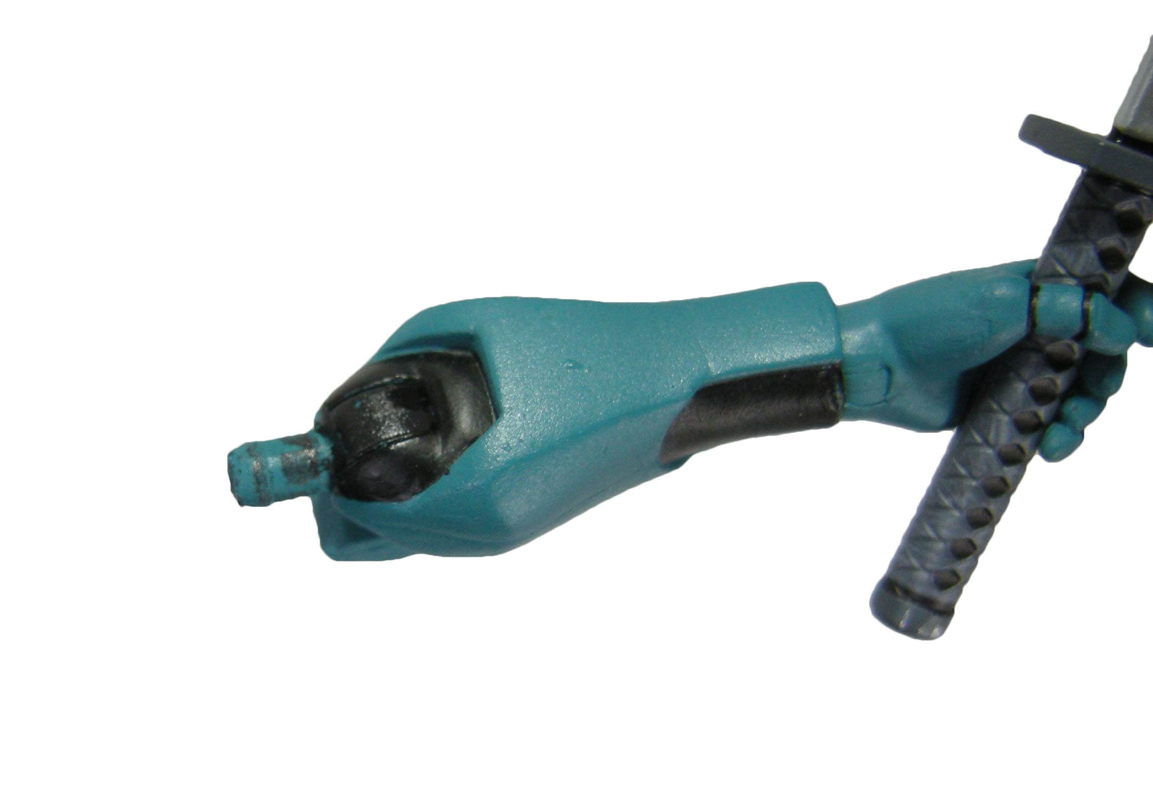 Les paires de mains du synja sont toutes symétriques entre elles. Nous avons une paire aux poings fermés, une paire permettant de tenir les armes et une paire aux doigts ouverts. J’aime particulièrement la paire qui tient les accessoires. Elle fonctionne très bien avec le pistolet, l’index étant un petit peu décoller des autres doigts. Mais la forme de cette main tient également à merveille le sabre, avec une légère inclinaison vers l’avant.