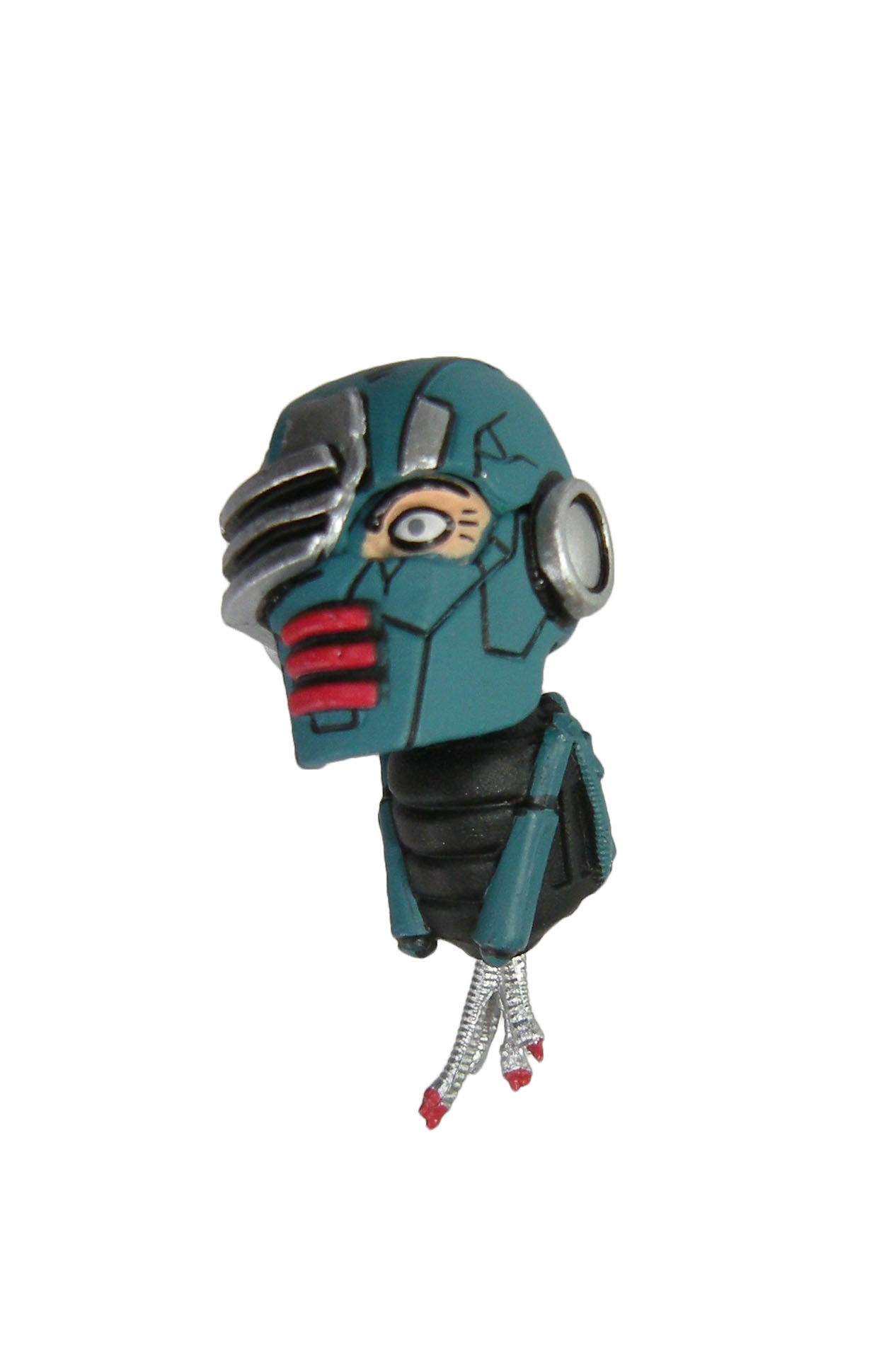La version classique rappelle beaucoup un Gi-Joe. L’autre version dispose d’antennes au-dessus des oreilles. J’ai trouvé très difficile le changement de tête sur un cou très étroit. Enfin, la troisième tête représente le synja au crâne défoncé par le dernier ronin lors de son premier combat, de retour à New York (The last ronin #1). Le casque est détruit en partie, laissant apparaître quelques circuits, mais aussi le visage au regard pétrifié de la machine. L’expression du visage est très bien reprise. À ces têtes, nous pouvons également rajouter un cou alternatif, à la suite de la décapitation de la tête du premier synja. Pas de sang, seulement quelques câbles à l’extrémité rouge.