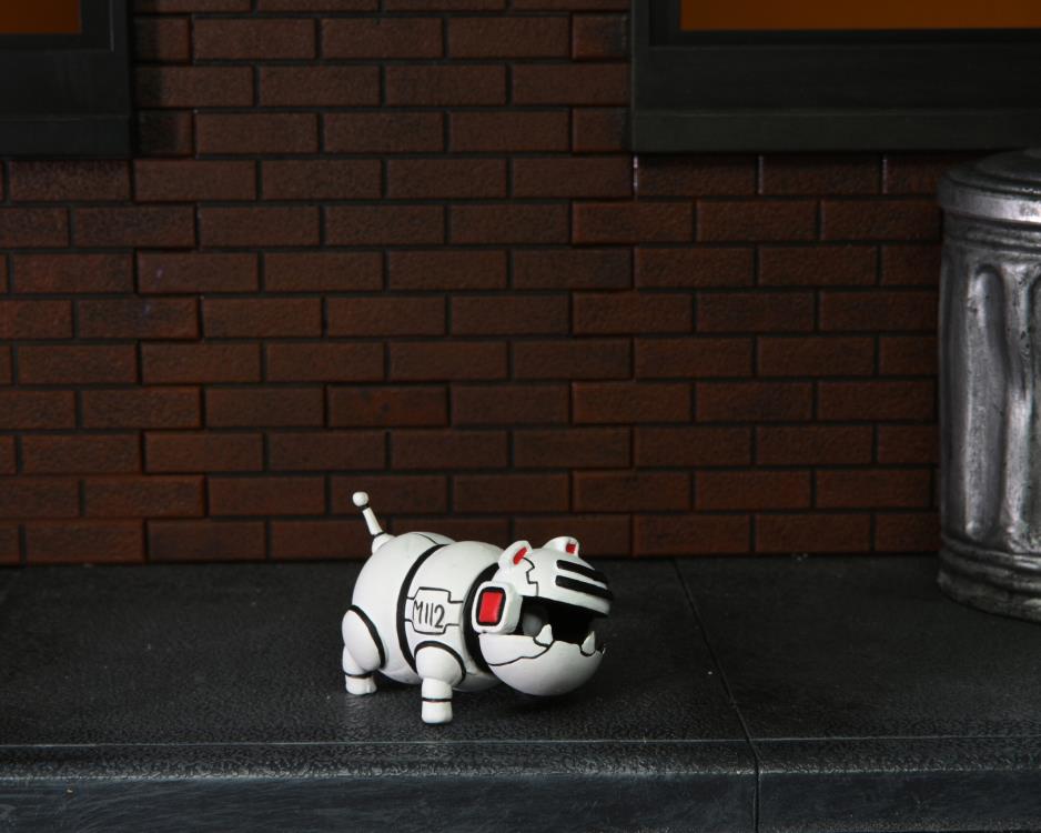 De nombreux accessoires sont réellement inédits. Nous avons quatre petites lames qu’utilise le ronin pour neutraliser un des robots de la tour Hiroto. Ils complètent donc les shurikens déjà proposés avec la première figurine. Au cours du combat, la tortue affronte également de nouveaux mousers à la forme très originale. Des sortes de chiens volants. Son rendu en figurine est vraiment très détaillé. Un vrai plaisir une fois en main ! Nous retrouvons même son numéro de série, M112, peint sur l’omoplate. Ni les pattes, ni la gueule ne sont articulées.