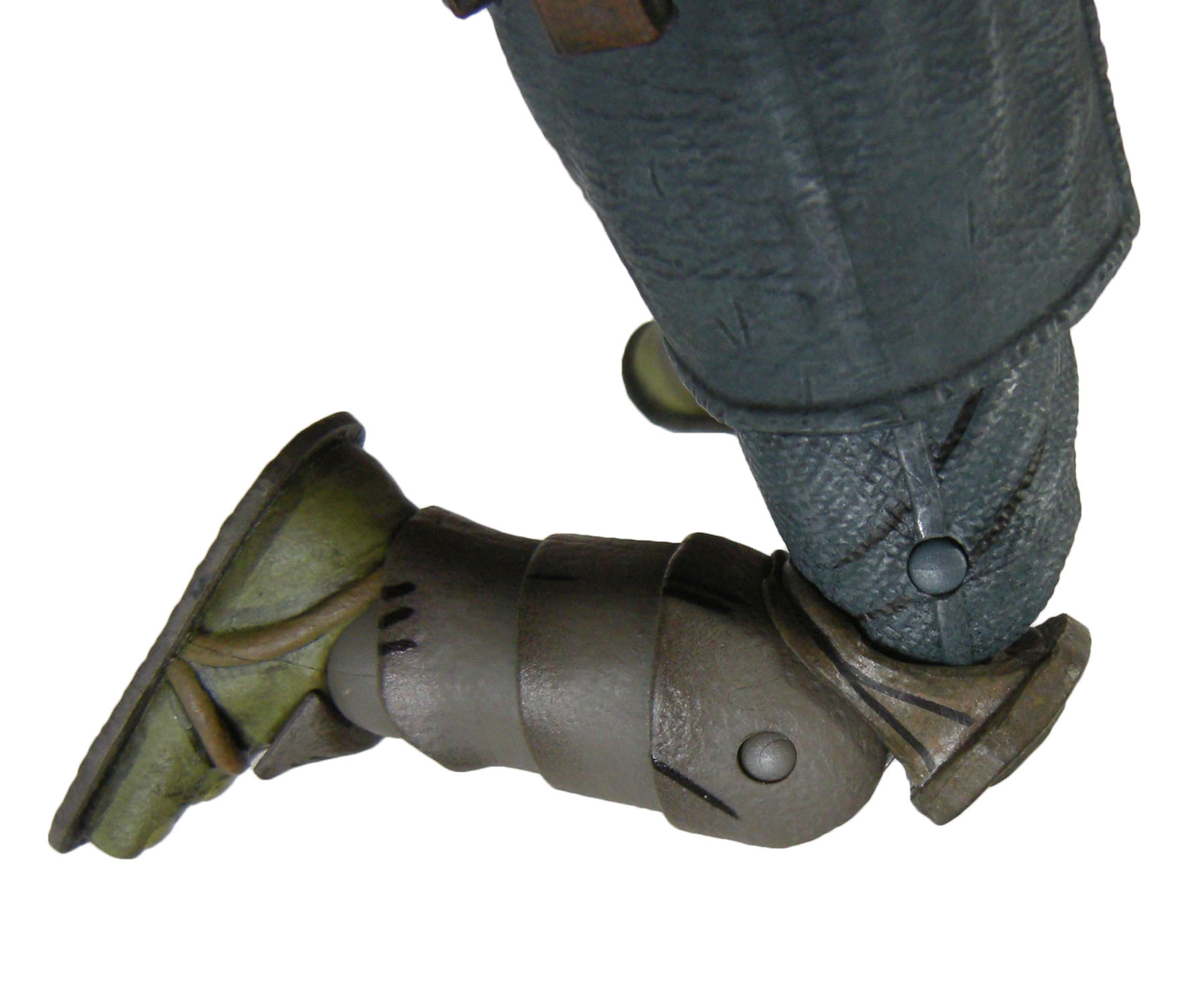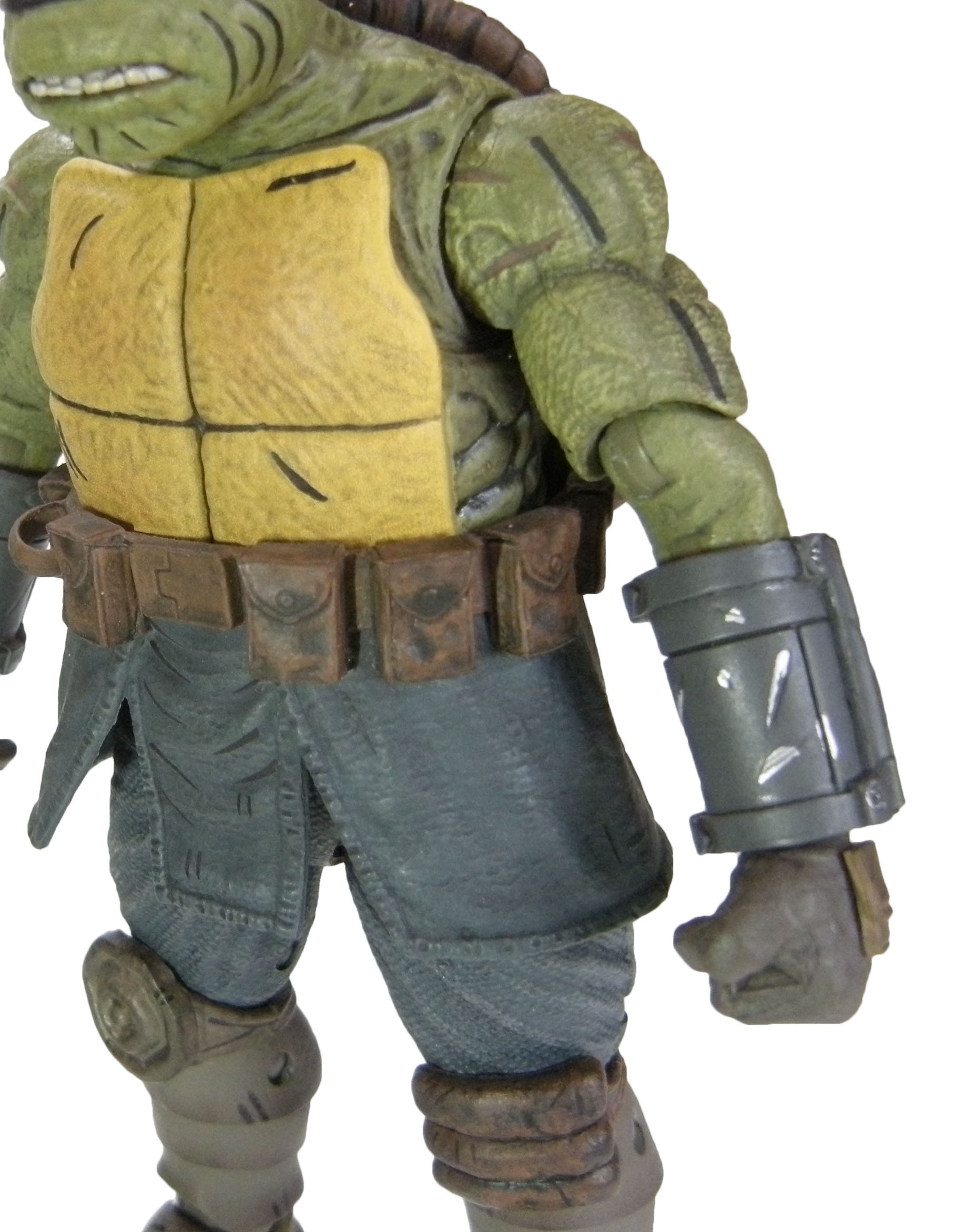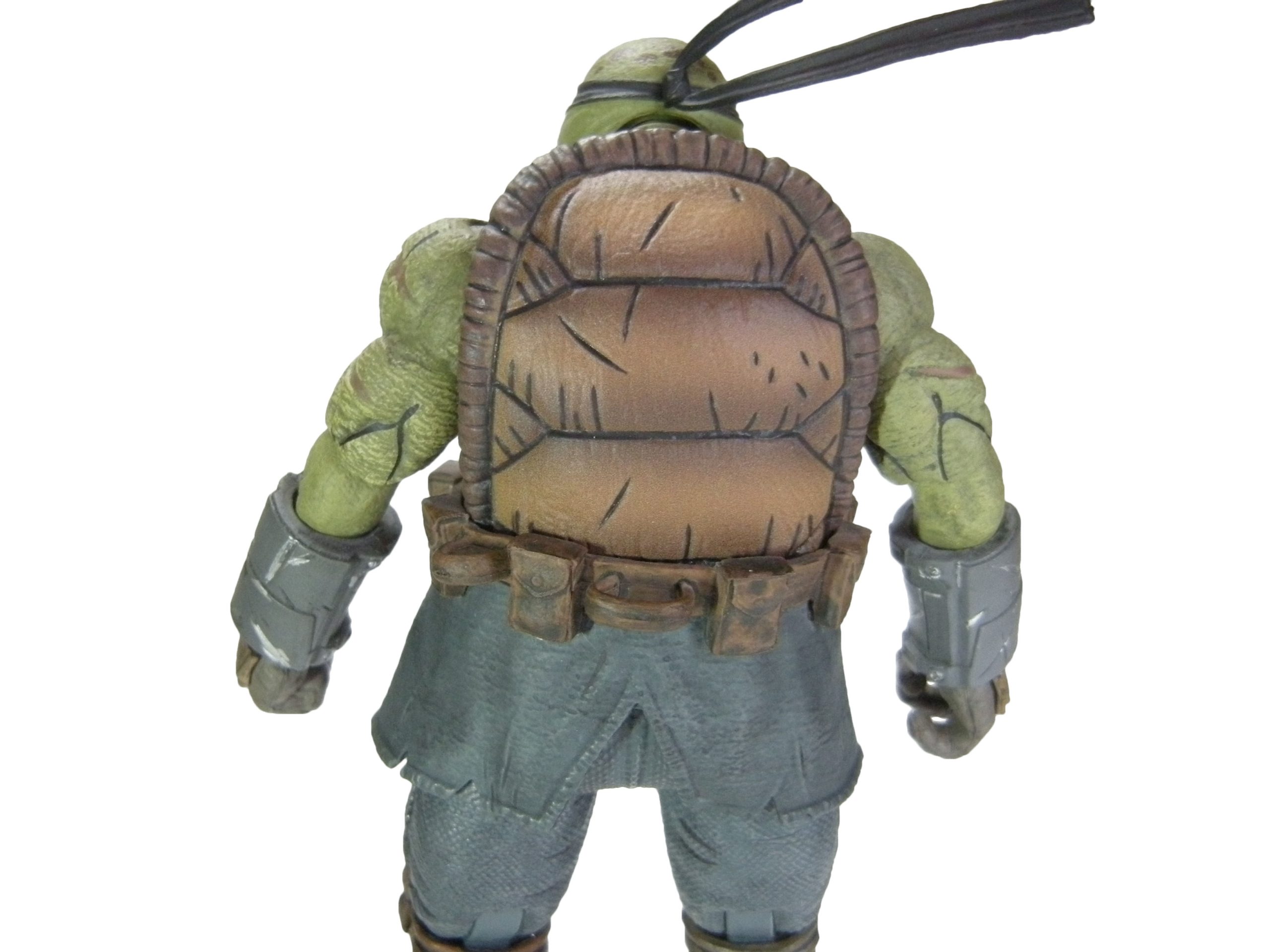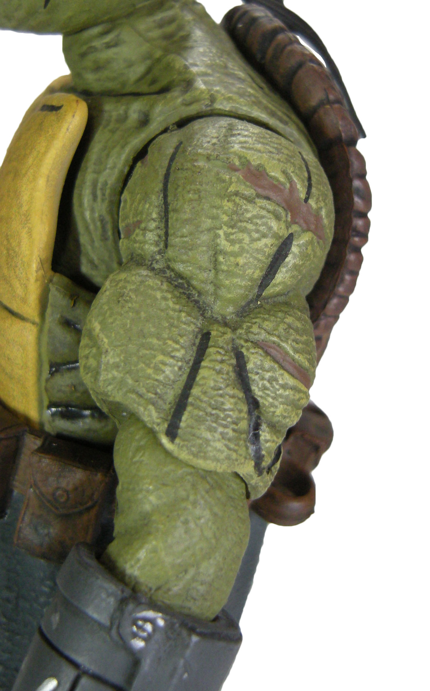 La coloration de la tortue est très bonne. Nous retrouvons le même traitement que celui proposé sur la première figurine au niveau des vêtements. Le travail de la peau est excellent et va de pair avec la sculpture texturée. L’ensemble confère à la figurine un aspect vieilli, éreinté par les années et les souffrances. Les muscles saillants sont brossés à sec d’un vert plus clair pour faire ressortir cette texture. Les muscles sont également mis en évidence par des traits noirs pour les accentuer. Enfin, les bras sont lacérés par de vieilles cicatrices tirant vers l’orangé.