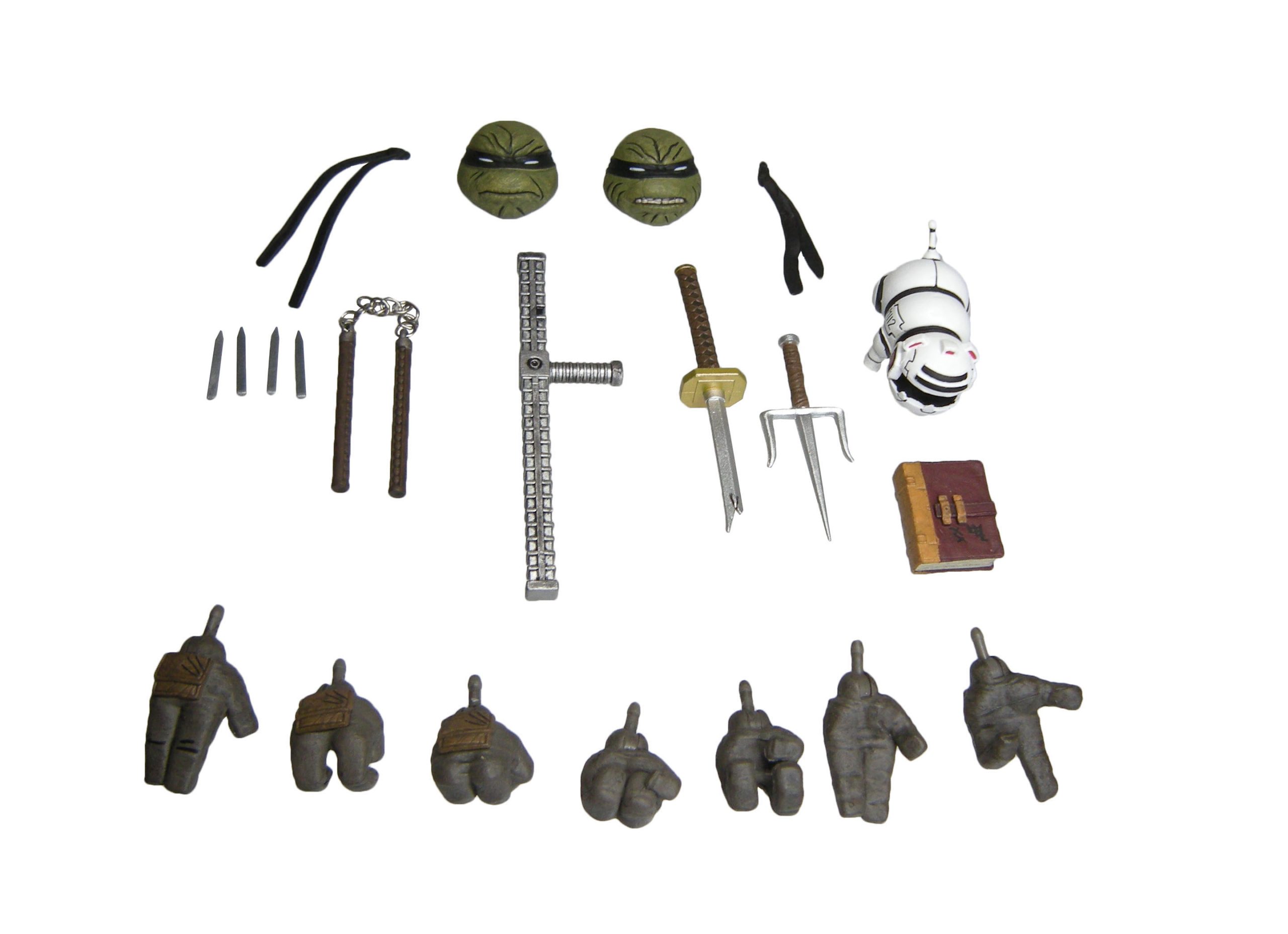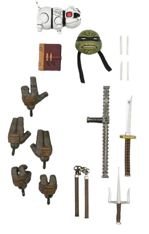 Une fois encore, NECA nous gâte ! Cette fois, la figurine n’est accompagnée « que » de 21 accessoires ! Alors hélas, une grande partie n’est pas inédite. Mais se complète parfaitement avec la figurine de The last ronin – armored. La plupart de ces accessoires fonctionnent plutôt avec cette autre figurine. Il faut bien reconnaître qu’il aurait été difficile de proposer un pack se contentant uniquement des dernières pages de The last ronin #1 !