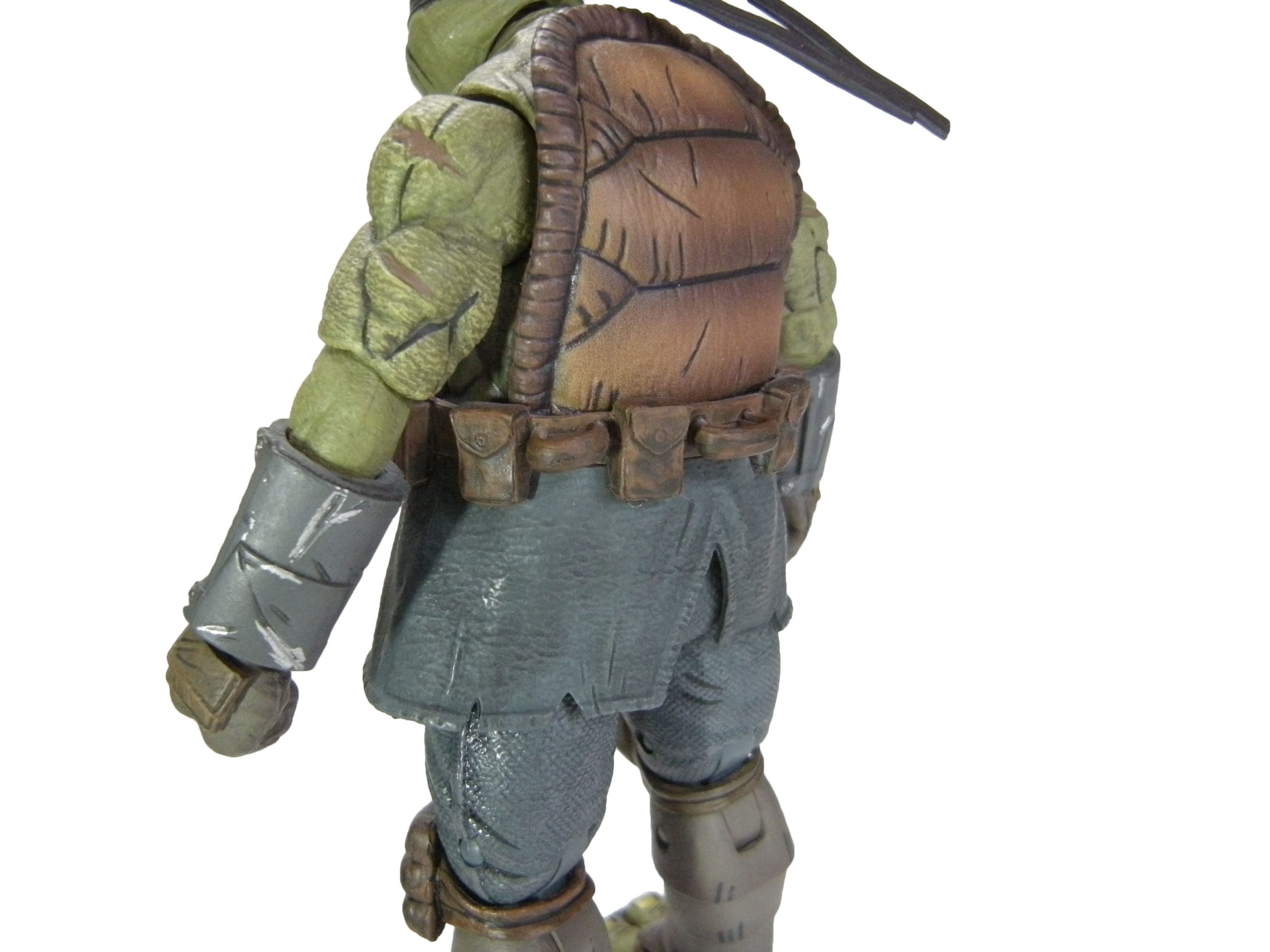 Le visage de notre personnage est toujours relativement arrondi, à l’instar des deux têtes interchangeables de la version armored. Le buste de la tortue est imposant. En revanche, la carapace manque cruellement de reliefs. Une fois en main, la figurine fait terriblement plate. Après avoir relu les pages de The last ronin #1, il apparaît que cette carapace est plus bombée que ça. Dommage, surtout pour une tortue !