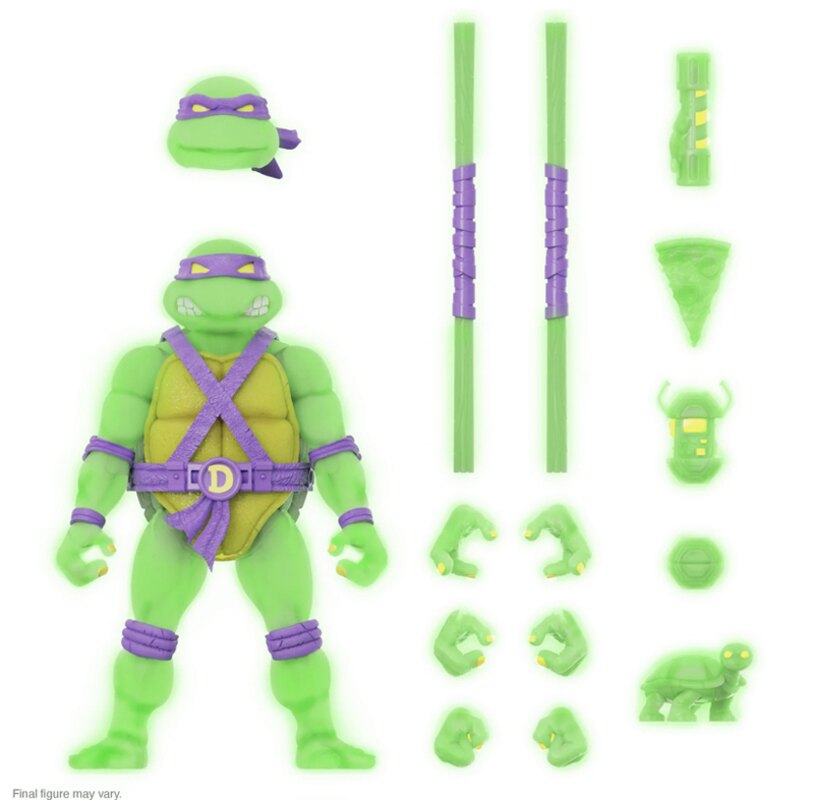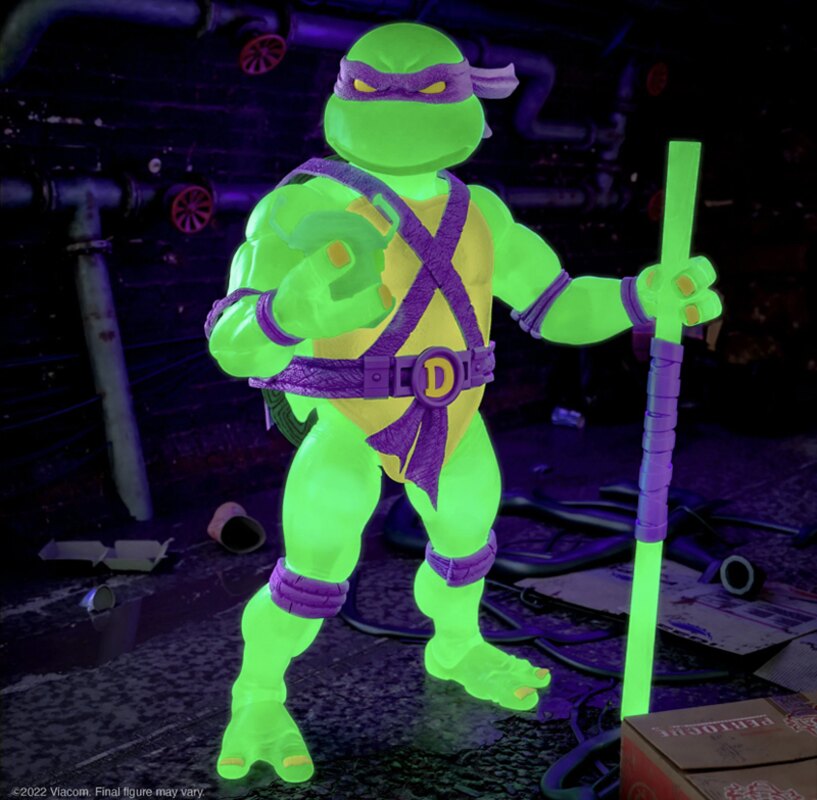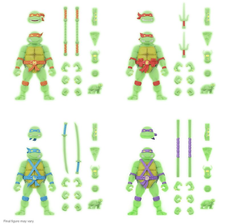 Après avoir proposé un grand nombre de figurines qui brillent dans le noir comme Baxter, Mutagen Man, Foot soldier et Muckman, Super7 a réédité ses quatre tortues des premières waves au format glow in the dark.