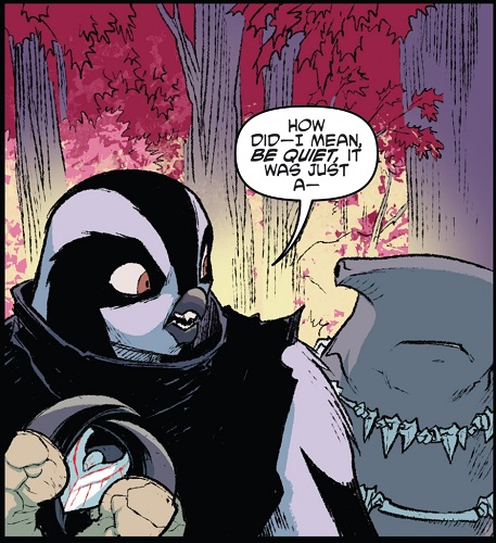 La terre en surface tremblait. Soudain, quelque chose en sortit. Ocho venait de creuser un tunnel pour laisser Karai et ses deux mutants sortir des souterrains. C’était déjà le petit matin, ils n’avaient pas vu le temps passer. Bludgeon remarqua que Koya s’était emparée d’un petit talisman en forme d’oiseau, qui ornait la paroi sur laquelle se trouvait l’épée des dieux dans la grotte. Ocho le savait et considérait cela comme une grave erreur, mais n’intervint pas. Le requin sentait quelque chose dans la taupe, il n’arrivait pas à lui faire confiance. Tôt ou tard, il savait que le yokai allait leur poser problème. Une tension naissait entre les deux forces de la nature, mais Bludgeon fut interrompu par une très forte odeur de sang.
