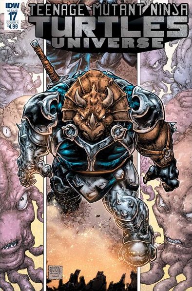 avait dans son viseur deux gardes utroms postés à l’entrée du palais de Krang. Elle commencerait son massacre par le fils de l’empereur. Une voix derrière elle, bien familière, lui demandait d’arrêter sur le champ. Il s’agissait de Zog, qui la connaissait par cœur et savait très bien où elle se trouverait après le message qu’elle lui avait laissé (TMNT Universe #16). Le général voulait voir de ses propres yeux ce dont Zom lui avait parlé. Ils devaient nettoyer également la salle des archives et réfléchir à l’avenir proche de leur espèce.