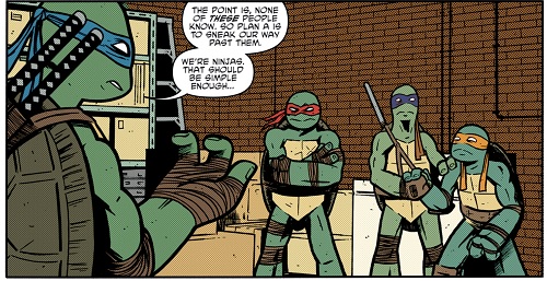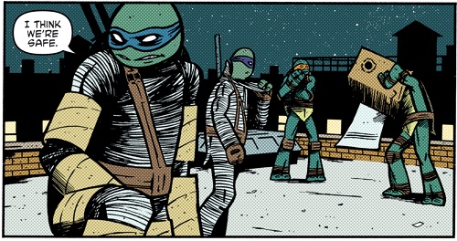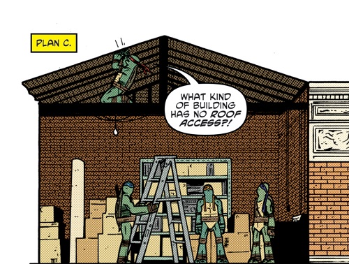 Les tortues étaient prisonnières de cet immeuble, à premières vues abandonné. Leonardo le reconnaissait, ce n’était pas le meilleur plan qu’il avait eu, loin de là. Ils ne devaient pas se faire voir des humains pour sortir de là. C’étaient des ninjas, cela ne devrait pas être trop difficile. Hélas, la pièce où ils se trouvaient était à la croisée de deux escaliers très fréquentés. Ils devraient tenter la discrétion autrement. Michelangelo leur proposa alors de se déguiser en monstres. Les enfants pensaient qu’ils en étaient, autant en profiter ! Raphael et ses deux frères préféraient élaborer un autre plan. Hélas aucun ne fonctionnait. Pas d’accès aux toits, les conduites étaient trop étroites pour leurs carapaces et Donatello s’était lancé dans la conception infructueuse d’une catapulte…