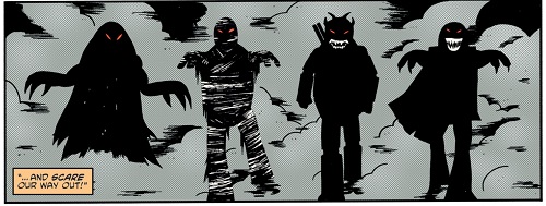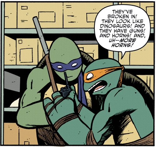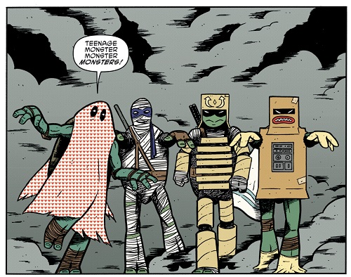 Les tortues dérobèrent un talkie-walkie à un policier avant de donner l’alarme, prétendant une invasion des triceratons de l’autre côté du bâtiment. L’aile qui les intéressait était à présent déserte. Ils n’avaient plus qu’à se déguiser. Tandis que les forces de police se déployaient, les tortues lancèrent des fumigènes et sortirent de leur cachette. Les enfants n’étaient pas loin et Todd saisit la jambe de Raphael, déguisé en robot tandis que sa sœur Haley lui aspergeait les yeux de vinaigre. Leonardo, déguisé en samurai zombie reçut une ventouse au visage avant que Todd ne règle son compte à Donatello. Se faire ridiculiser par des enfants ? Il était temps d’agir comme des monstres ! Les tortues prirent les choses en main et commencèrent à leur faire peur avant de prendre la fuite.