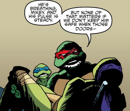 Les tortues luttaient contre le temps. Donatello respirait à peine et l’Earth Protection Force plaçait des explosifs aux portes pour pénétrer dans le T.C.R.I. Ils ne tardaient pas à laisser la voie libre aux soldats pour investir le bâtiment. Leonardo voulait partir avec Michelangelo à la recherche d’April pendant que Raphael se cachait avec leur frère inconscient afin de gagner du temps.