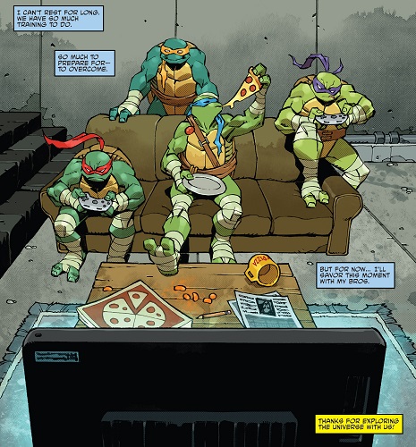 Ouvrant les yeux, il était toujours dans ses appartements, dans le repaire. Il sentait encore la présence néfaste de Kitsune autour de lui. Sortant de sa chambre, il trouva Michelangelo, qui s’empiffrait de chips. Voyant son frère affaibli, il vint à son chevet. Les deux autres tortues arrivèrent pour lui remonter le moral. Donatello et Raphael allaient faire une partie de jeu vidéo. Michelangelo proposait à Leonardo une tranche de pizza pendant ce temps. Ils avaient encore beaucoup à s’entraîner, mais pour le moment, la tortue voulait surtout savourer cet instant.