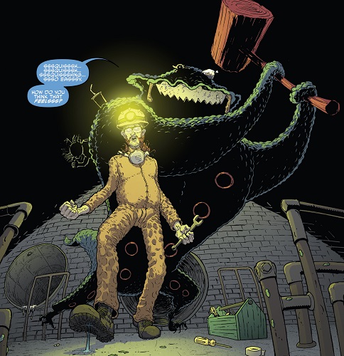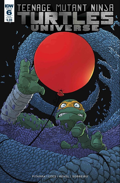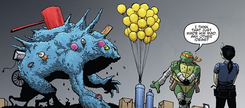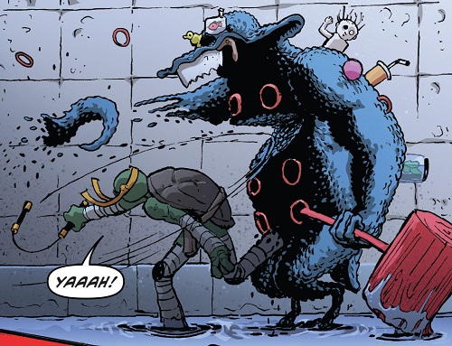 Tandis que le duo progressait dans les couloirs sombres, faisant connaissance, un ballon rouge rattaché à quelque chose dans l’eau les suivait. Soudain, la créature attrapait la jambe de Maureen. Michelangelo essayait de partir la sauver mais une main géante émergeait pour l’en empêcher. Très vite, quelque chose encerclait la tortue avant de prendre une forme étrange. Une créature munie d’une masse sortait de l’eau pour faire face à la tortue.