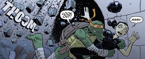 Michelangelo revenait au repaire après avoir acheté une pizza à Woody. Progressant dans les égouts, il se rendait compte que les parts n’étaient pas divisibles par quatre. Il en prenait une avant d’être interrompu par un bruit. Une plaque d’égout était soulevée au-dessus de sa tête, quelqu’un descendait. L’adolescent avait à peine le temps de se cacher, laissant la pizza au sol. Il s’agissait d’une policière qui était attirée par l’agréable odeur dans ce monde putride. Arrivée à la pizza, elle constatait qu’elle était encore chaude et qu’une part était absente… Continuant son chemin, la tortue préférait suivre la femme par prudence. Avec les agents fédéraux à leurs trousses (The war to come) il était préférable de savoir ce qu’elle faisait dans les égouts. Son comportement hasardeux n’avait rien de suspicieux. S’aventurant dans une partie fragilisée des égouts, Michelangelo sautait sur elle avant qu’une voûte fragilisée ne l’écrase.