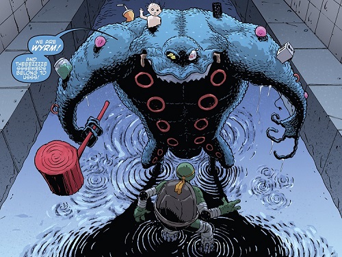 Elle disait s’appeler Wyrm et que les égouts lui appartenaient. Continuant de s’avancer vers Michelangelo, ce dernier lui assénait un coup de pied, craignant le pire venant de cet étrange monstre. Son pied restait bloqué dans la nuée de vers plats qui composaient le corps de Wyrm. Essayant de se dégager, il donnait un coup de nunchaku dans le long bras du mutant qui étreignait déjà son cou. Le membre partit en morceaux, arraché par l’arme de la tortue. Toujours le pied bloqué dans son ventre, la créature composite lui donnait à son tour un coup de masse. Le ninja terminait dans un mur. Wyrm s’avançait toujours vers la tortue et lui racontait qu’il observait sa famille depuis très longtemps, pendant leurs moments de bonheur comme de peine, et même leurs entraînements. Ses vers plats étaient partout et savaient tout. Michelangelo peinait à se relever lorsqu’il fut frappé au ventre une nouvelle fois par la masse du mutant. Traversant le mur, il eut à peine le temps de se cacher dans l’eau et de nager le plus loin possible pour échapper au monstre.