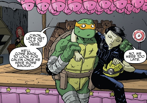 La tortue entrait dans une vaste pièce où étaient entassés des milliers d’objets en tous genres, des peintures ornaient également les murs. Sur un stand de fête foraine se trouvait Maureen, que Michelangelo venait sauver. Elle gardait entre ses mains le casque de Calvin, fracassé en son sommet et tâché du sang. Ils étaient arrivés trop tard. Profitant de l’instant triste, Wyrm frappait un grand coup de massue sur le stand. Heureusement Maureen avait poussé son ami à temps.
