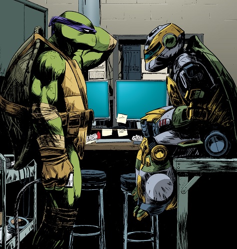 Dans son laboratoire, Donatello faisait chauffer ses neurones pour les derniers ajustements à mener sur Metalhead. Il était bien décidé à ramener la tortue robot à la vie ; il serait un allié précieux face aux nouvelles menaces qui les entouraient. Hélas, la création du professeur Lillja ne s’activait pas. Vérifiant quelques réglages, il ne restait plus qu’à frapper sa tête espérant qu’il réagisse.
