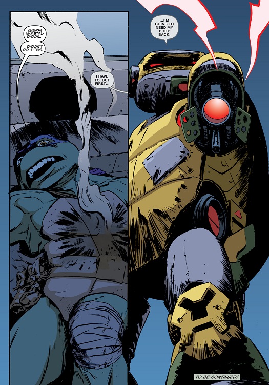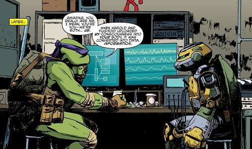 Installés tous deux dans son laboratoire, Donatello soumettait le robot à une batterie de tests. C’était prodigieux ! Le robot avait conservé la conscience de Donatello lorsque Honeycutt et Harold l’avaient transféré pour sauver la tortue après son accident (TMNT (Vol. 5) #45). Lorsque celle-ci avait été replacée dans son corps naturel, les données numérisées étaient restées dans Metalhead (TMNT (Vol. 5) #50). Le robot ne supportait pas l’idée de n’être qu’une copie. Donatello cherchait à le rassurer, il était bien réel. Dans un sens, c’était comme si sa vie était restée figée après son autodestruction (TMNT (Vol. 5) #50) jusqu’à aujourd’hui. Donatello était donc dans un sens sa version du futur. Mais doué d’une forme de conscience, Metalhead pouvait très bien vivre de lui-même et développer une histoire toute différente.