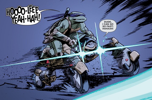 Donatello raconte sa rencontre avec le Donatello du futur (Turtles in time #4) comme si Metal-Don n’avait pas vécu cet épisode de sa vie. Pourtant, le transfert de conscience s’est fait quelques temps après cette aventure.