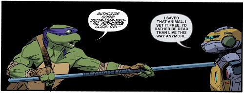 Le robot se souvenait des moments passés dans ce zoo. Tandis que Donatello contemplait un petit singe, Metalhead regardait l’enclos d’un rhinocéros. Approchant sa main de son museau, il ne pouvait que sentir de l’empathie pour l’animal qui, tout comme lui, était piégé contre son gré. Touchant sa corne, il eut un flash, voyant Rocksteady éclater sa carapace avec son arme. La tortue était soudain alertée par un bruit métallique ; Metal-Don avait brisé les barrières de l’enclos et venait de tirer sur le rhinocéros, prétextant sa libération. Dans le fond, il aurait adoré qu’on l’achève pour le libérer à son tour. Donatello brandissait son bâton qu’il posait contre le torse du robot pour le tenir à distance et ordonna son extinction. Le code vocal ne fonctionnait plus. Les yeux de Metal-Don étaient redevenus rouges. Il tirait sur la tortue une première fois avant de pointer de nouveau son arme vers elle. Il était bien décidé à reprendre son corps…
