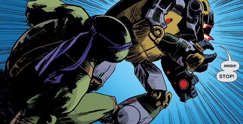 était toujours tenu en joue par Metal-Don. Alors que la tortue le suppliait d’arrêter, le robot avait plusieurs visions. Celles de Bebop et de Rocksteady dans un premier temps qui se félicitaient du carnage qu’ils lui avaient causé (TMNT (Vol. 5) #44), puis de ses frères et de son père à son chevet, priant pour qu’il survive au drame qui l’avait touché (TMNT (Vol. 5) #45). Soudain, Metal-Don retira son arme de sa cible. Pris de remords il explosait un mur de son laser pour prendre la fuite à travers la ville, tandis que Donatello cherchait à le retenir.