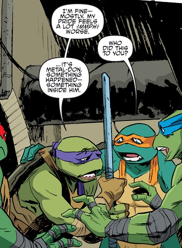 Au repaire, Leonardo et Raphael s’acharnaient au combat sur une partie de jeu-vidéo. Michelangelo était assis entre ses deux frères sur le canapé. Il réfléchissait à la situation du robot qui le peinait. Alors que Leonardo lui tendait la manette pour le reprendre, Donatello faisait irruption. La tortue s’appuyait péniblement sur son bâton et arborait une marque de brûlure sur le plastron. Les trois frères le voyant se jetaient sur lui pour savoir ce qu’il s’était passé. Il comprenait ce qui était arrivé à Metal-Don, dont les pensées étaient bousculées par sa situation dramatique. Au-delà de ça, le robot devait souffrir d’un dysfonctionnement. Si Raphael rêvait d’en faire de la taule froissée, le bricoleur était plus préoccupé à parvenir à relancer le programme de sa création afin d’essayer d’en sauver sa conscience prisonnière à l’intérieur. Il savait parfaitement comment le retrouver, Metalhead était équipé d’un traceur GPS. Les tortues n’avaient plus qu’à se lancer au travail.