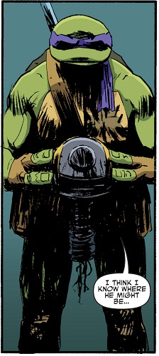 De retour au repaire, Donatello était reparti dans son atelier, le corps de Metalhead placé contre un mur. La tortue était toujours abattue. Ses frères voulaient lui parler mais ne savaient pas comment aborder le sujet. Il avait perdu une partie de lui-même dans un sens. Finalement, seul l’innocence et la joie de vivre de Michelangelo pouvait arranger les choses. La tortue entrait dans la pièce pour lui remonter le moral, ses deux frères derrière lui. Ils lui proposaient une petite escapade nocturne pour se changer les idées et se dégourdir les jambes. Finalement n’était-ce pas là une excellente idée plutôt que de ruminer seul dans cette pièce sombre à côté d’un tas de ferraille ? Donatello se disait que la vie valait d’être vécue. Ils partaient tous les quatre.