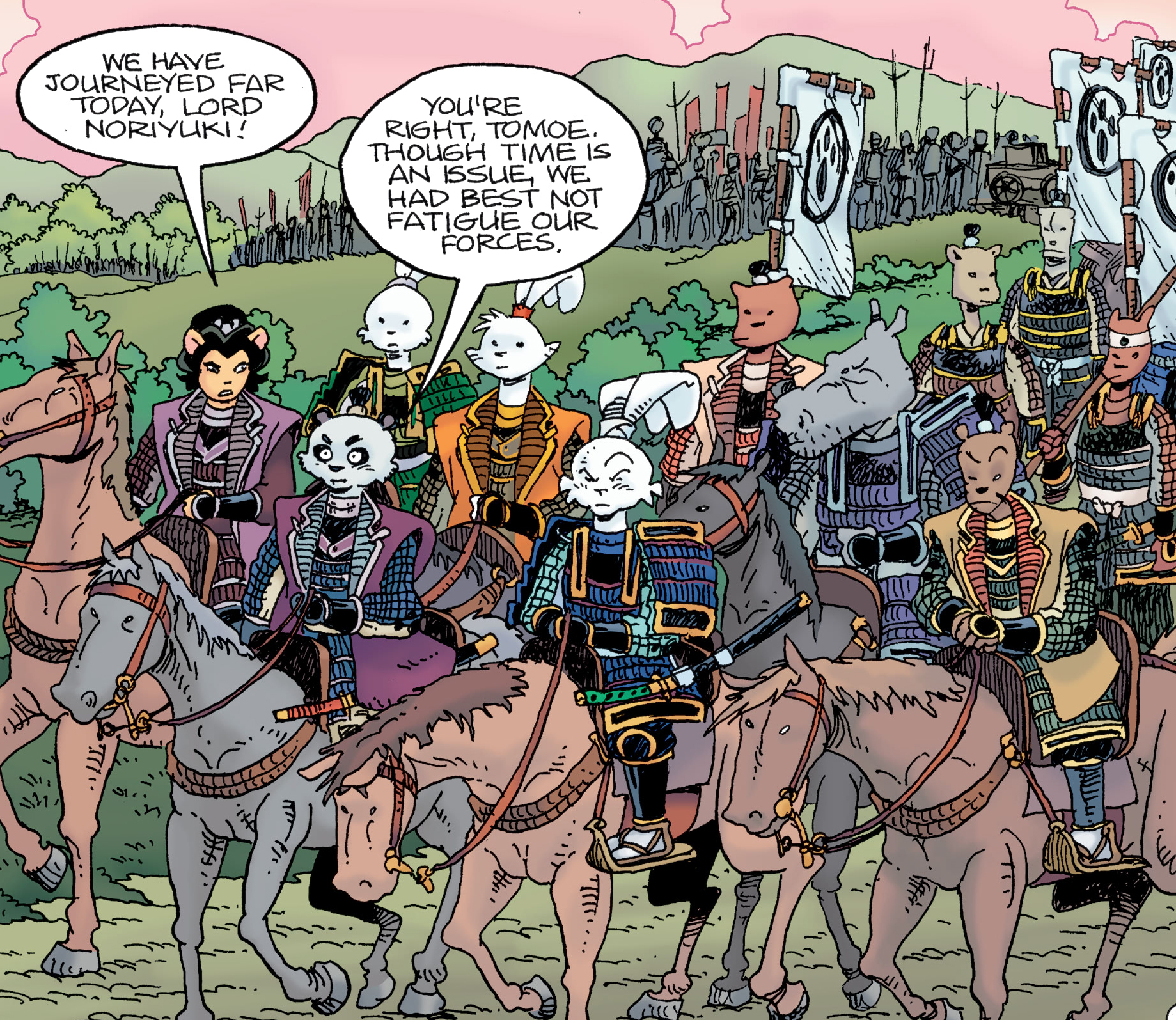 Une armée montée se préparait à livrer bataille au seigneur Hikiji. À sa tête, le seigneur Noriyuki, secondé par Miyamoto Usagi et Tomoe Ame. Cette dernière suggérait au Tono de faire une halte pour la nuit. Inutile de prendre des risques à la veille de la guerre qui devrait décider leur sort à tous.
