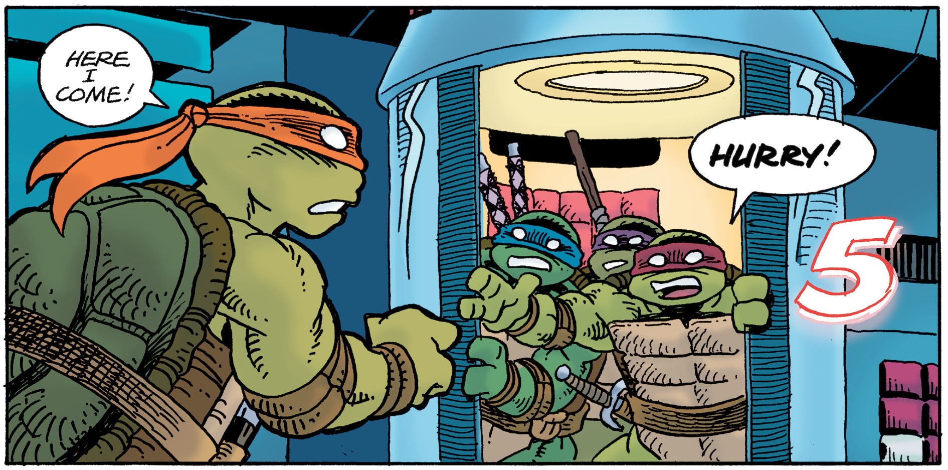 Les tortues supposaient qu’il était parti dans le passé. Si Michelangelo était satisfait de l’issue de ce combat, ses frères lui signalaient que la situation n’avait rien de rassurante. Il pouvait tout à fait effacer des évènements historiques. Il pouvait même les tuer avant qu’elles ne sachent se défendre. Donatello s’empressait de configurer la machine pour les envoyer dans la même époque que lui. Ouvrant la porte de la chambre, les tortues se mettaient en place. Michelangelo était le dernier à gagner le caisson. Se retournant, il voyait une étrange scène. Trop saugrenue pour être vraie. Mais le passé avait peut-être déjà commencé à être modifié …