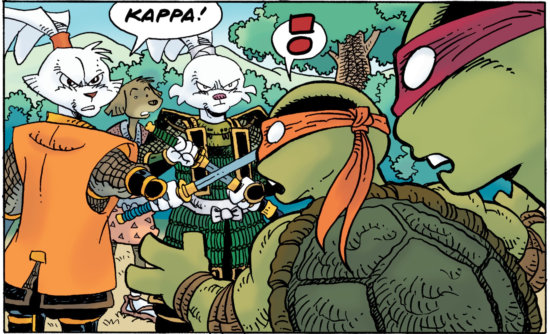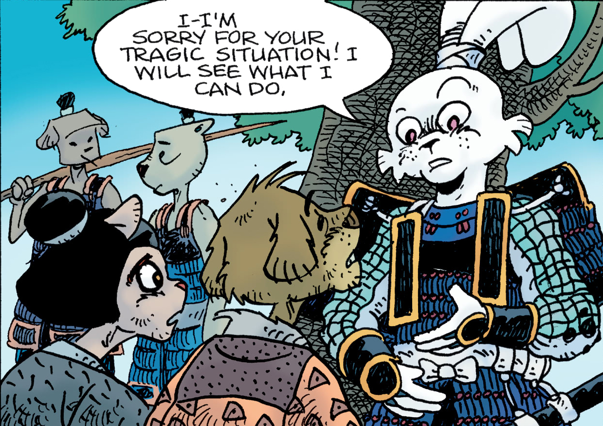 Les tentes étaient dressées, les armures déposées. Soudain, Usagi fut interrompu par deux paysans qui se prosternaient à ses pieds. Ils lui demandaient de venir à bout d’un kappa qui terrorisait les alentours et qui tuait de plus en plus de villageois aux abords de la rivière. Si Usagi était réticent aux premiers abords, trop concentré dans la guerre qui les guettait, le désarroi des deux paysans le saisissait. Il s’en allait en parler au seigneur Noriyuki, en pleine réunion avec ses généraux pour dresser le plan d’attaque. Le Tono était naturellement contre l’idée de perdre du temps. Usagi avait jusqu’à la tombée de la nuit pour mener son investigation. Le lapin devrait se tenir prêt pour partir le lendemain. Il serait accompagné de Tomoe Ame, de Jotaro et de Yukichi. Hélas, Gennosuke ne serait pas de la partie. Le rhinocéros voulait profiter du temps libre pour retrouver sa femme. Les deux villageois allaient mener les guerriers jusqu’à la rivière.