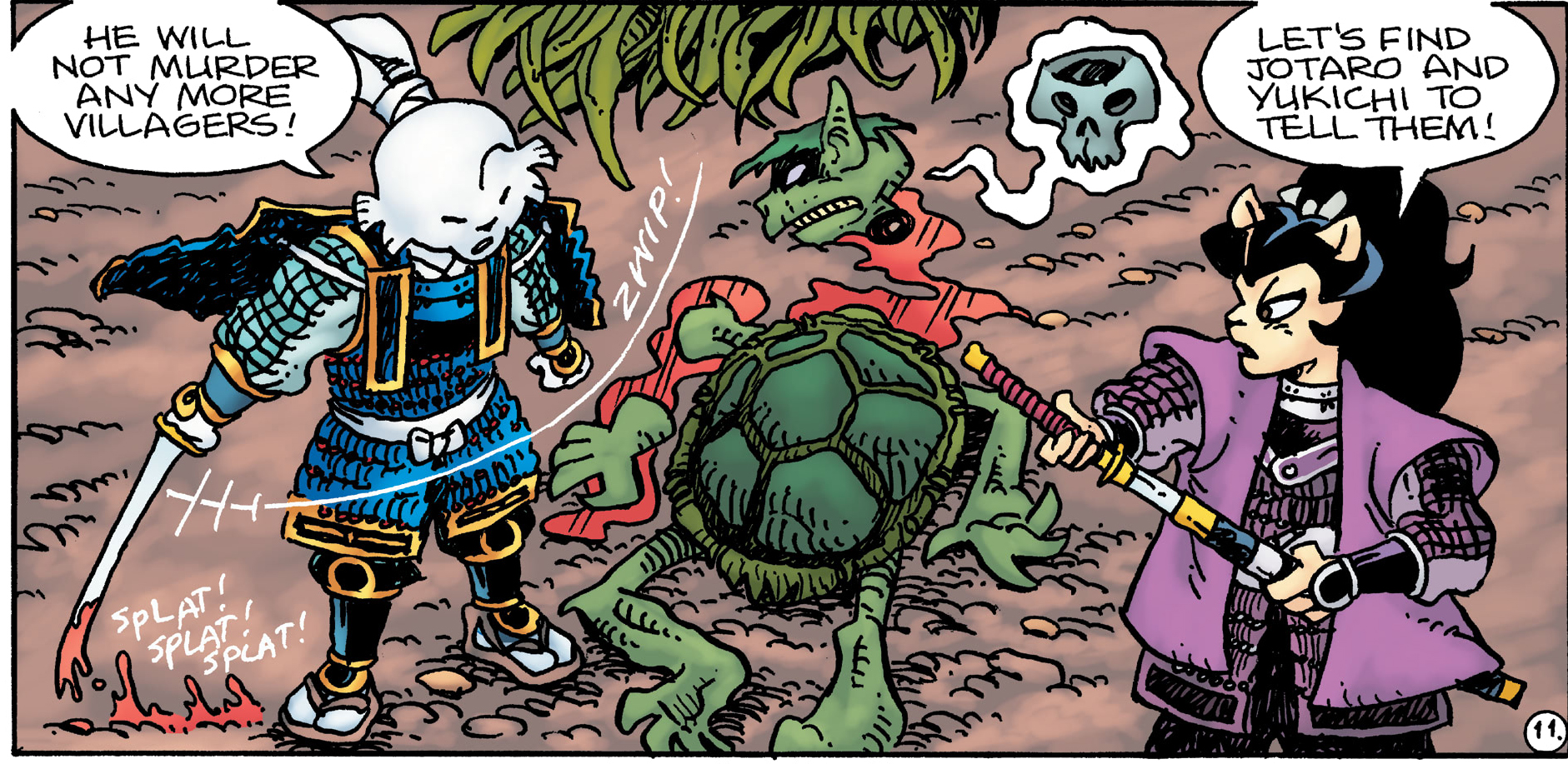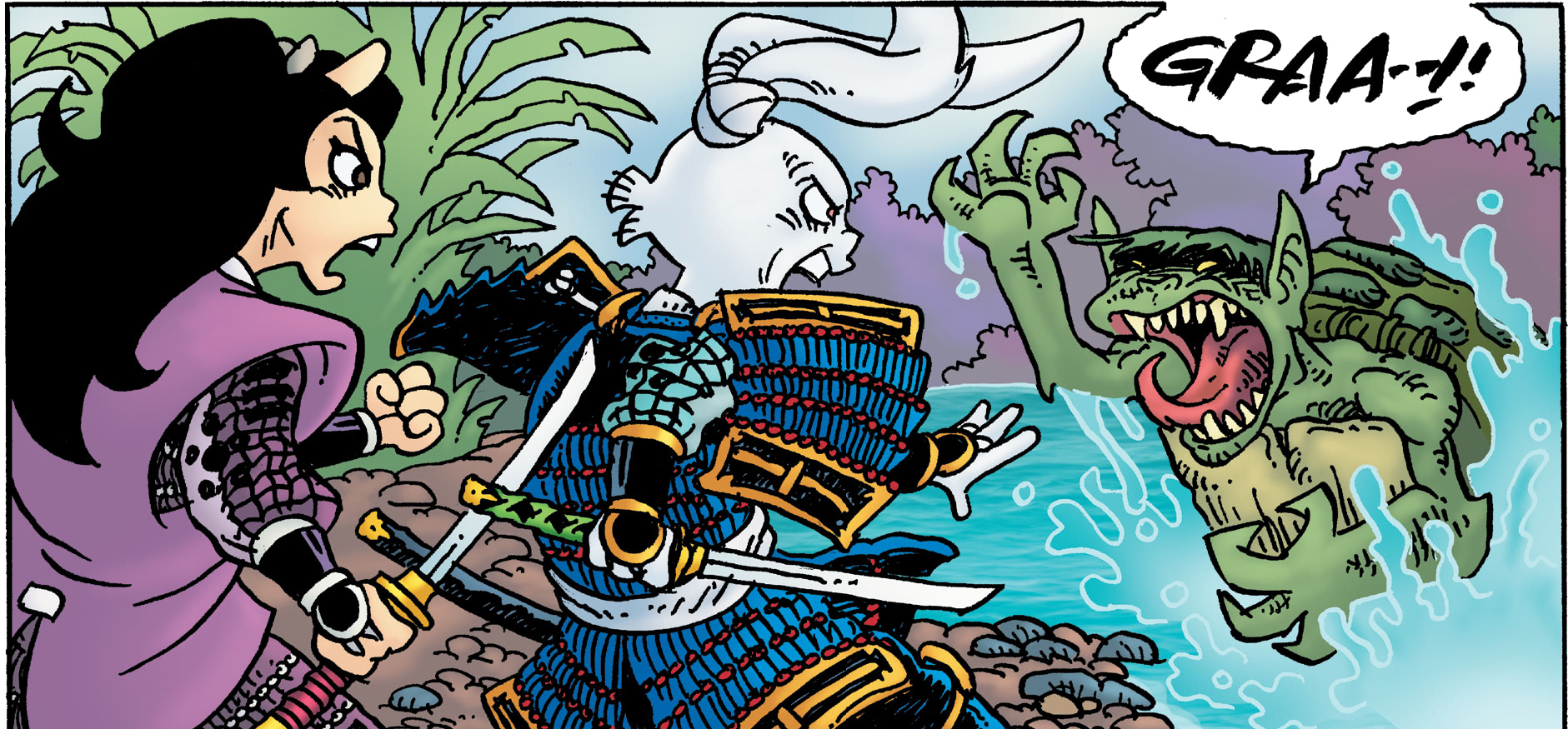 Le cours d’eau était très long. Le territoire du kappa n’était pas bien connu mais l’équipe devrait se séparer afin de couvrir du terrain efficacement avant le coucher du soleil. Tomoe et Usagi remontraient le long de la rivière tandis que les deux autres lapins partiraient en aval. Chemin faisant, la discussion entre le samurai et la douce Tomoe Ame tournait très vite autour de leurs sentiments mutuels, ce qui les mettait mal à l’aise. Gennosuke avait l’air heureux depuis son mariage d’amour. Il n’en était pas de même pour Tomoe, qui avait été mariée à Kubo par intérêt politique. S’en suivit un long silence, brisé par l’arrivée soudaine du kappa tant recherché. La créature bondissait hors de l’eau, griffes sorties. Esquivant ses attaques, les deux guerriers ne tardaient pas à le tailler en morceaux. La flaque qui recouvrait son crâne se déversait au sol, tout comme sa tête, séparée de son cou.